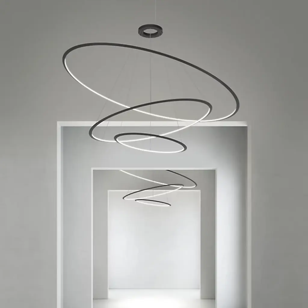 A simple series of shapes brings a vibrant ambiance to a modern space. The Circular LED 3 Tier Chandelier by LedsC4 by Bover features a series of thin concentric rings dropped from a set of thin cables. Each aluminum ring contains an integrated LED strip, seamlessly illuminating like a hovering halo while providing ample illumination. From Benedito Design, this fixture marries architecture, technology, and design to elevate large-scale spaces with minimal materials.