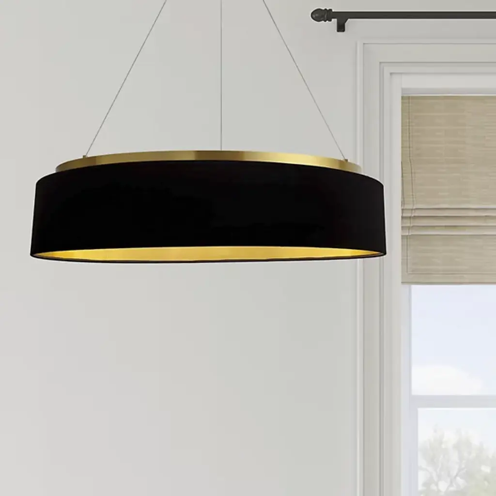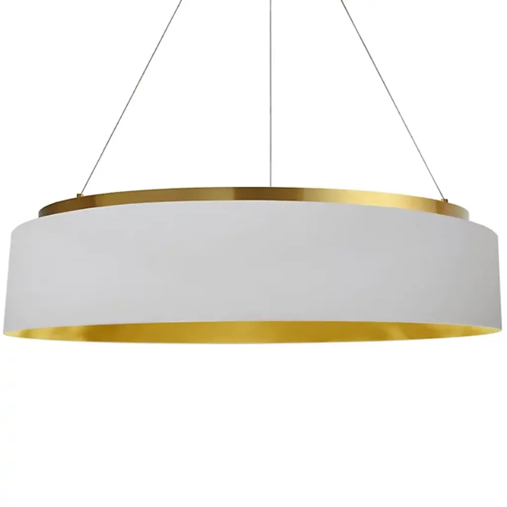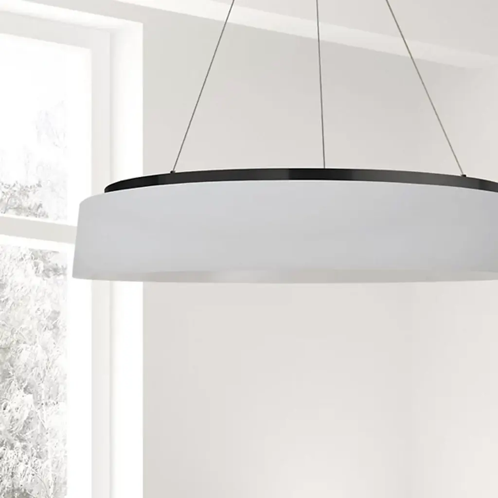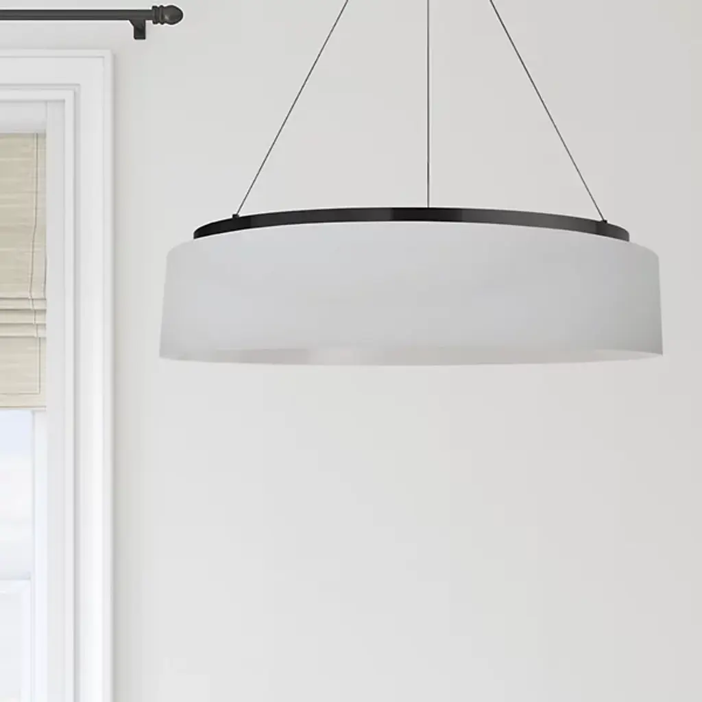 A clean yet soft lighting design for a modern dining area or living room. The Circulo LED Drum Chandelier by Dainolite starts with a metal ring, which includes an acrylic bottom diffuser to even out the light produced by the integrated array of LEDs housed within. A fabric drum shade then clips onto the ring, further diffusing the amount of ambient light and adding to the chandelier’s sense of texture and overall decorative appeal.