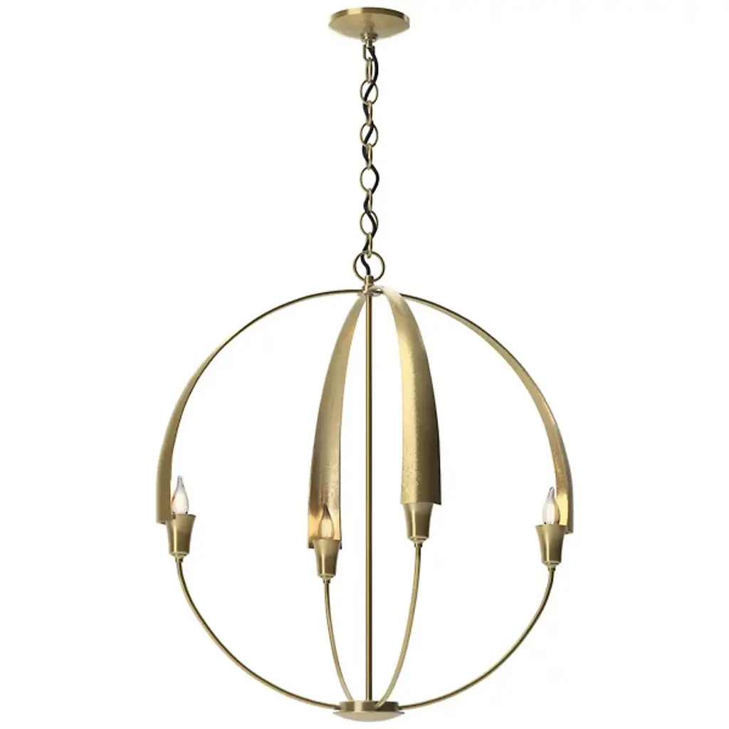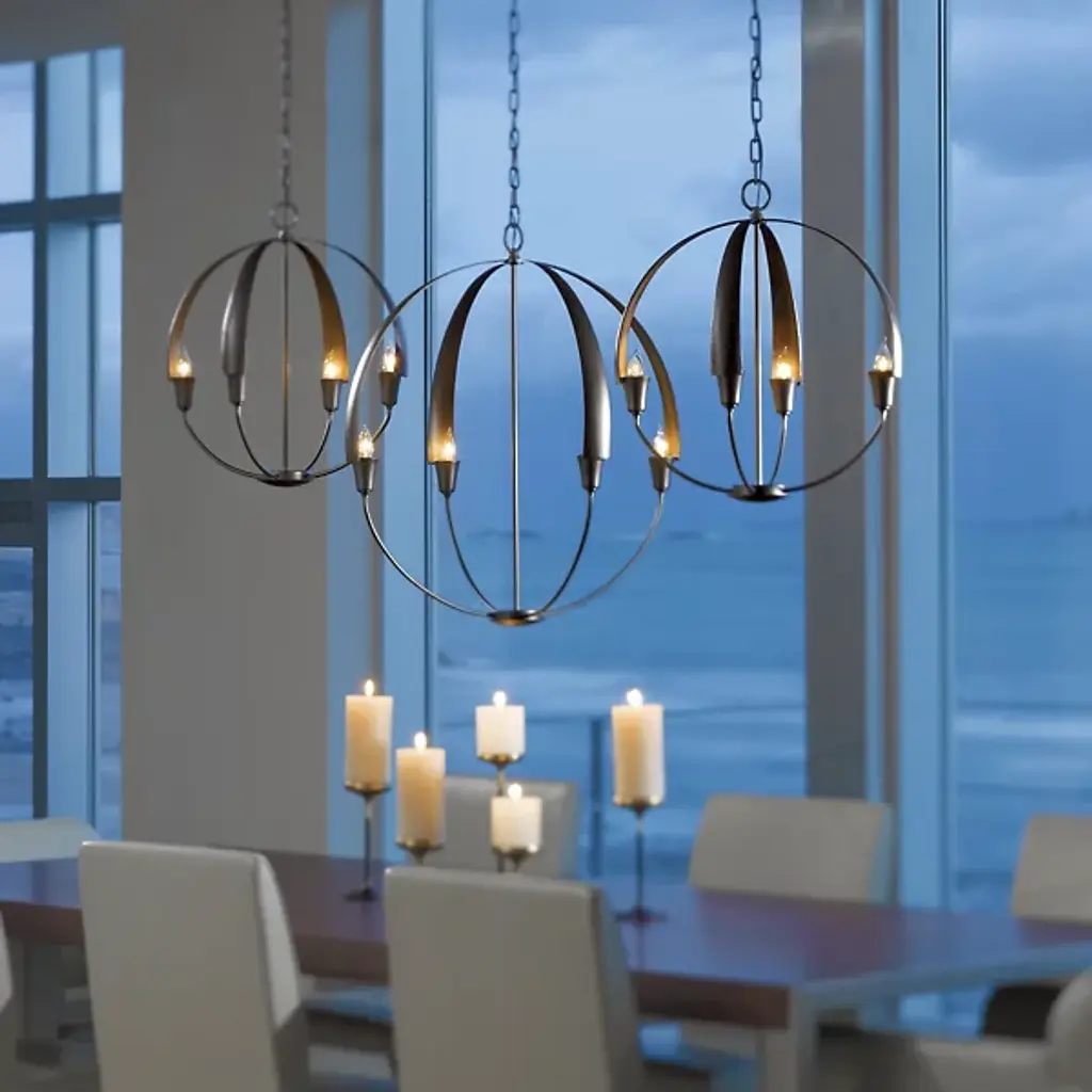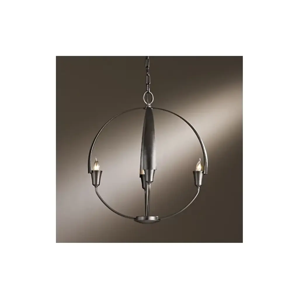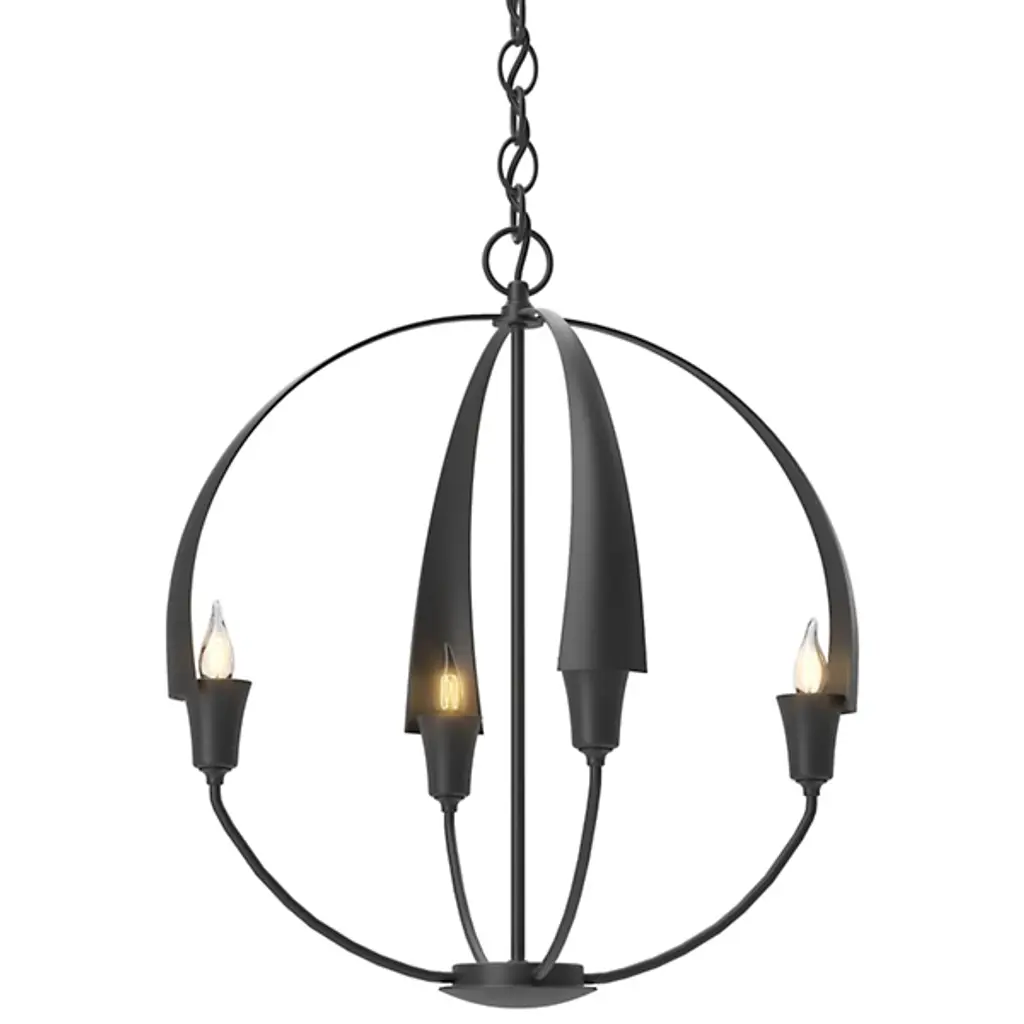 Warmly exuding a Zen-like glow, the Hubbardton Forge Cirque Chandelier is a serene orb of light. Minimally echoing upturned flower petals, a candle-like bulb is found snugly nested at the base of each frond. Lovely as a sculptural focal point, enchanting in multiple settings, the hand-forged iron Cirque is sure to make a statement in any space, including entryways, dining spaces, and foyers. Fixture’s use of multiple circular frameworks allows the piece an air of minimalism and open concepts.