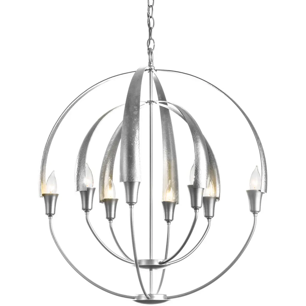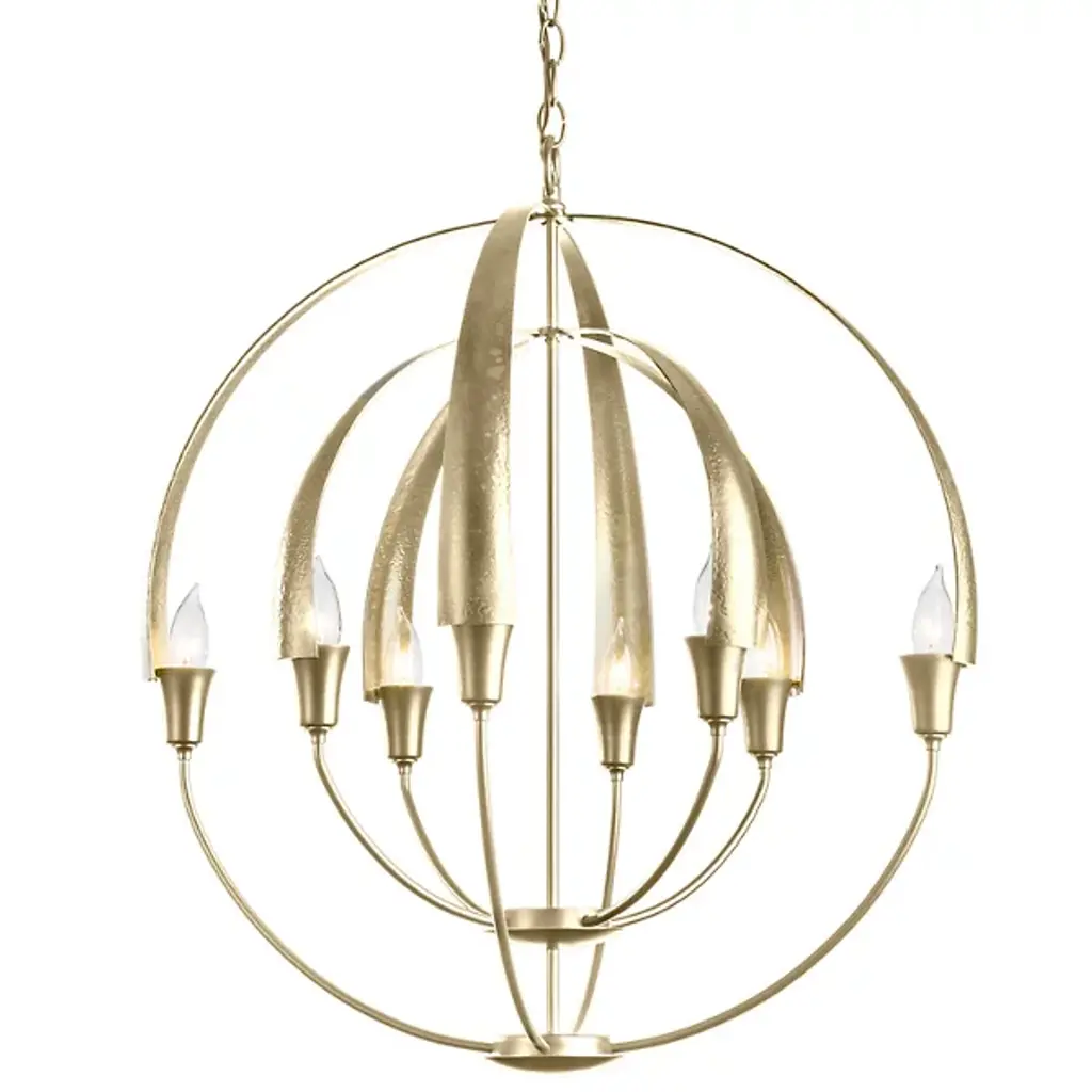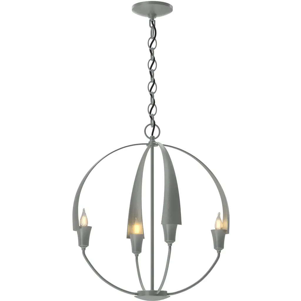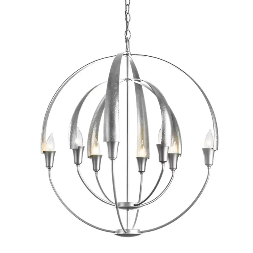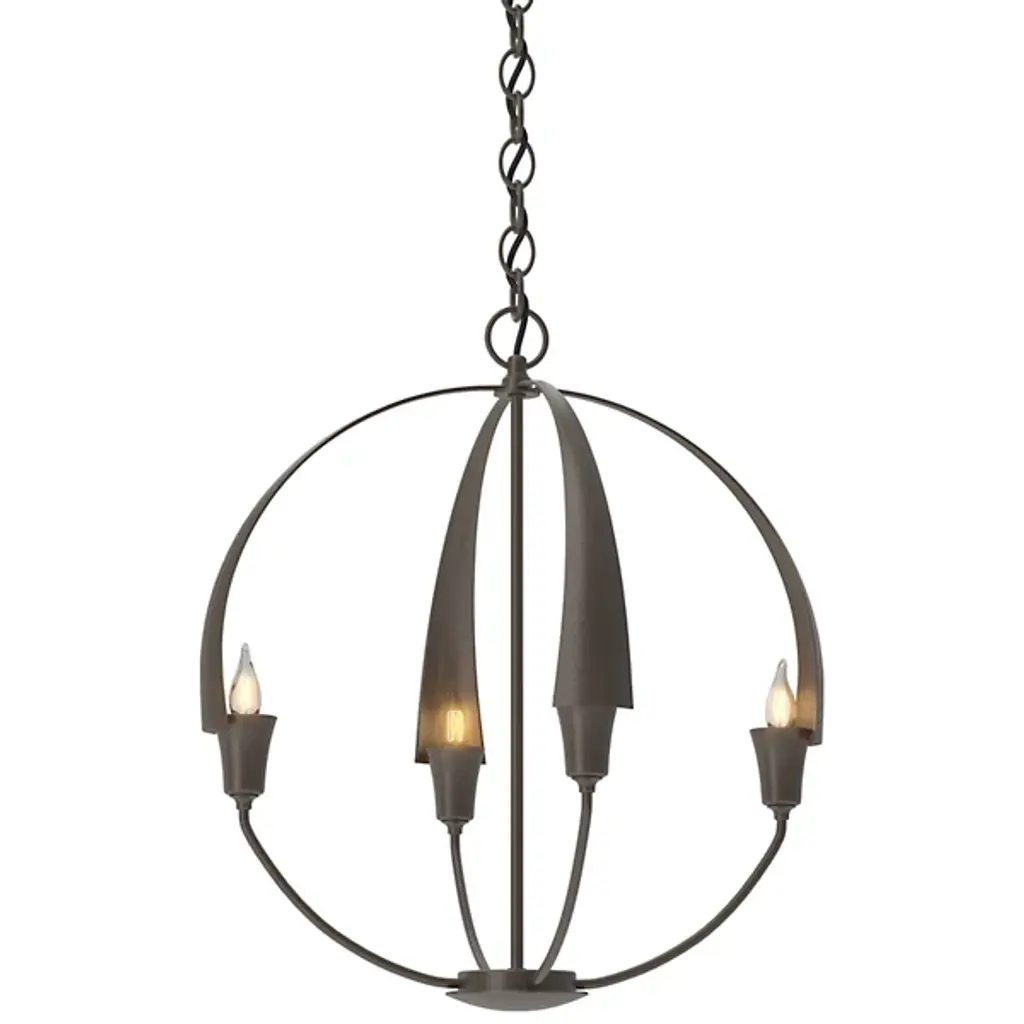 Warmly exuding a Zen-like glow, the Hubbardton Forge Cirque Chandelier is a serene orb of light. Minimally echoing upturned flower petals, a candle-like bulb is found snugly nested at the base of each frond. Lovely as a sculptural focal point, enchanting in multiple settings, the hand-forged iron Cirque is sure to make a statement in any space, including entryways, dining spaces, and foyers. Fixture’s use of multiple circular frameworks allows the piece an air of minimalism and open concepts.