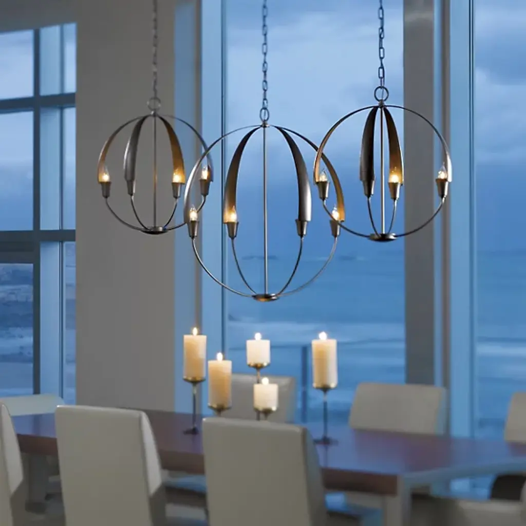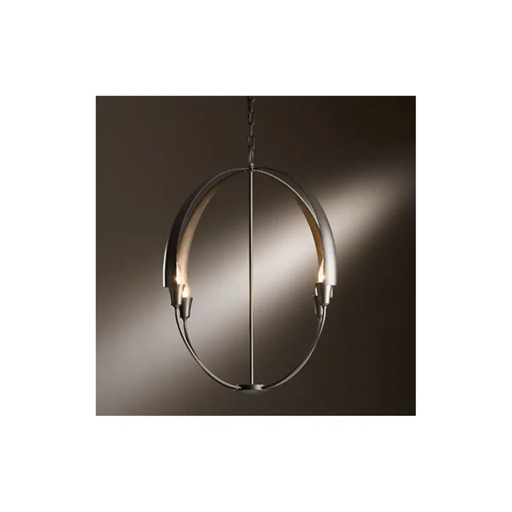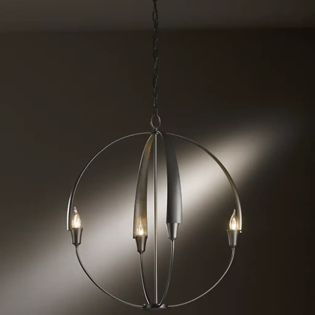 Warmly exuding a Zen-like glow, the Hubbardton Forge Cirque Chandelier is a serene orb of light. Minimally echoing upturned flower petals, a candle-like bulb is found snugly nested at the base of each frond. Lovely as a sculptural focal point, enchanting in multiple settings, the hand-forged iron Cirque is sure to make a statement in any space, including entryways, dining spaces, and foyers. Fixture’s use of multiple circular frameworks allows the piece an air of minimalism and open concepts.