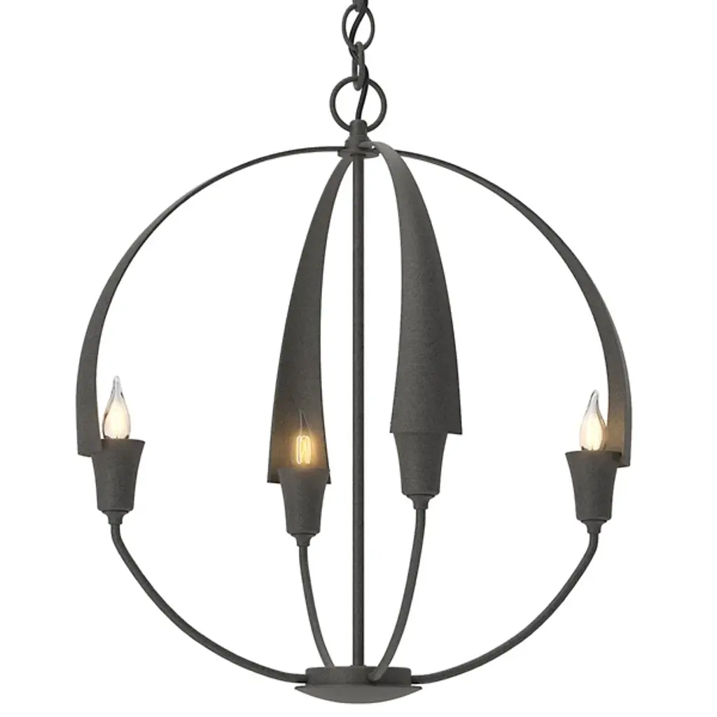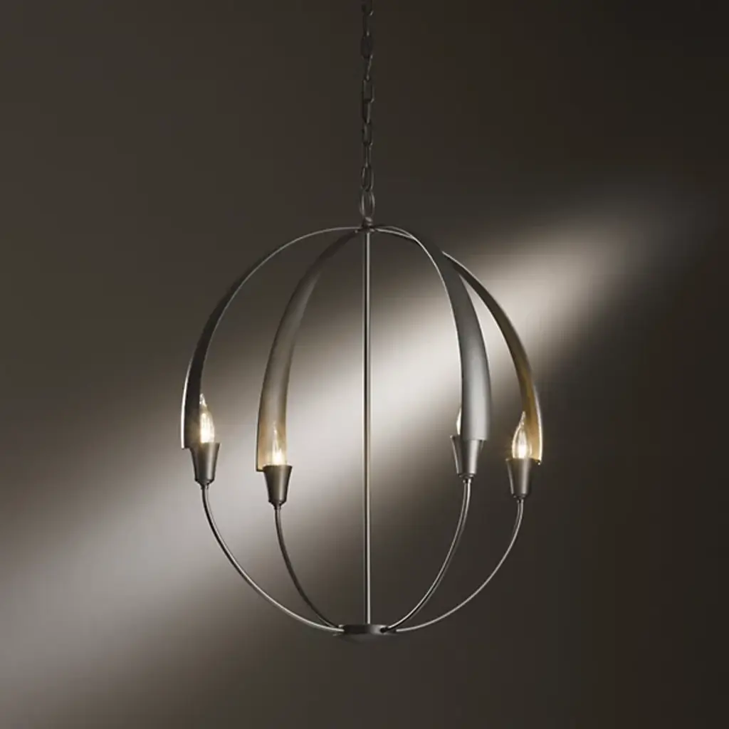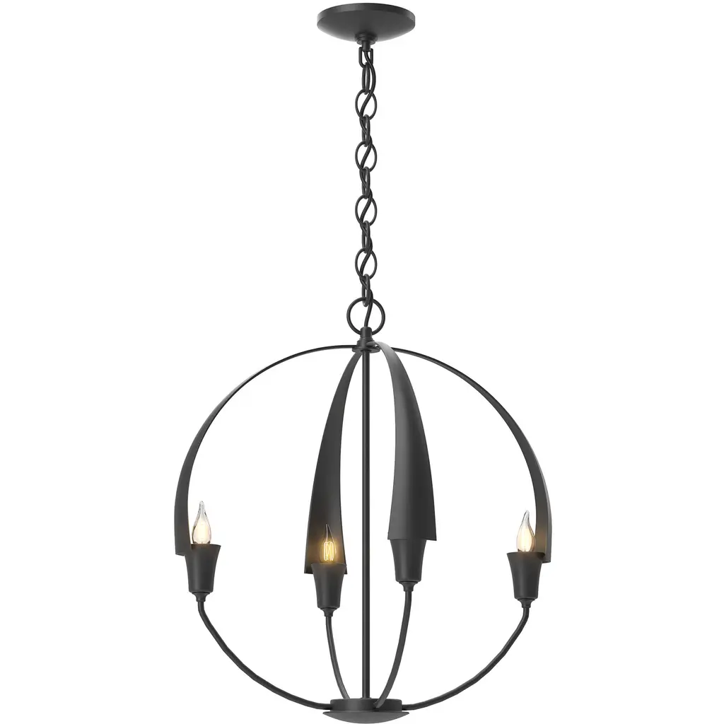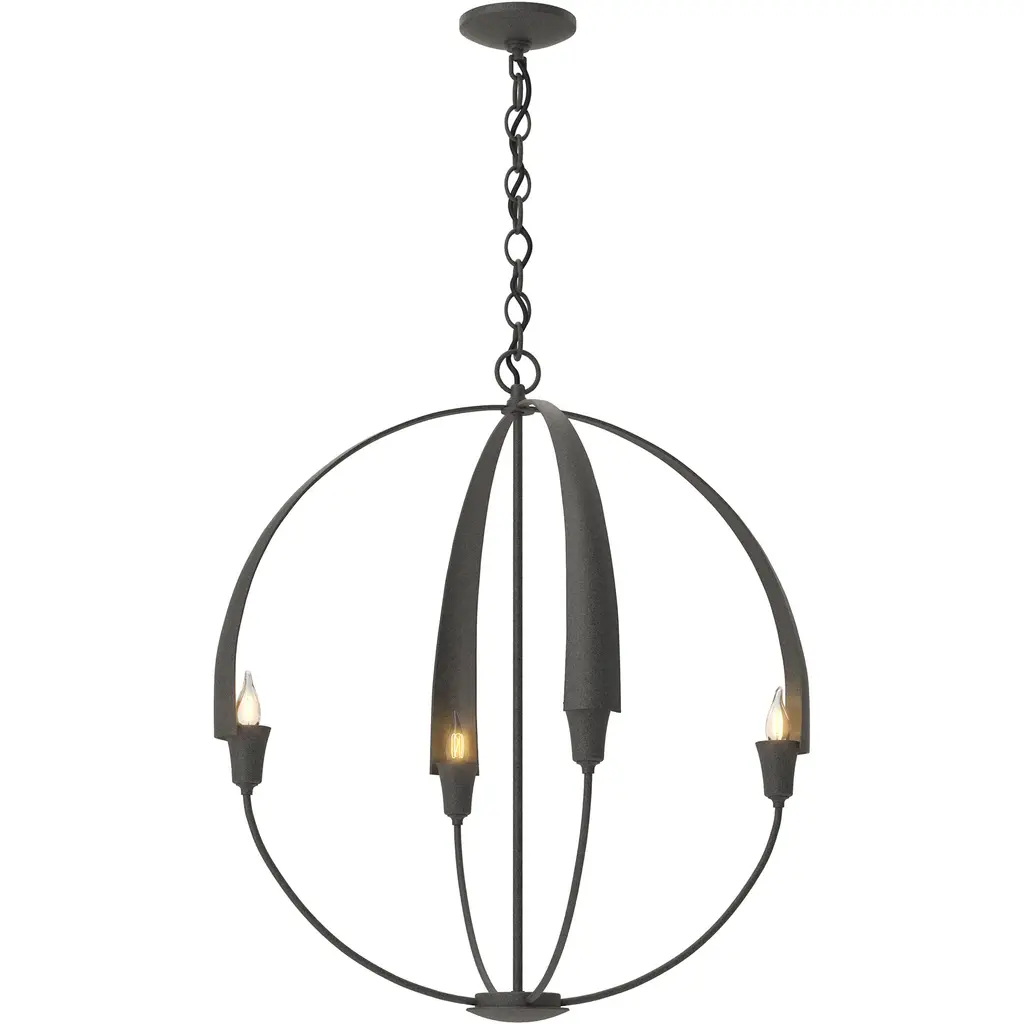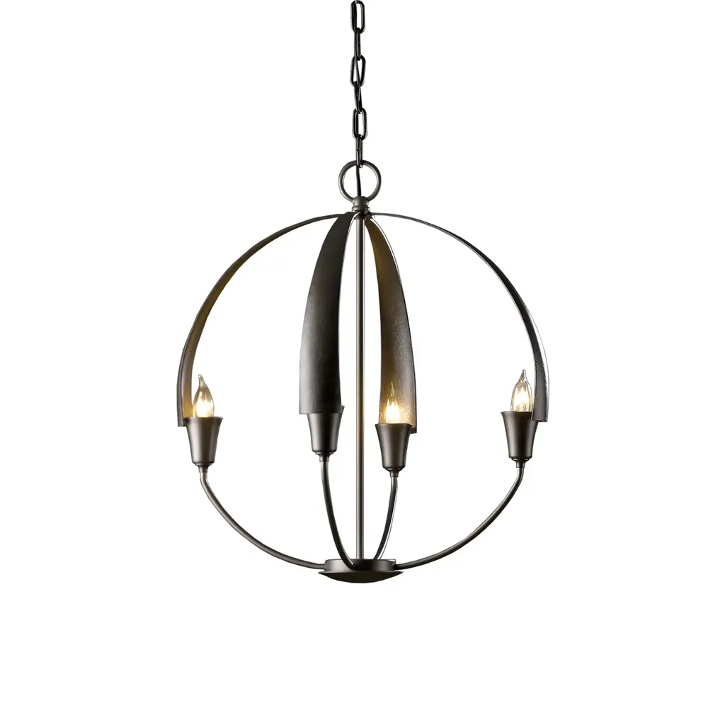 Warmly exuding a Zen-like glow, the Hubbardton Forge Cirque Chandelier is a serene orb of light. Minimally echoing upturned flower petals, a candle-like bulb is found snugly nested at the base of each frond. Lovely as a sculptural focal point, enchanting in multiple settings, the hand-forged iron Cirque is sure to make a statement in any space, including entryways, dining spaces, and foyers. Fixture’s use of multiple circular frameworks allows the piece an air of minimalism and open concepts.
