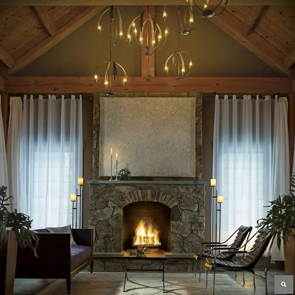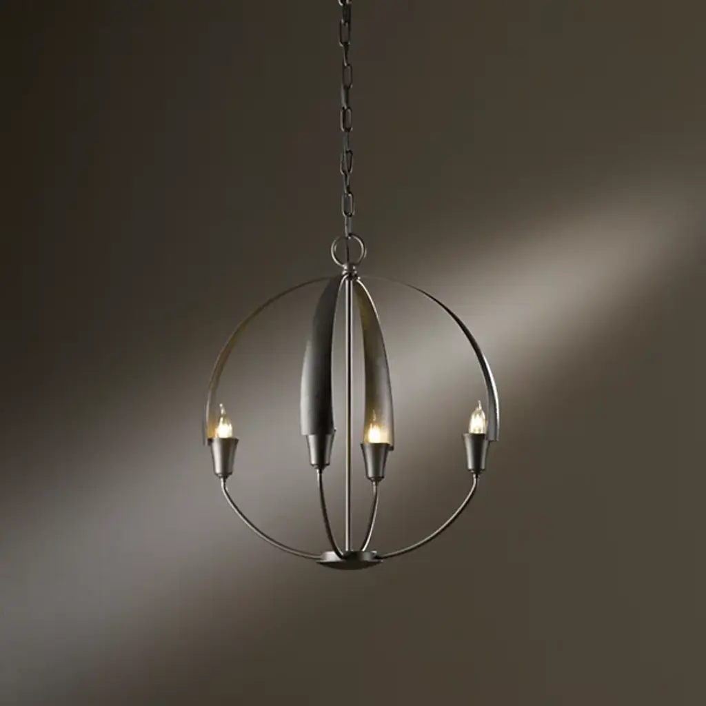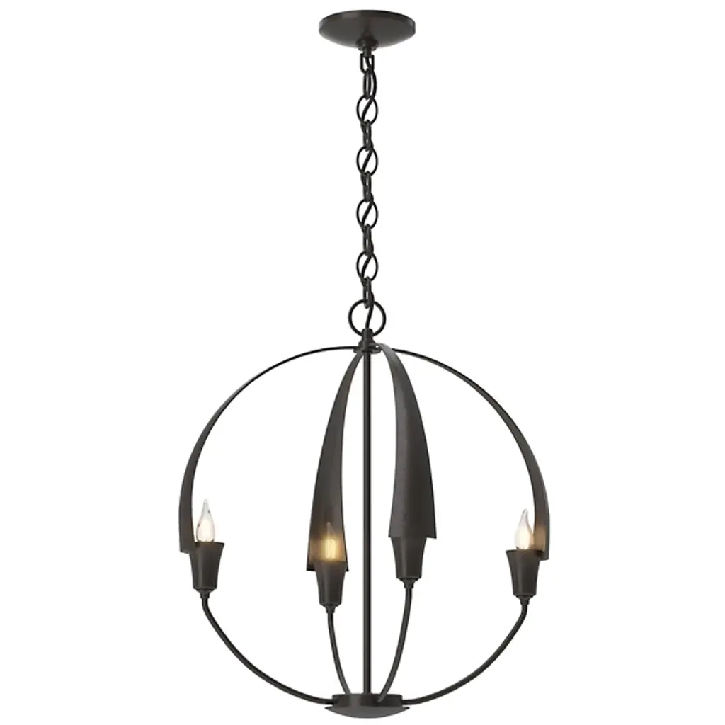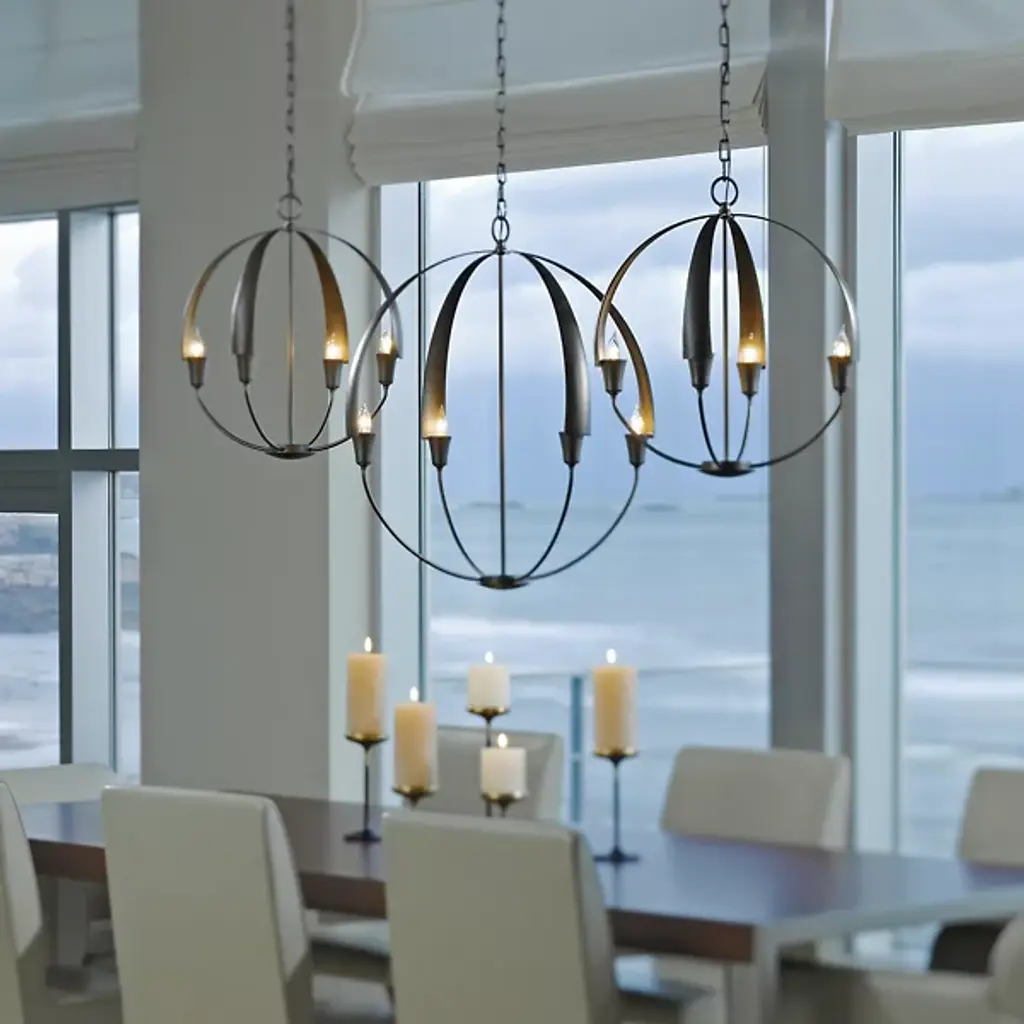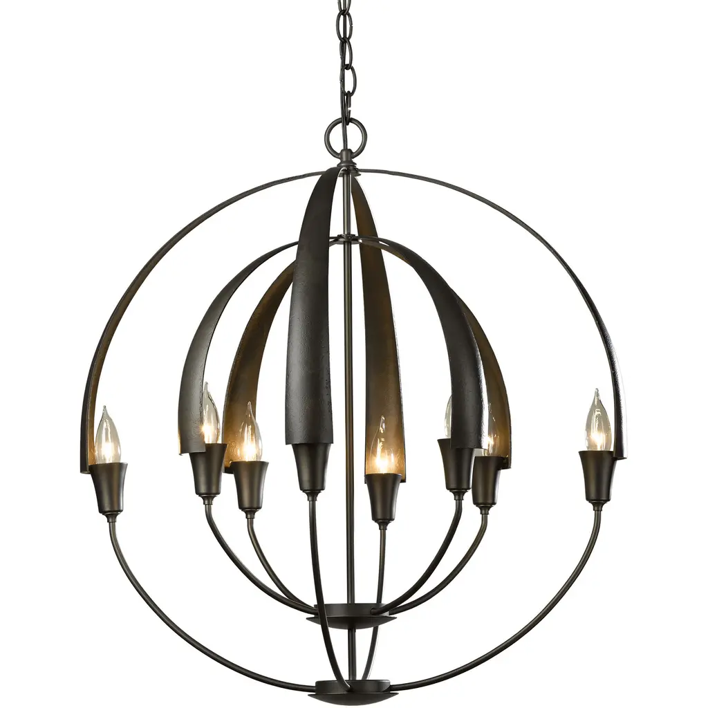 Warmly exuding a Zen-like glow, the Hubbardton Forge Cirque Chandelier is a serene orb of light. Minimally echoing upturned flower petals, a candle-like bulb is found snugly nested at the base of each frond. Lovely as a sculptural focal point, enchanting in multiple settings, the hand-forged iron Cirque is sure to make a statement in any space, including entryways, dining spaces, and foyers. Fixture’s use of multiple circular frameworks allows the piece an air of minimalism and open concepts.