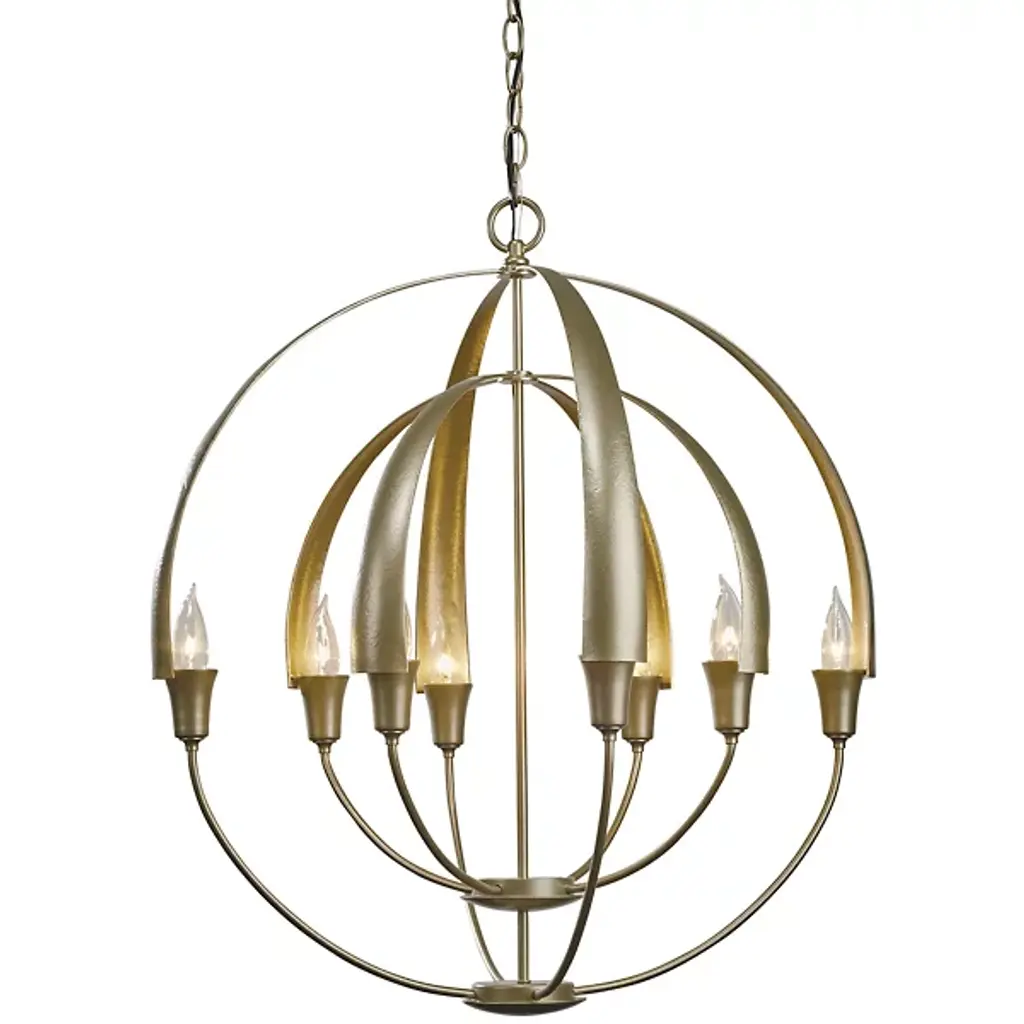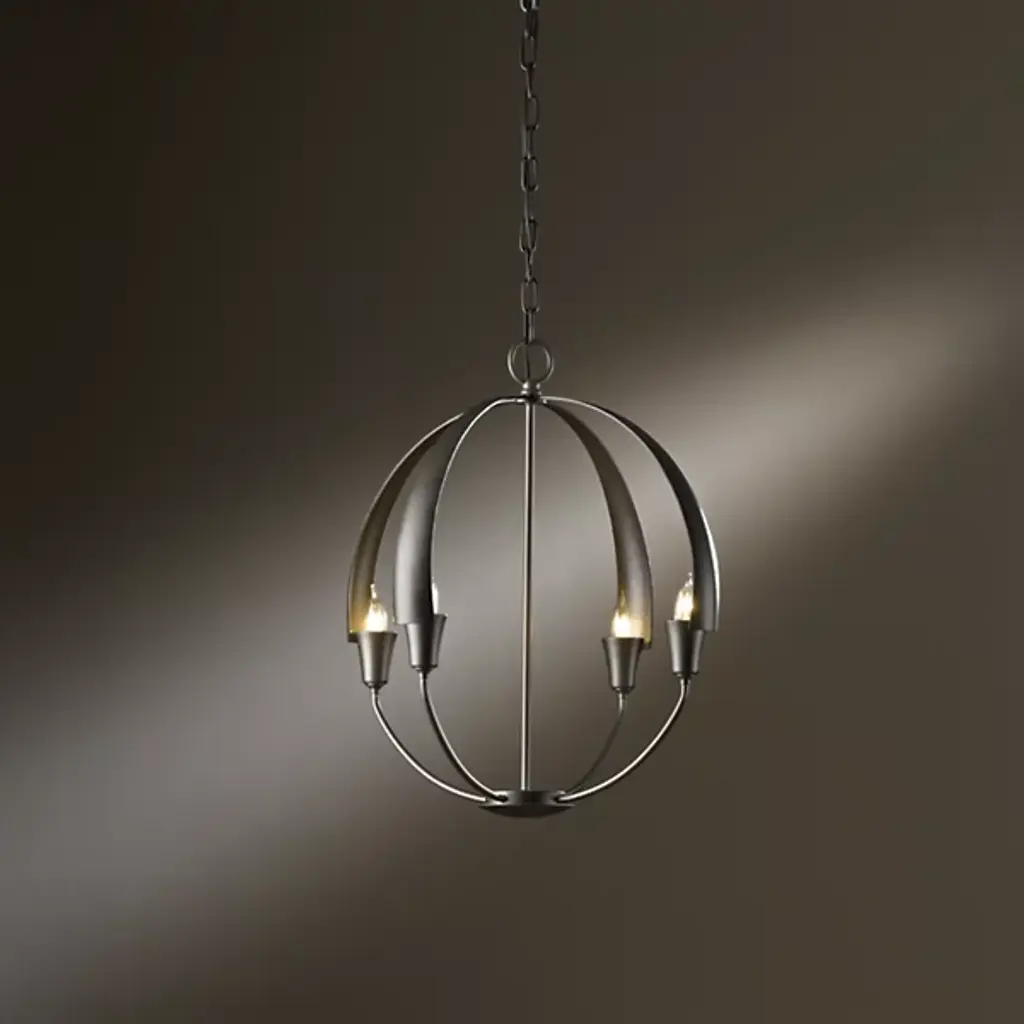Warmly exuding a Zen-like glow, the Hubbardton Forge Cirque Chandelier is a serene orb of light. Minimally echoing upturned flower petals, a candle-like bulb is found snugly nested at the base of each frond. Lovely as a sculptural focal point, enchanting in multiple settings, the hand-forged iron Cirque is sure to make a statement in any space, including entryways, dining spaces, and foyers. Fixture’s use of multiple circular frameworks allows the piece an air of minimalism and open concepts.