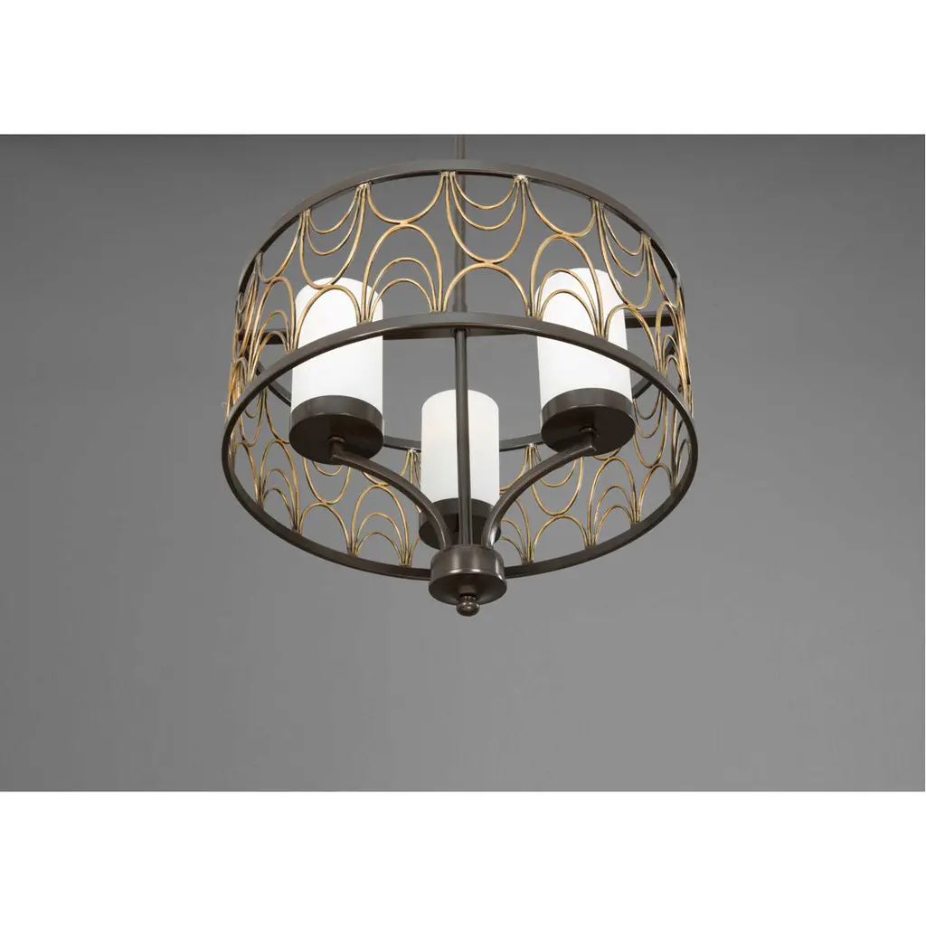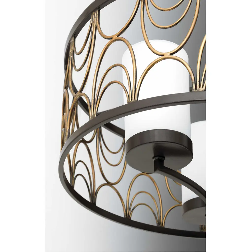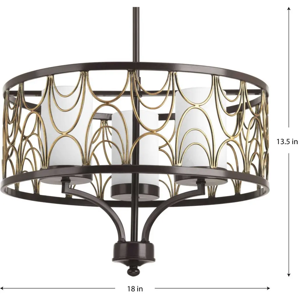 The three-light chandelier in the Cirrine collection appeals to the creative spirit within all of us. Hand formed arching elements are highlighted by an artistic painted finish that feathers from a rich bronze tone to a vintage brass accent. Etched white glass complements the artistic frame.