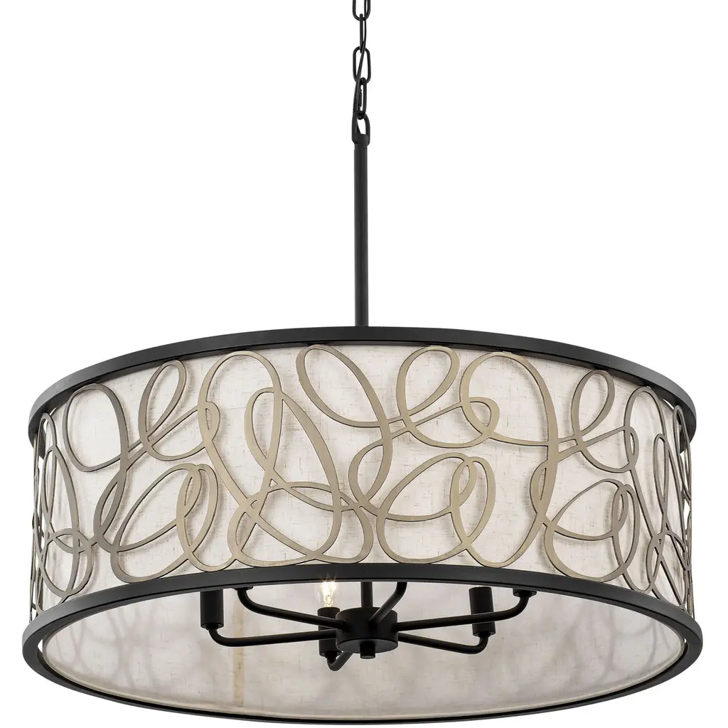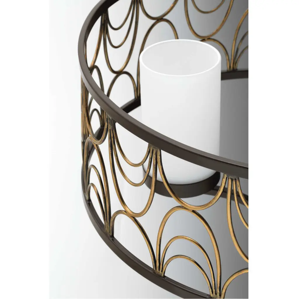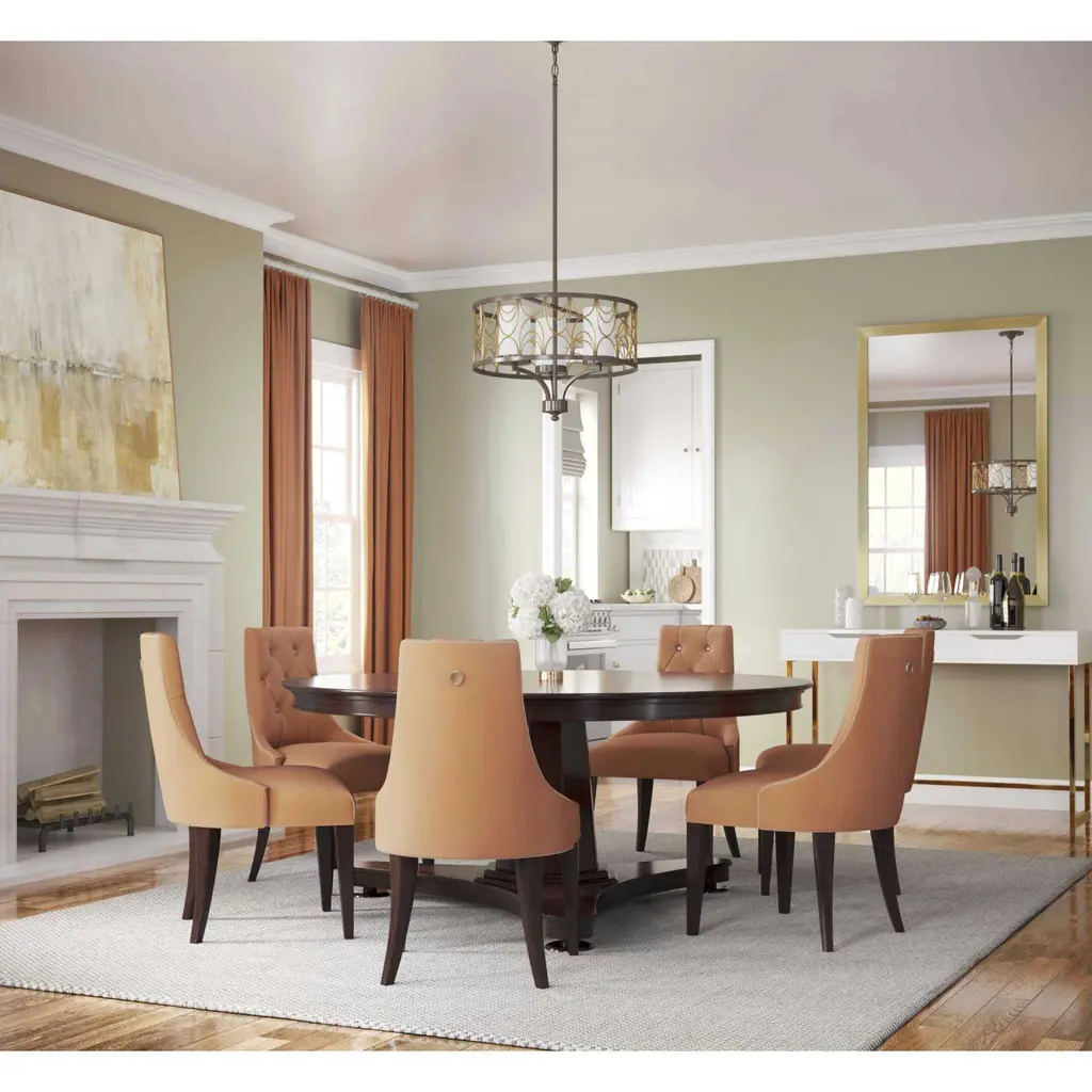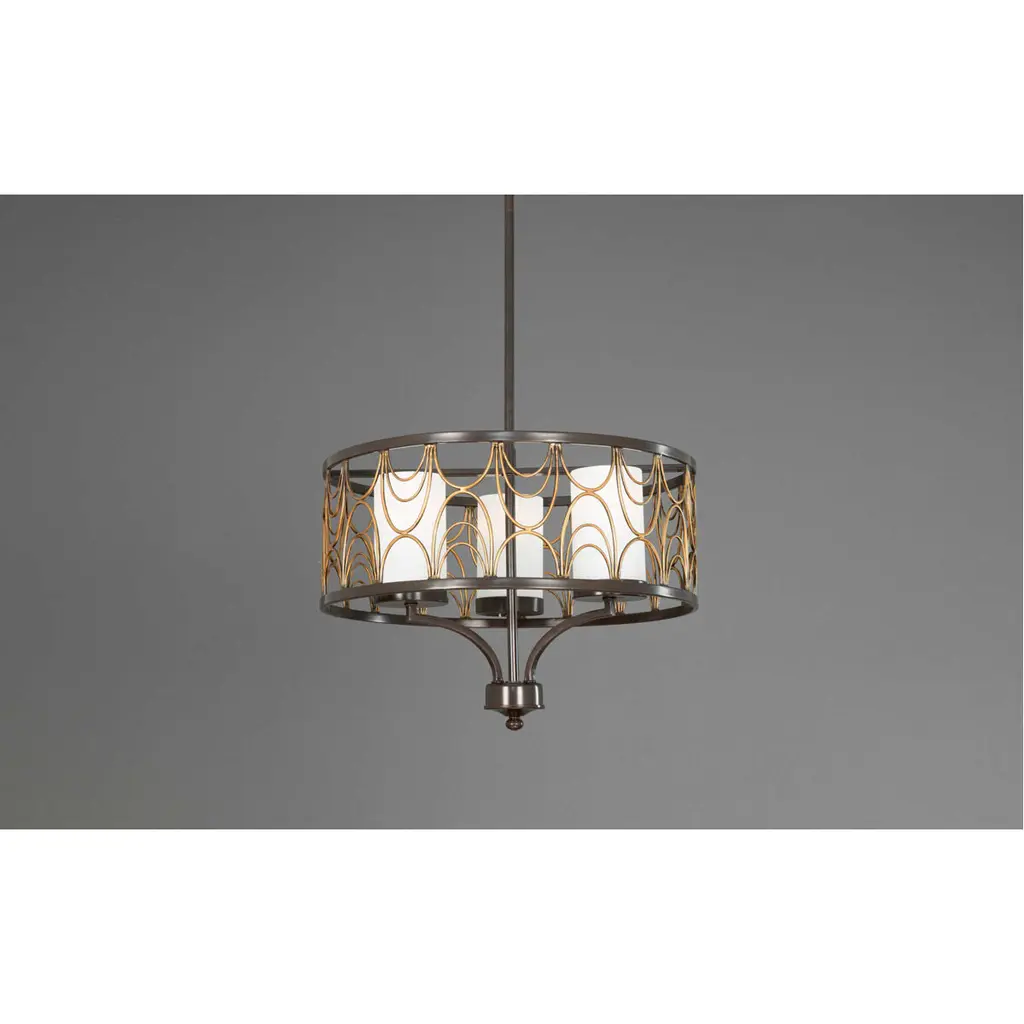 The three-light chandelier in the Cirrine collection appeals to the creative spirit within all of us. Hand formed arching elements are highlighted by an artistic painted finish that feathers from a rich bronze tone to a vintage brass accent. Etched white glass complements the artistic frame.