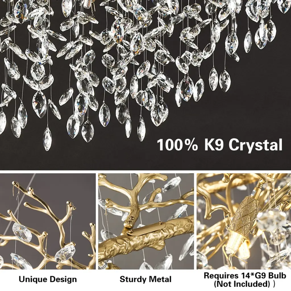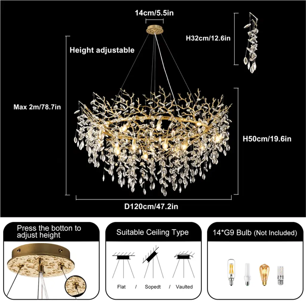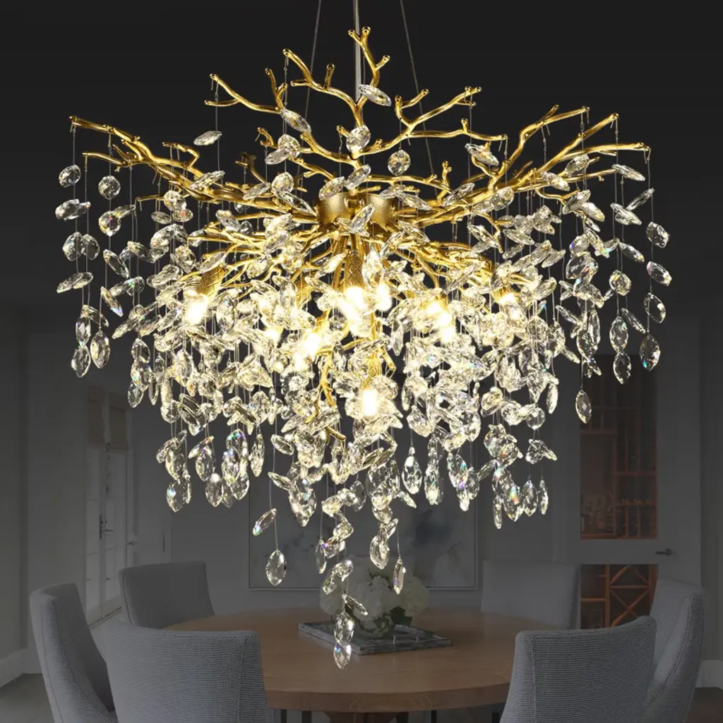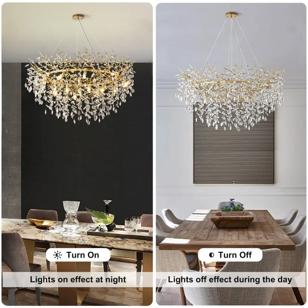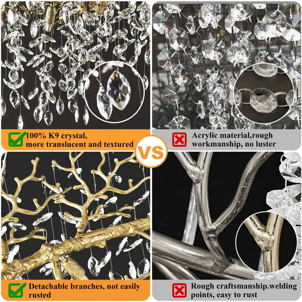 This breathtaking chandelier masterfully combines organic elegance with luxurious sparkle. The pendant light features metal tree branch frame and is adorned with hundreds of premium K9 crystals that dance with light. The durable aluminum frame resists tarnishing while the adjustable hanging chain ensures perfect placement in any space.