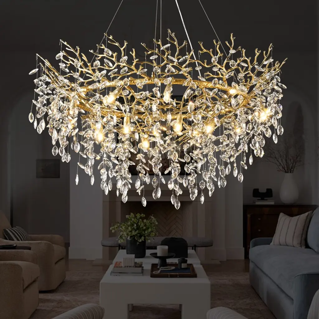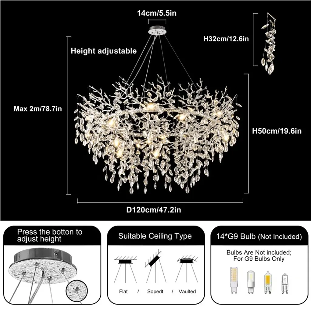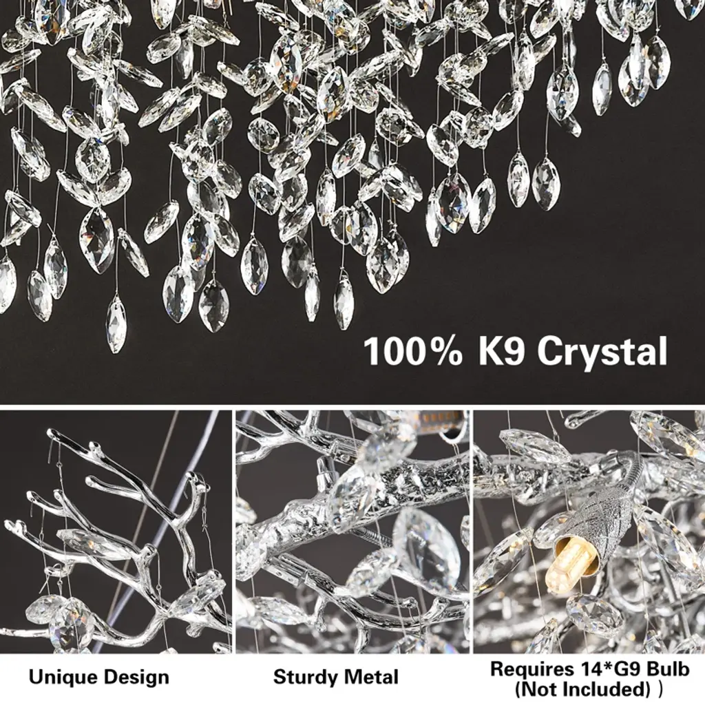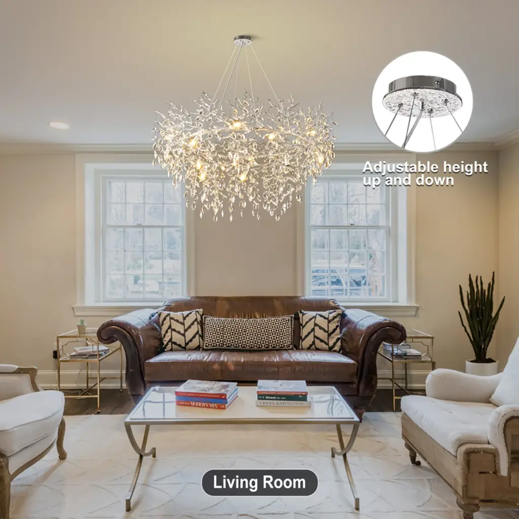 This breathtaking chandelier masterfully combines organic elegance with luxurious sparkle. The pendant light features metal tree branch frame and is adorned with hundreds of premium K9 crystals that dance with light. The durable aluminum frame resists tarnishing while the adjustable hanging chain ensures perfect placement in any space.