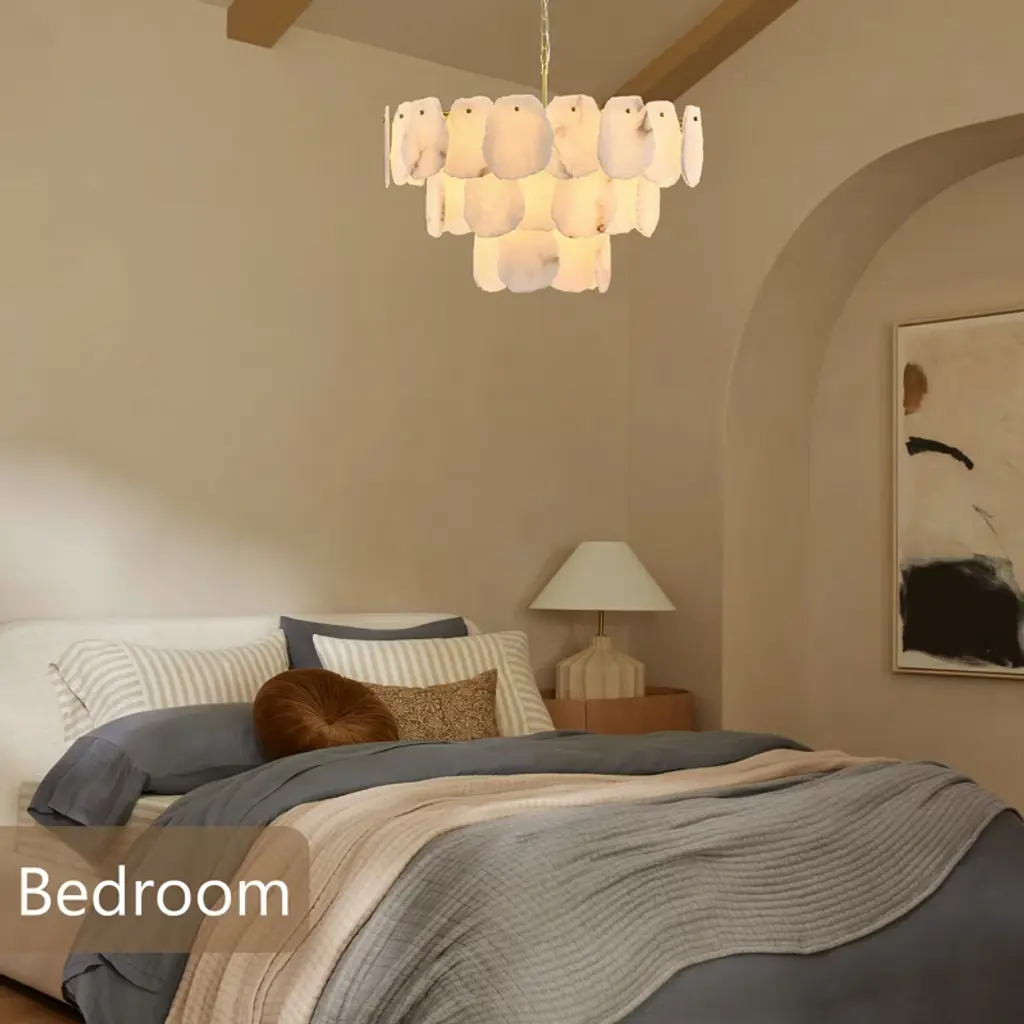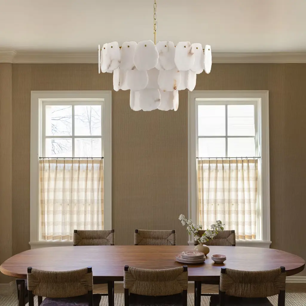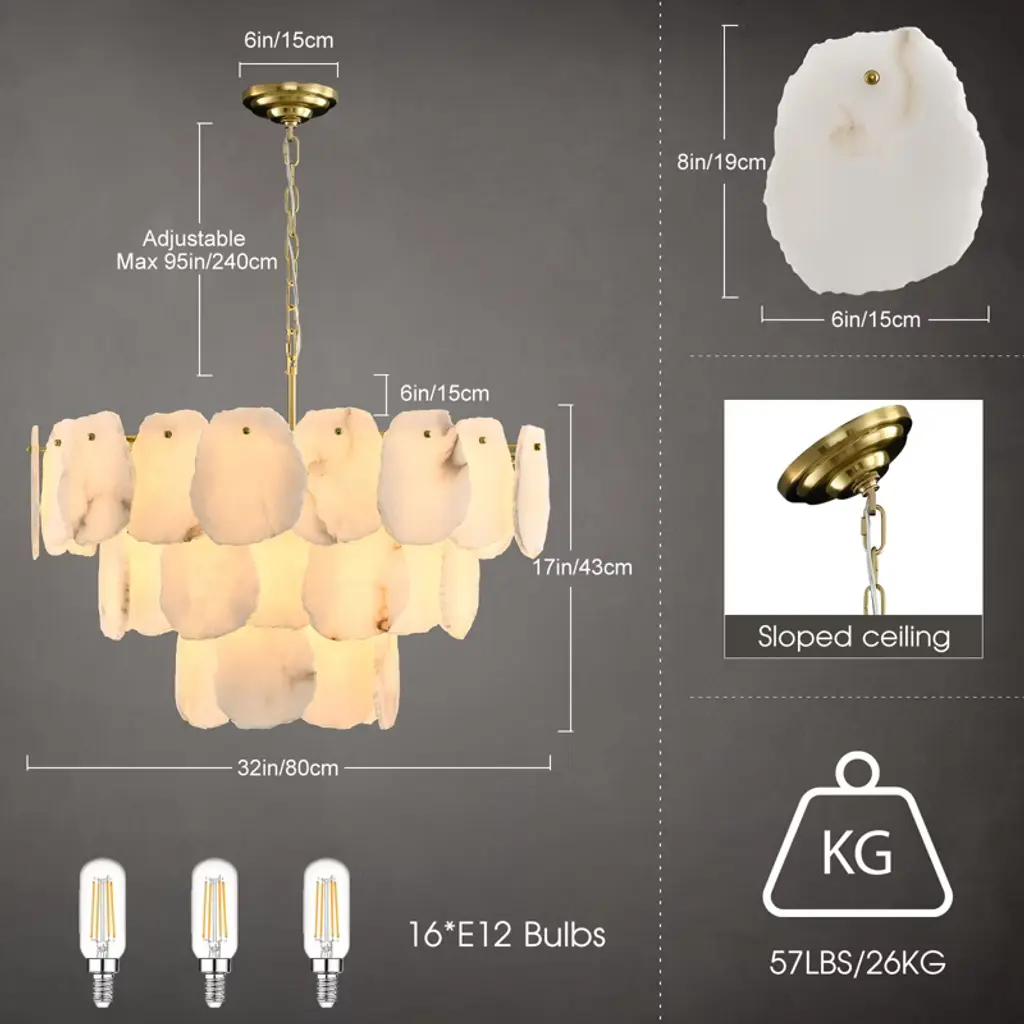With tiers of geometric alabaster pieces tied to the premium metal frame, this striking chandelier exudes sophistication and adds an artistic flair to any room in your home. The natural alabaster casting a warm and soft glow in your space and creating a captivating visual effect. With its timeless charm, this pendant light brightens up dining rooms, bedrooms, living rooms, kitchen islands, hallways, foyers, offices, and more. Note: We use alabaster pieces of our product made with natural material, so there will be some natural traces on the shade. We want to keep the best natural style for you. If you mind the trace, please pay attention to this.