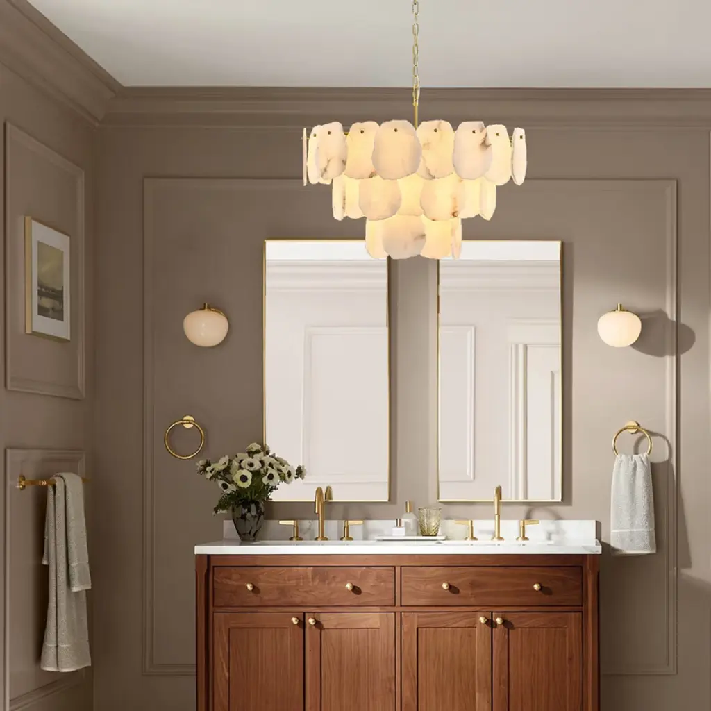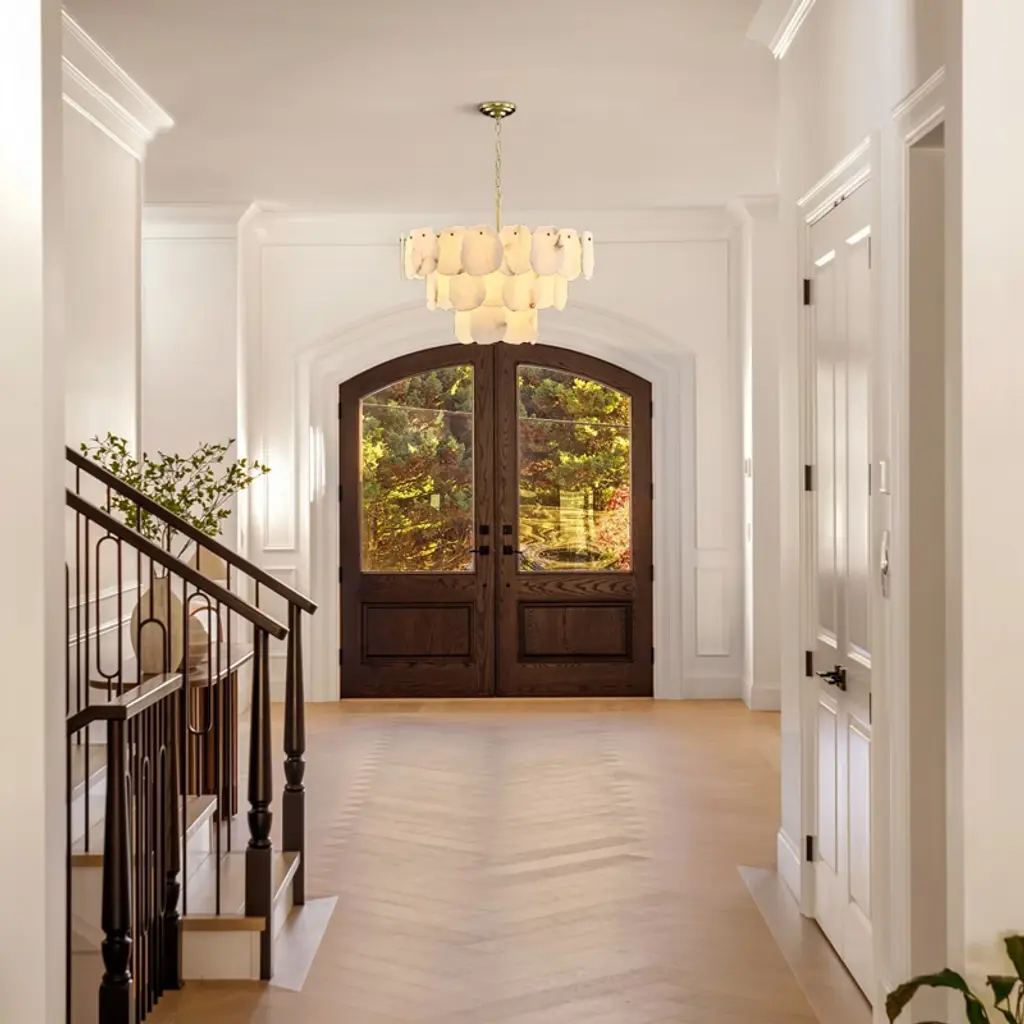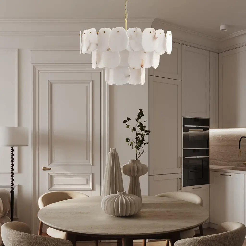 With tiers of geometric alabaster pieces tied to the premium metal frame, this striking chandelier exudes sophistication and adds an artistic flair to any room in your home. The natural alabaster casting a warm and soft glow in your space and creating a captivating visual effect. With its timeless charm, this pendant light brightens up dining rooms, bedrooms, living rooms, kitchen islands, hallways, foyers, offices, and more. Note: We use alabaster pieces of our product made with natural material, so there will be some natural traces on the shade. We want to keep the best natural style for you. If you mind the trace, please pay attention to this.
