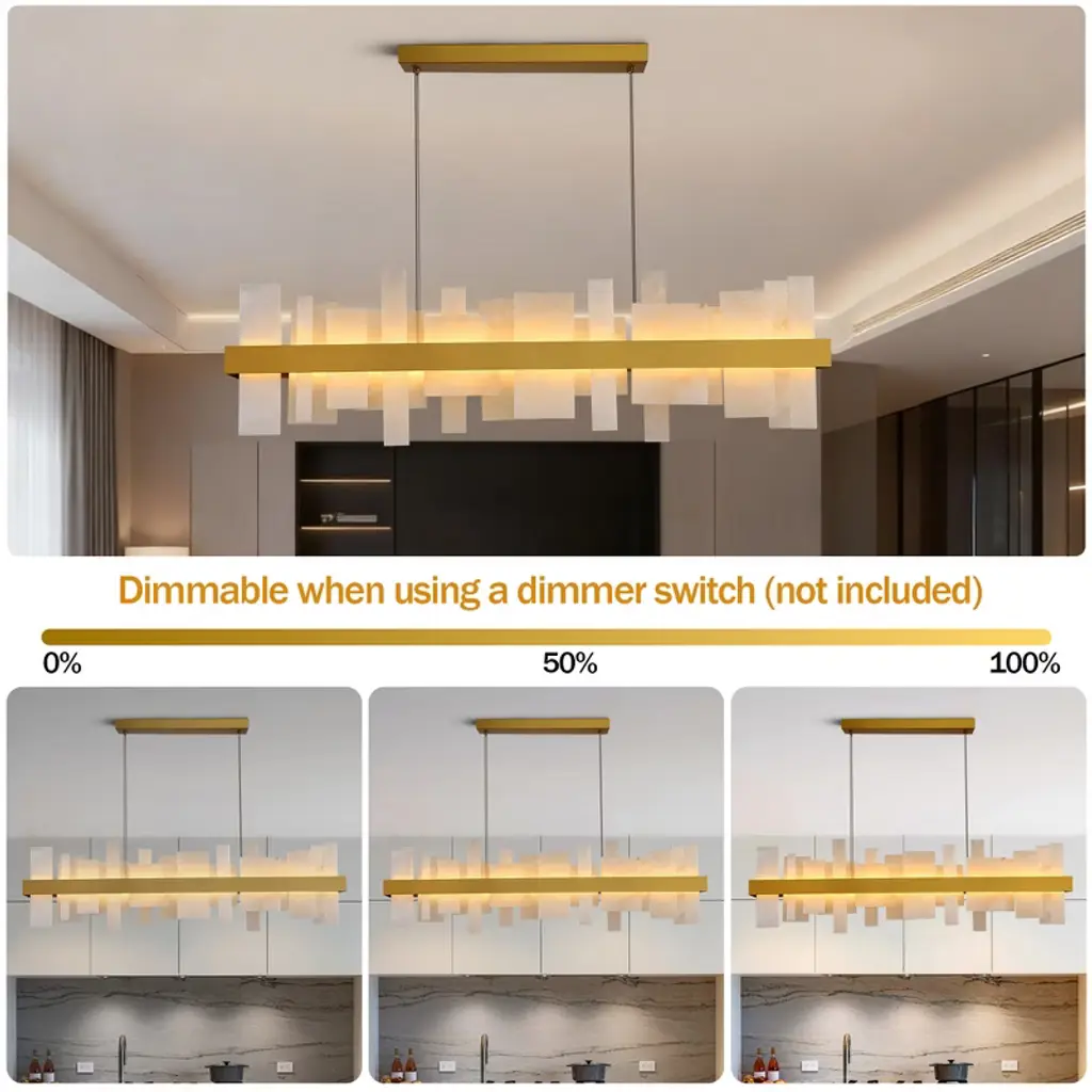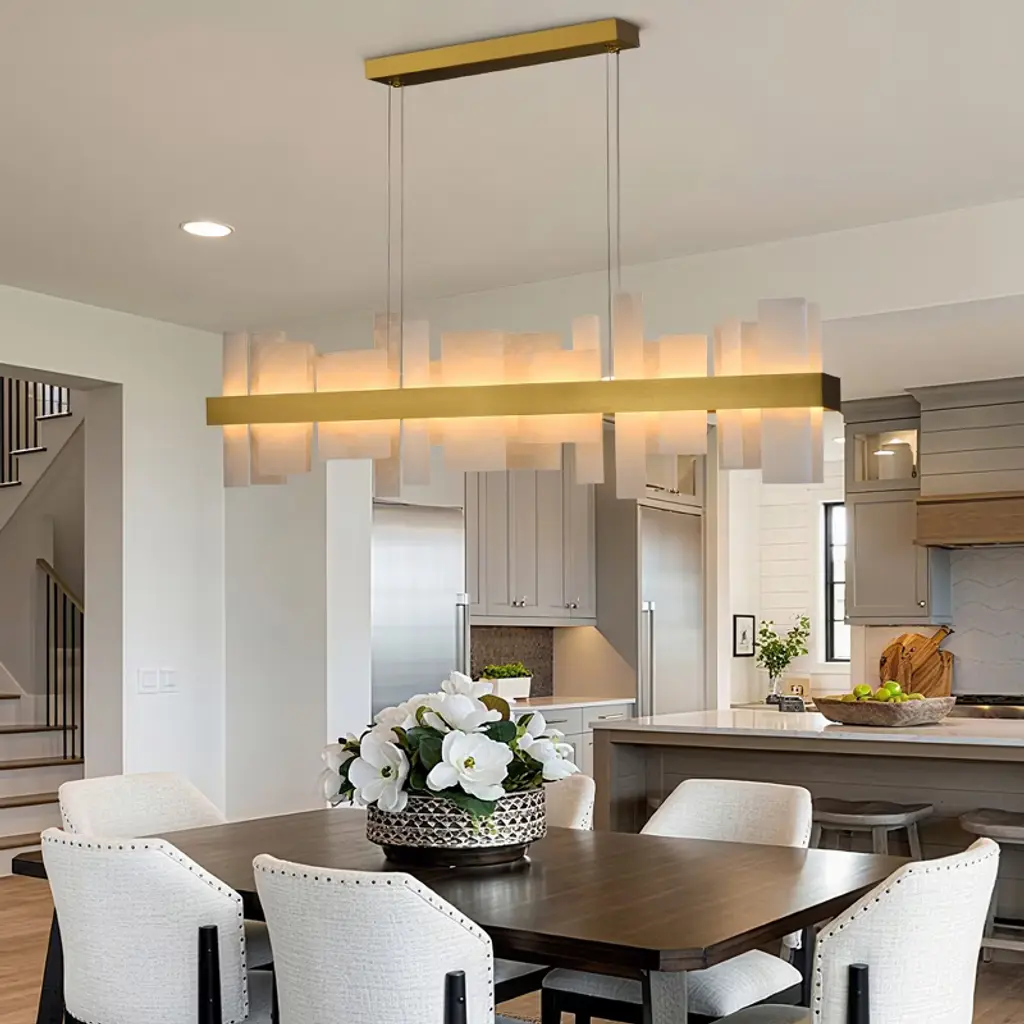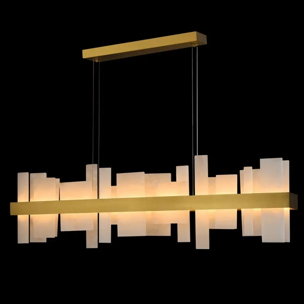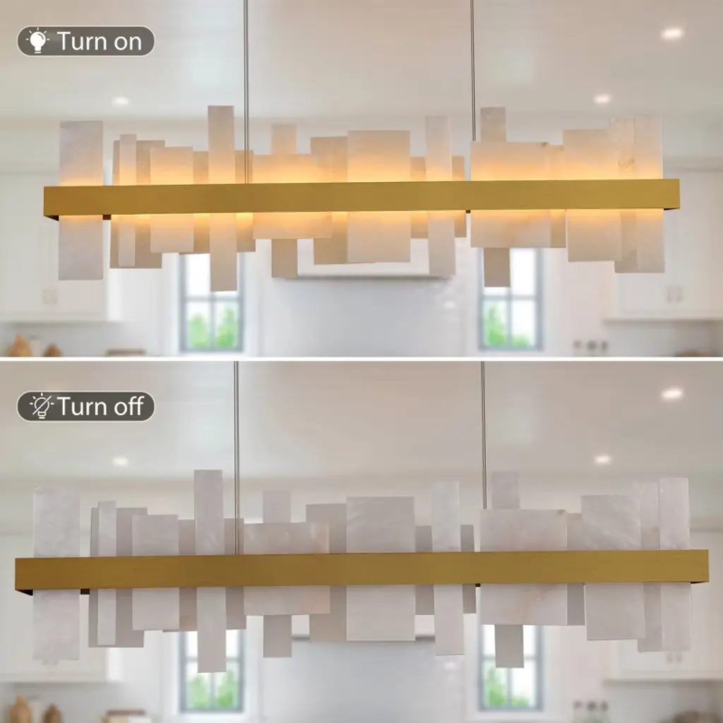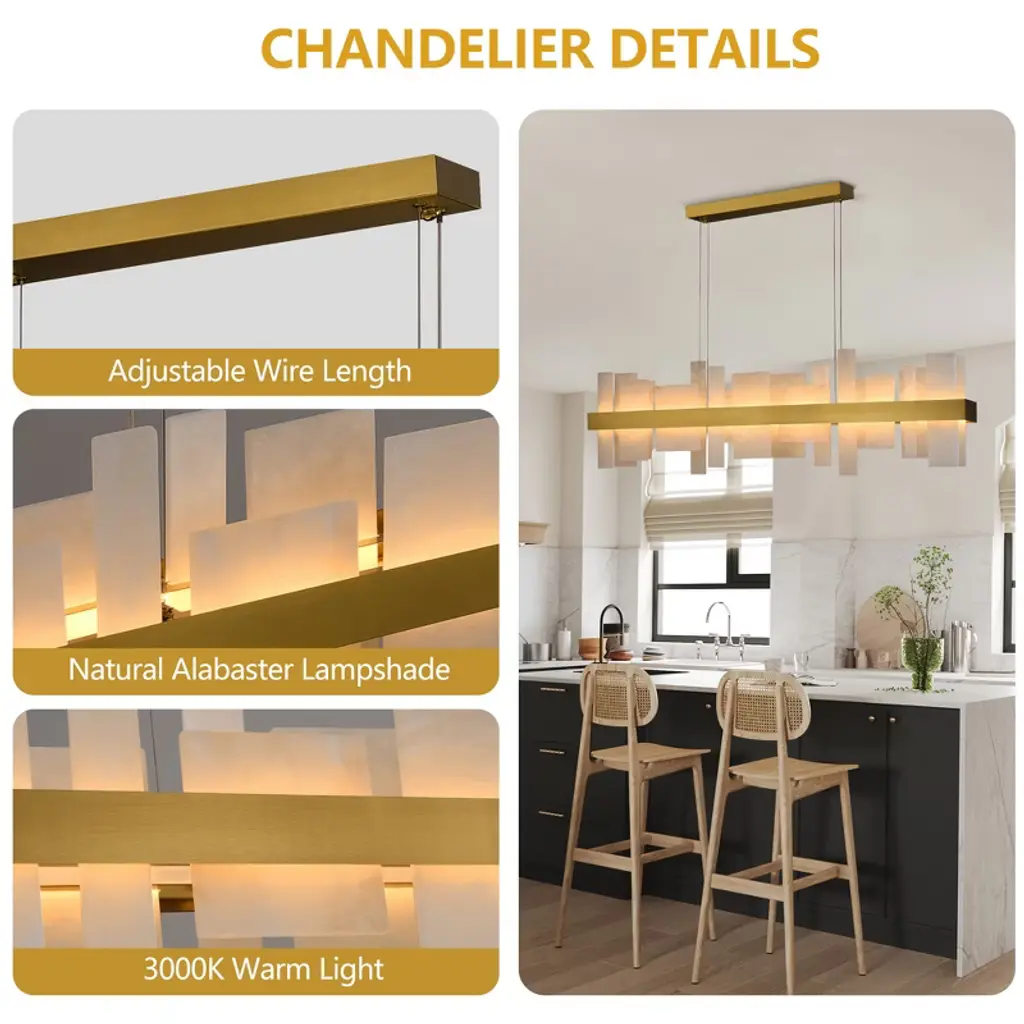 This exquisite chandelier is crafted from natural stone and alabaster, showcasing the authentic beauty of artisanal craftsmanship. Featuring elegant alabaster shades, it emits a warm and soft glow that creates an inviting, romantic atmosphere. Enhanced with a luxurious brass finish and a sleek rectangular metal frame, this alabaster chandelier delivers a modern, high-end aesthetic. It's clean, rectangular design blends minimalist elegance with versatile styling, making it perfect for contemporary, modern, glam and mid-century interiors.
