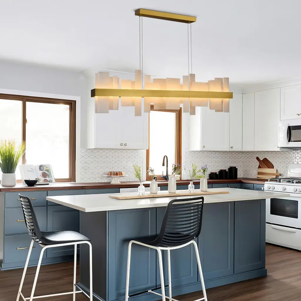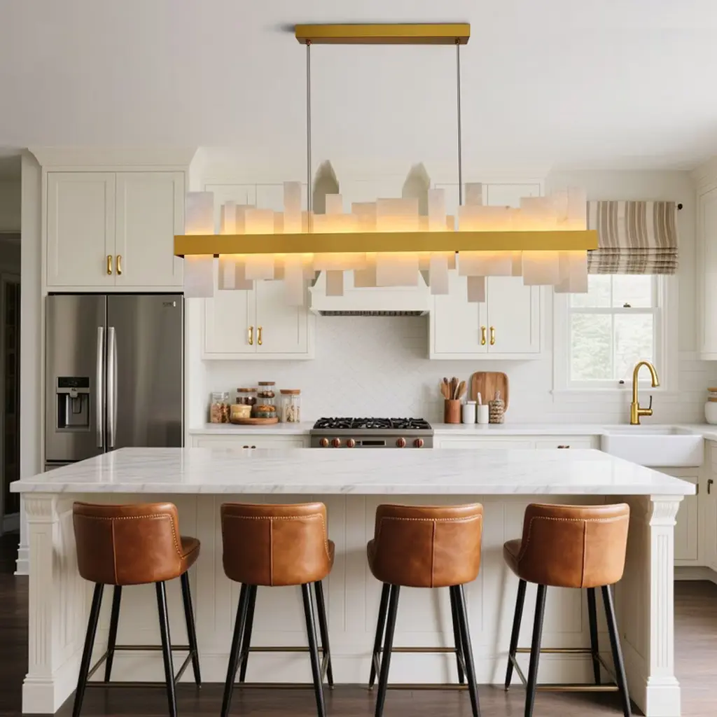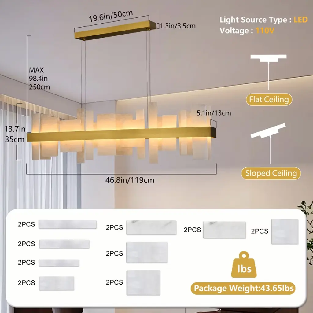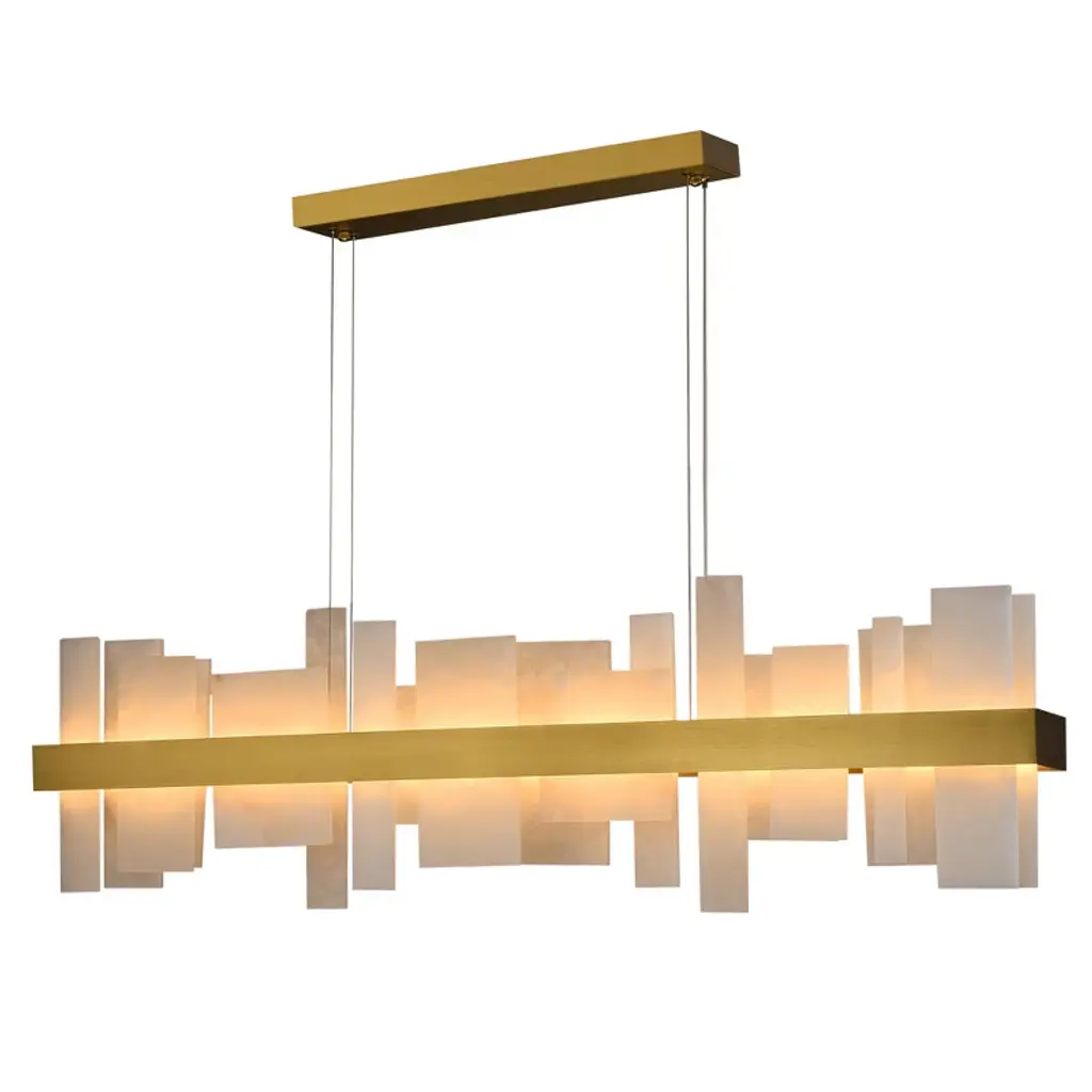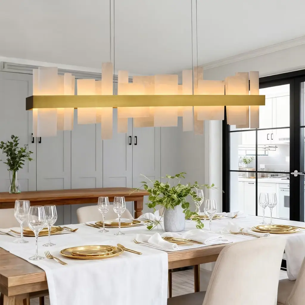 This exquisite chandelier is crafted from natural stone and alabaster, showcasing the authentic beauty of artisanal craftsmanship. Featuring elegant alabaster shades, it emits a warm and soft glow that creates an inviting, romantic atmosphere. Enhanced with a luxurious brass finish and a sleek rectangular metal frame, this alabaster chandelier delivers a modern, high-end aesthetic. It's clean, rectangular design blends minimalist elegance with versatile styling, making it perfect for contemporary, modern, glam and mid-century interiors.