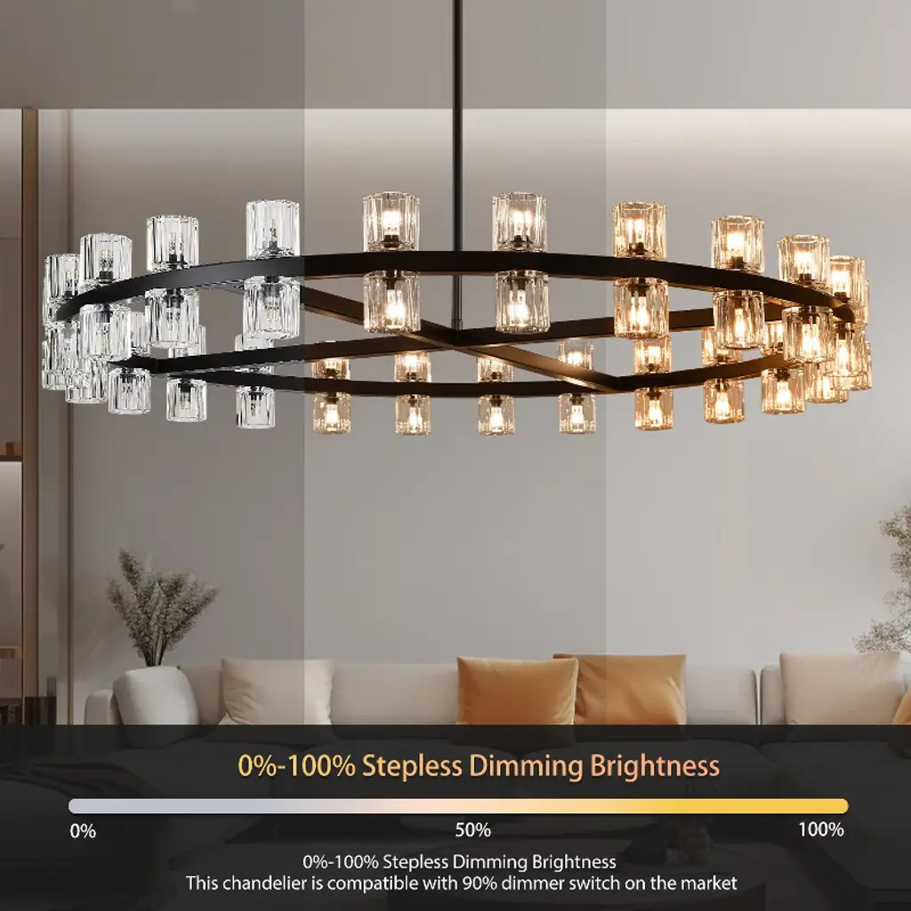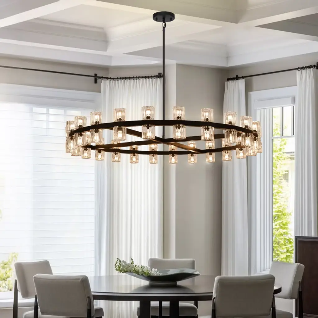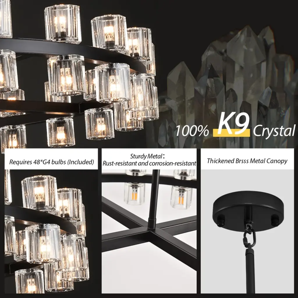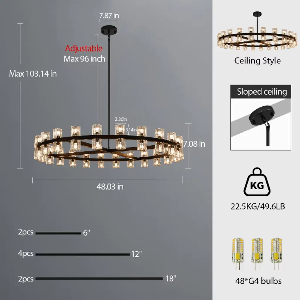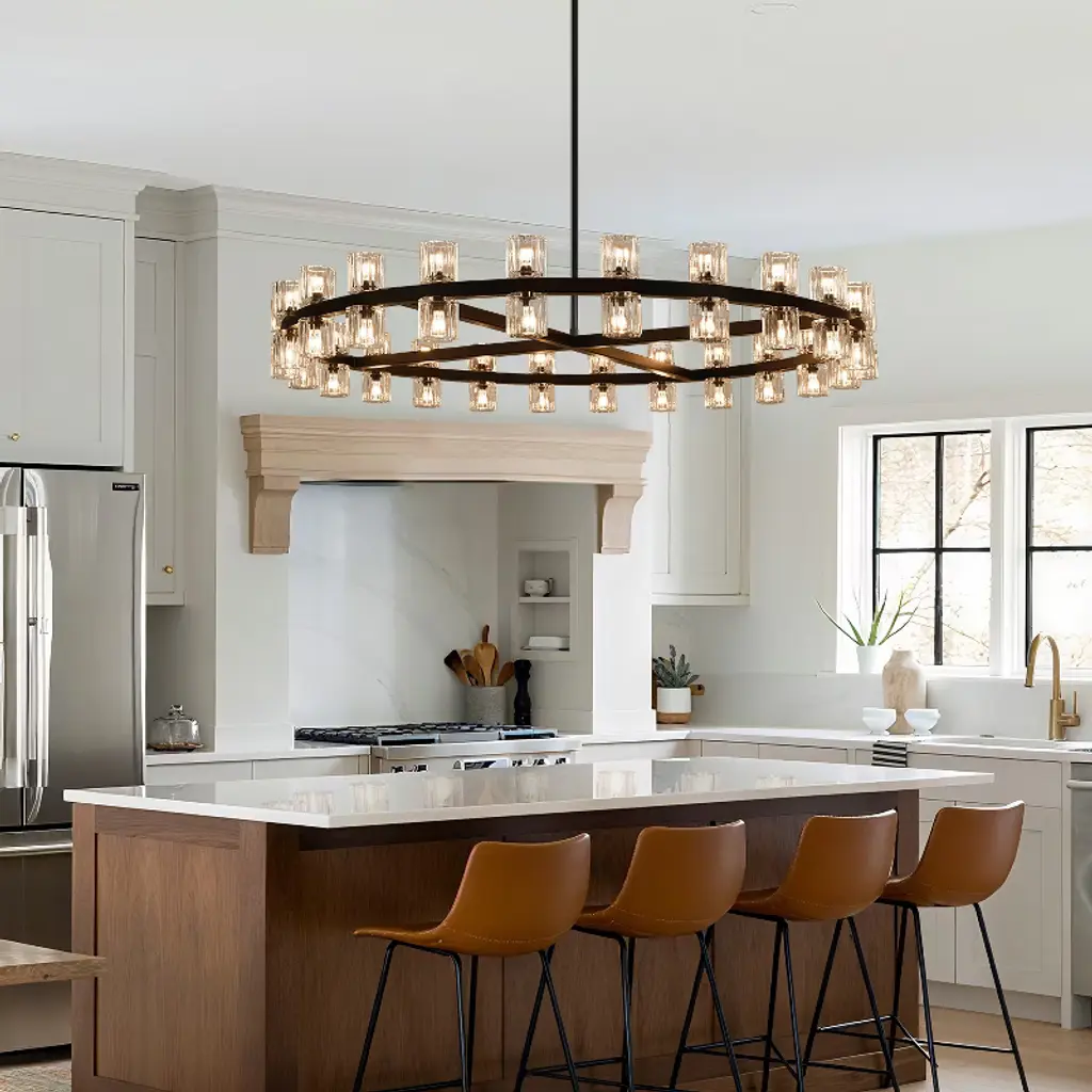 Illuminate your space with a touch of modern glam charm with the chandelier. The stunning chandelier features a classic wagon wheel frame with textured crystal glass shades, offering a bright and brilliant light, creating a romantic and charming ambiance in your space. Crafted from metal with a black/brass finish, the pendant light adds a stylish and luxurious feel that will complement any style of your dining room, kitchen island, bedroom, living room, and more.