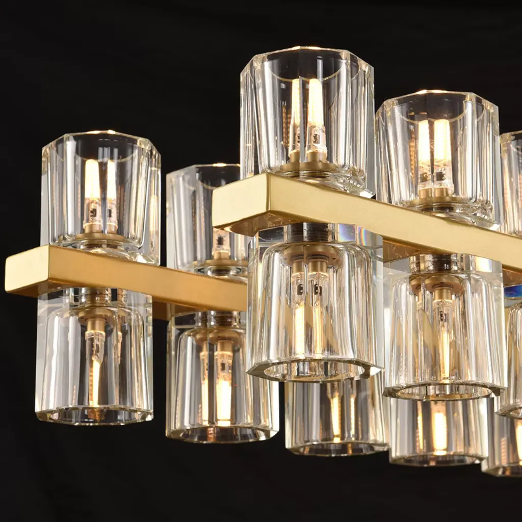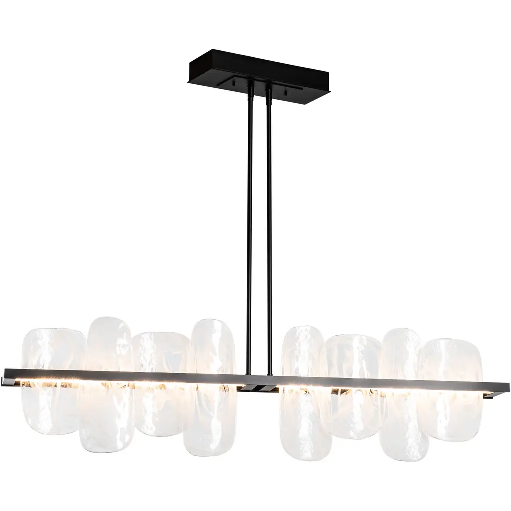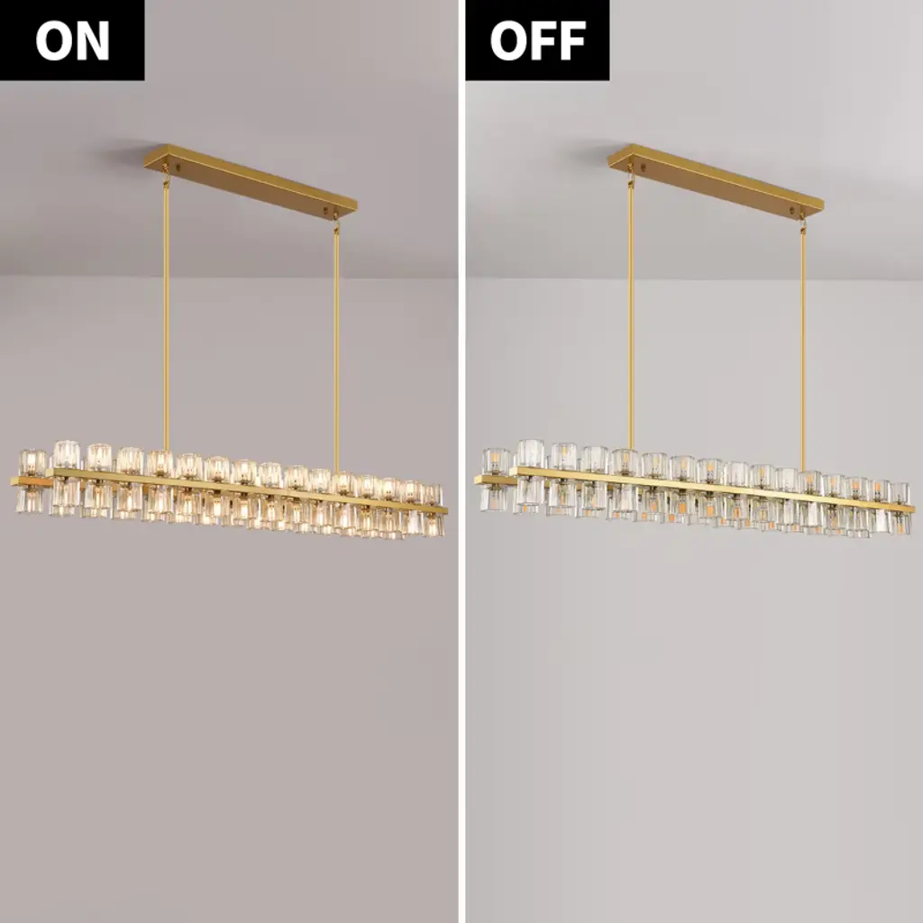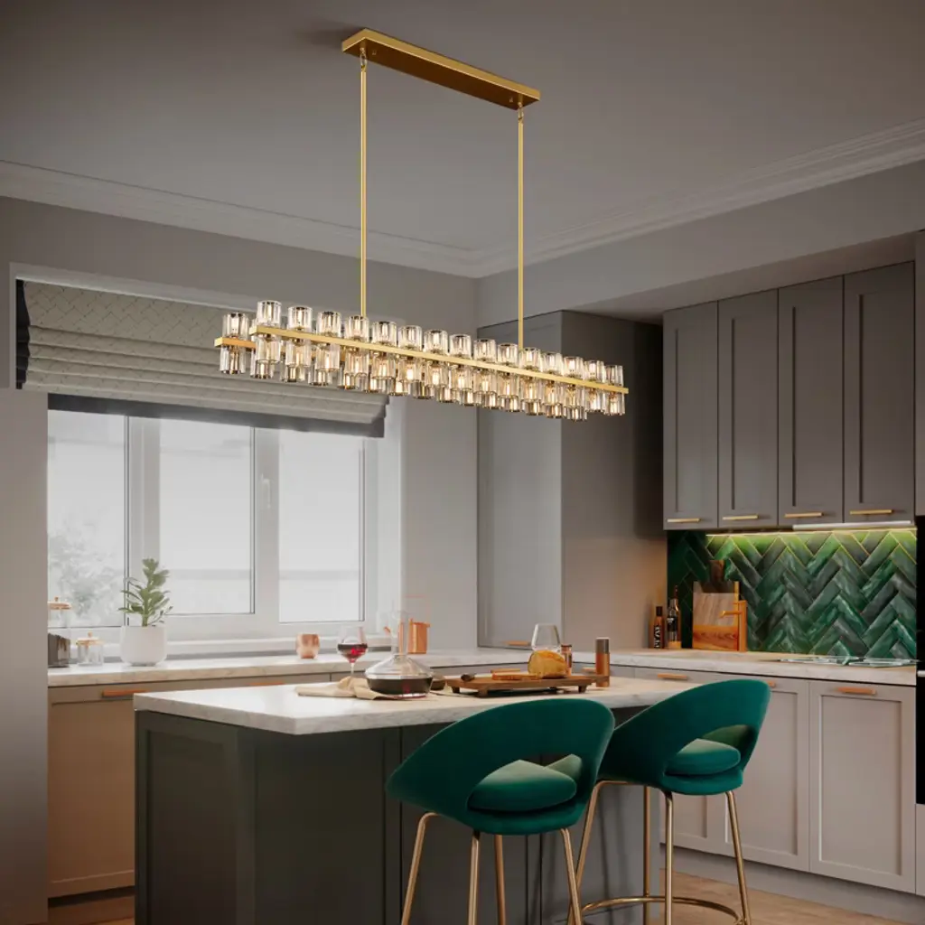 Brings a modern glam vibe to your dining room or kitchen island space with this linear chandelier. Featuring a metal frame support two rows of crystal glass shades, allowing light to filter through and create a stunning sparkle effect that elevates the overall ambiance of any room. This kitchen island pendant light has a clean look with a sleek black finish that pairs well with a variety of styles, from modern or farmhouse.