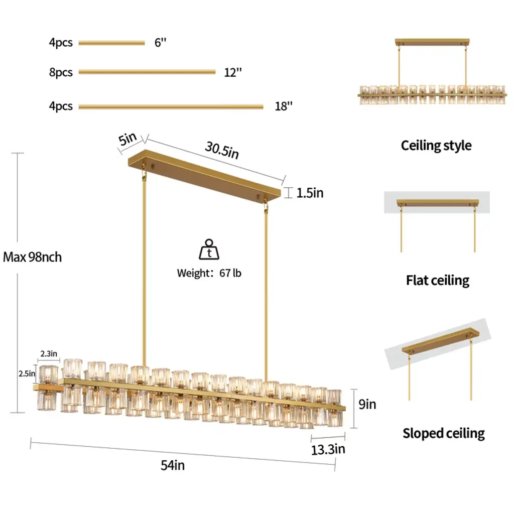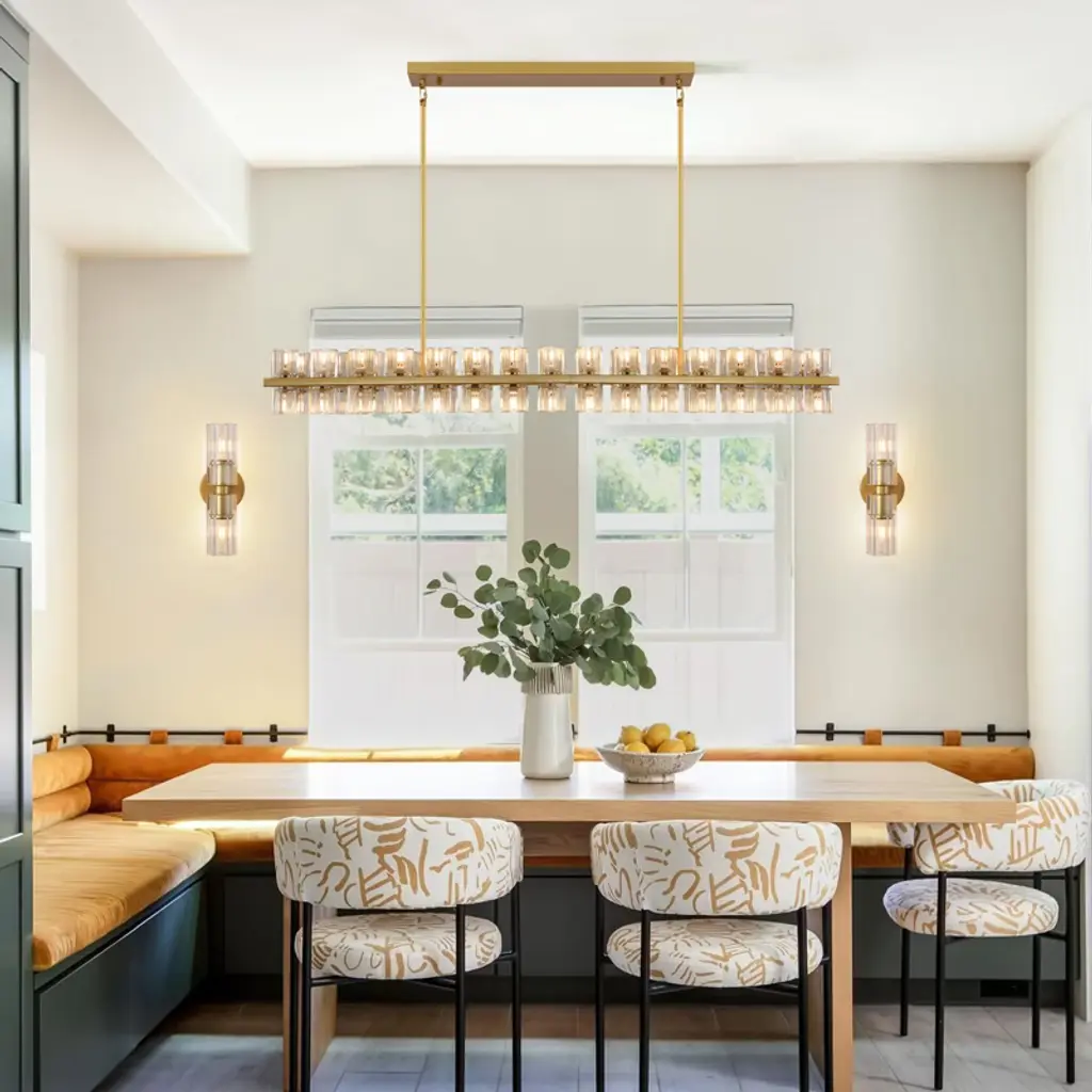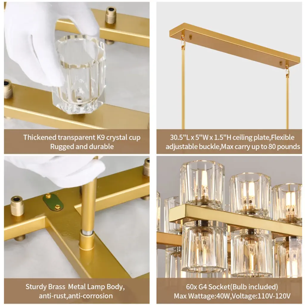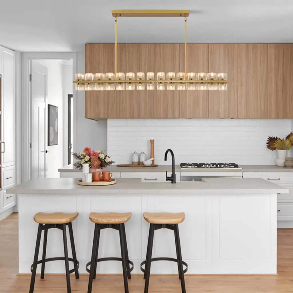 Brings a modern glam vibe to your dining room or kitchen island space with this linear chandelier. Featuring a metal frame support two rows of crystal glass shades, allowing light to filter through and create a stunning sparkle effect that elevates the overall ambiance of any room. This kitchen island pendant light has a clean look with a sleek black finish that pairs well with a variety of styles, from modern or farmhouse.