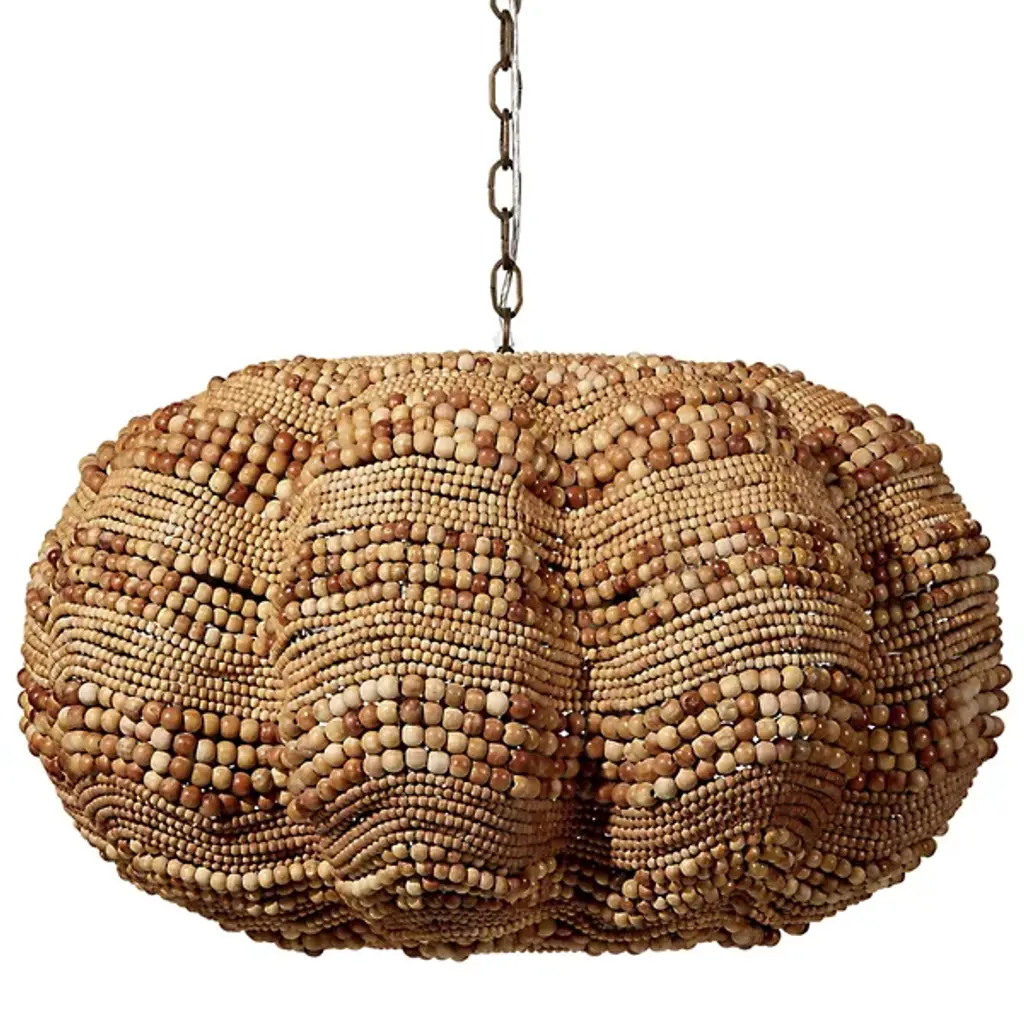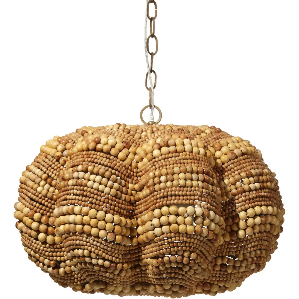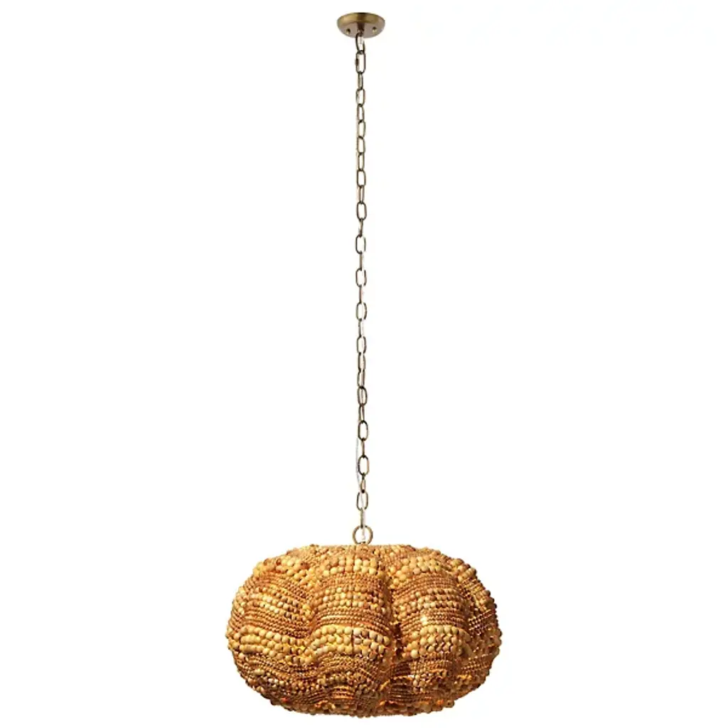 Transform casual interiors with the captivating Clamshell Chandelier from Jamie Young Co., offering a delightful blend of upscale whimsy and engaging sophistication. With a shade hand-carved from mango wood, featuring hundreds of small beads meticulously threaded and arranged in mesmerizing patterns reminiscent of the sun's rays, it expresses a playful yet elegant touch to any space. Intricately crafted with attention to detail, in even its smallest elements, this pendant features a transitional style that complements various interior decor styles, creating versatile and eye-catching character sure to liven up living areas, entryways, and more.