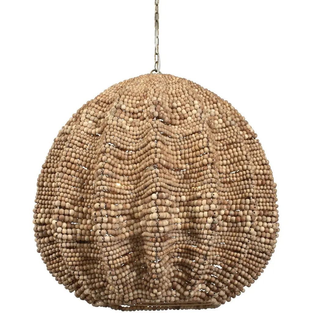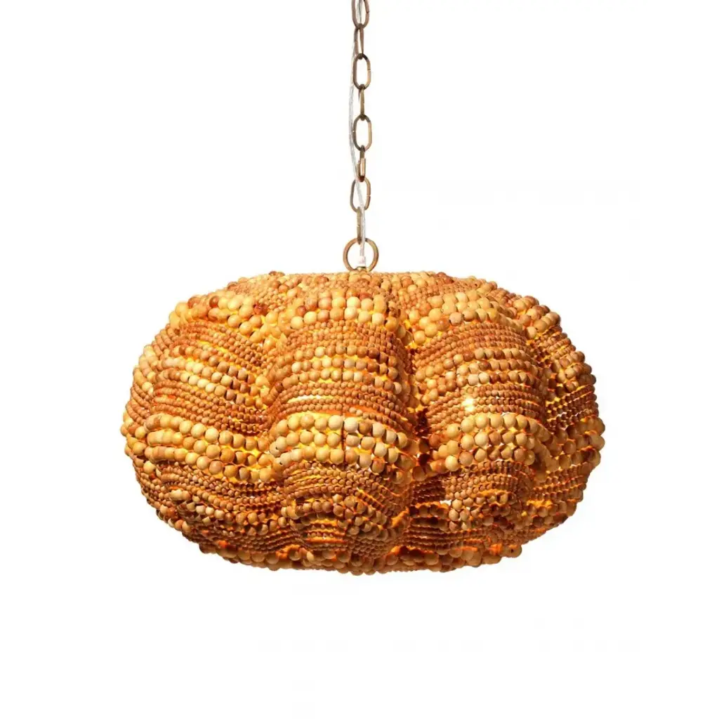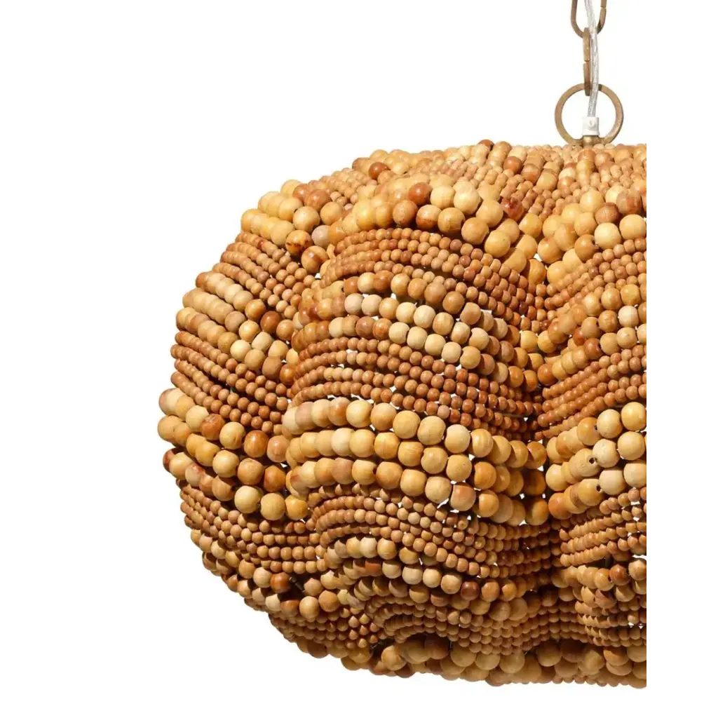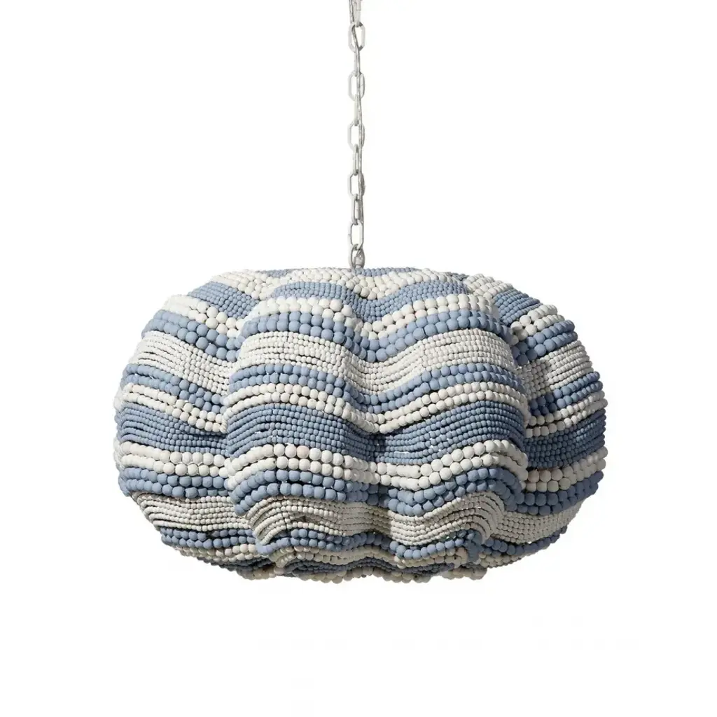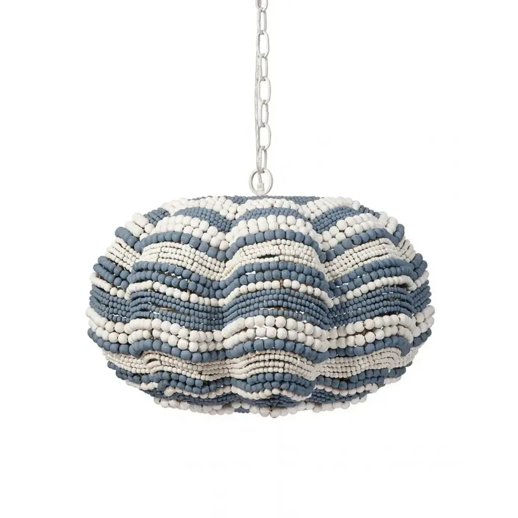 Add a touch of whimsy and more than a little bit of fun to an upscale casual interior with this unique pendant. Each of its hundreds of small beads are hand-carved from mango wood, finished by hand in blue and cream, or natural, and carefully placed in patterns to mimic the ocean’s waves.