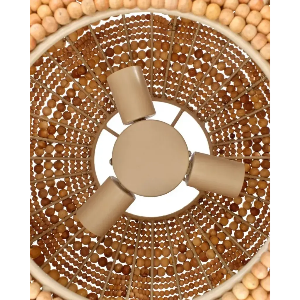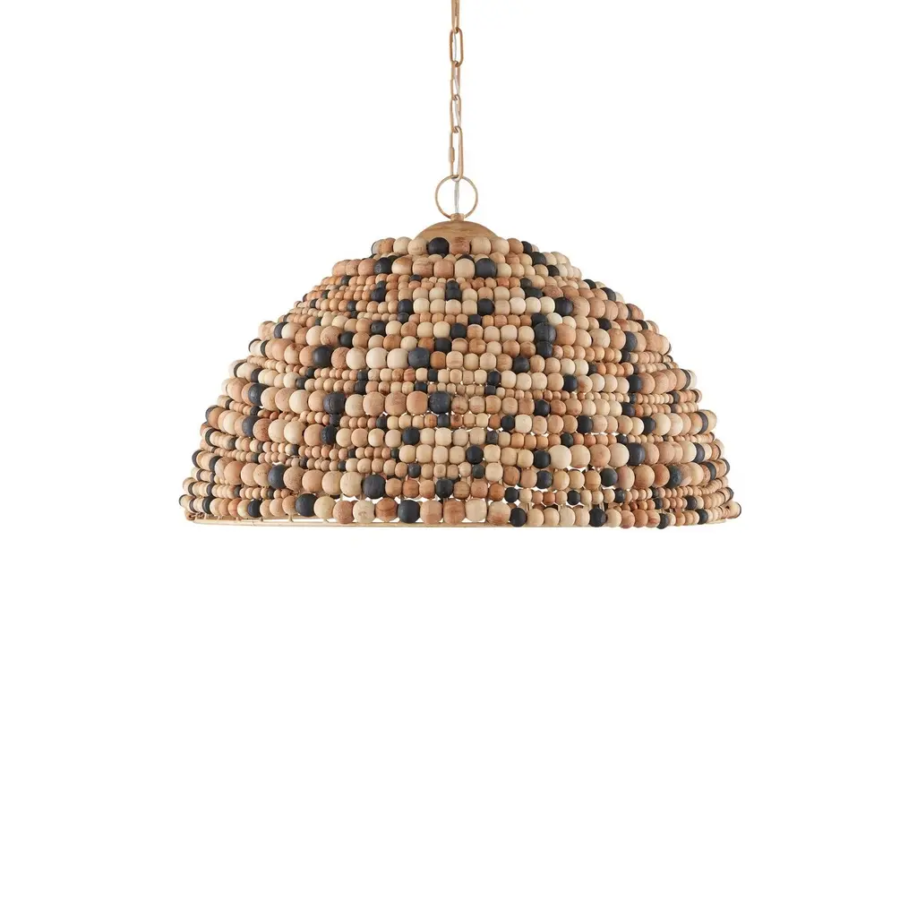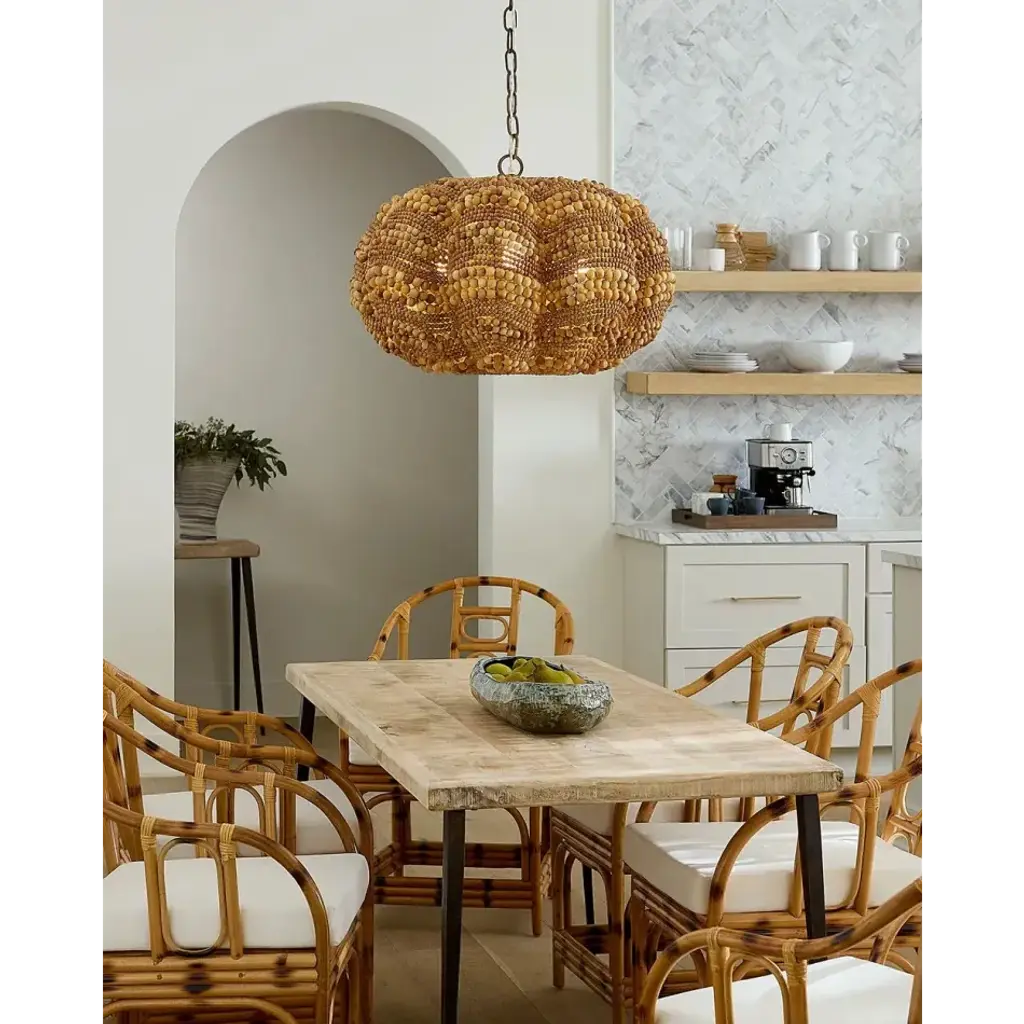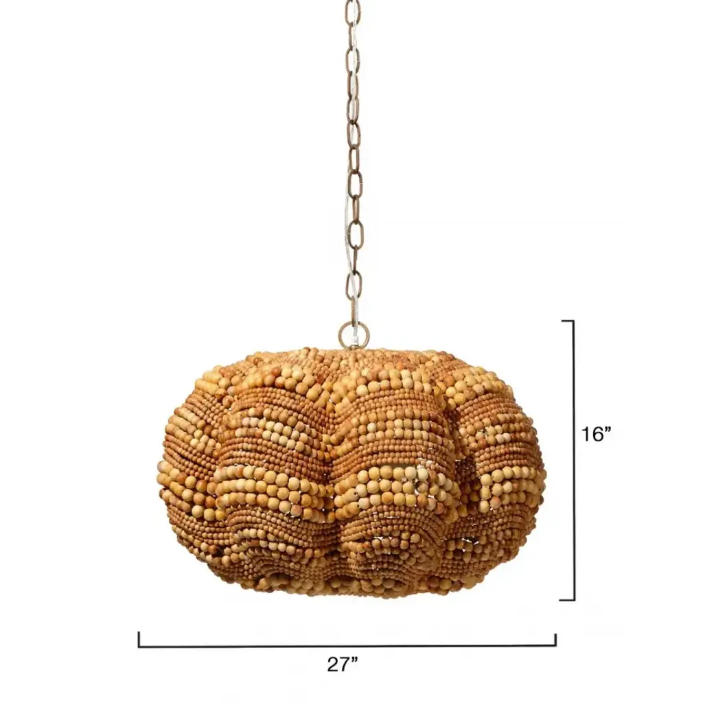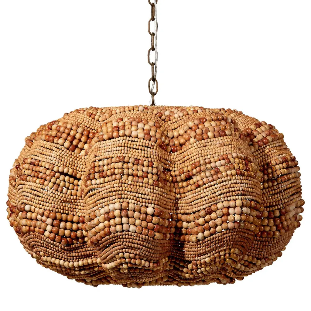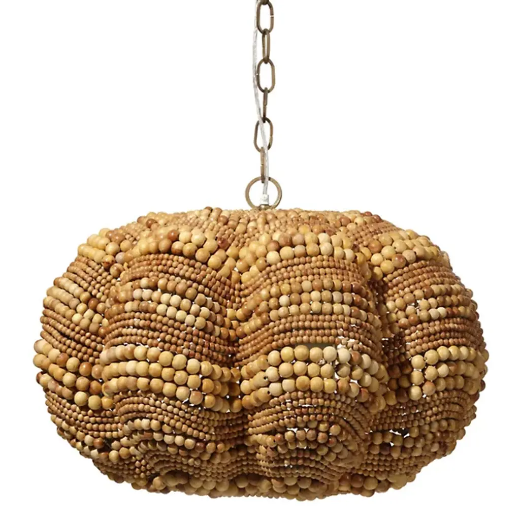 Add a touch of whimsy and more than a little bit of fun to an upscale casual interior with this unique pendant. Each of its hundreds of small beads are hand-carved from mango wood, finished by hand in blue and cream, or natural, and carefully placed in patterns to mimic the ocean’s waves.