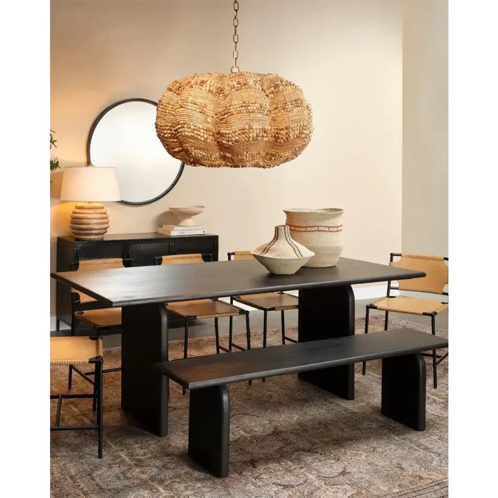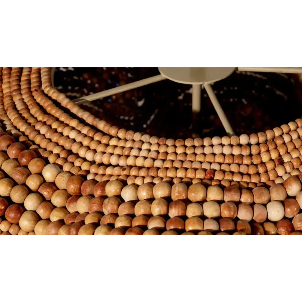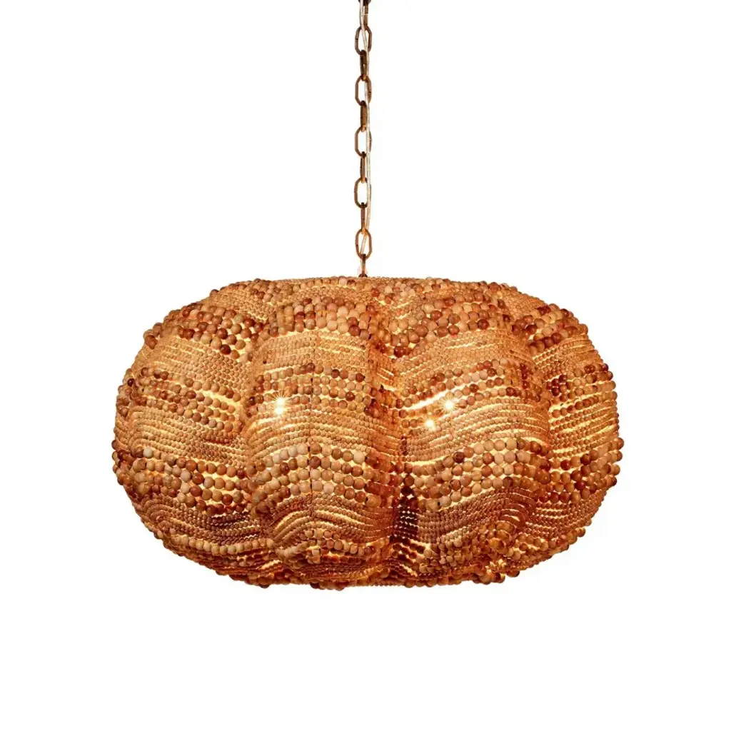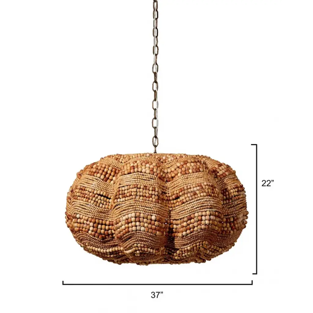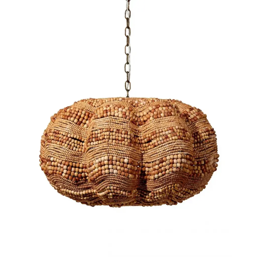 Add a touch of whimsy and more than a little bit of fun to an upscale casual interior with this unique pendant. Each of its hundreds of small beads are hand-carved from mango wood, finished by hand in blue and cream, or natural, and carefully placed in patterns to mimic the ocean’s waves.