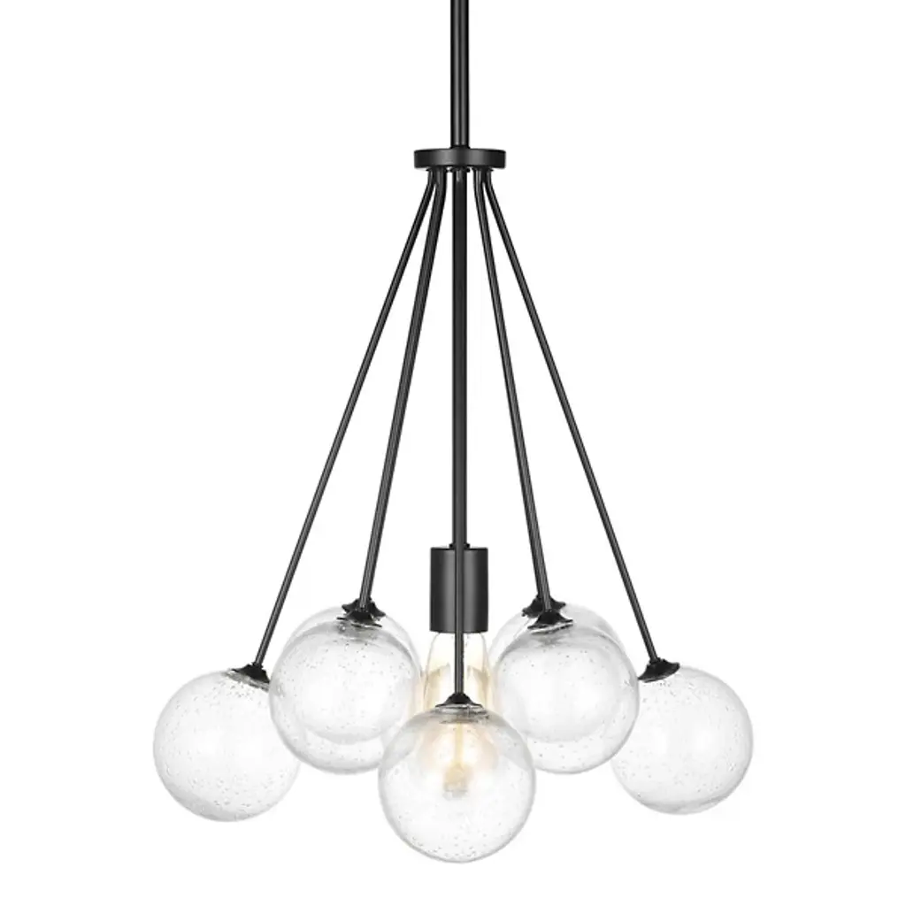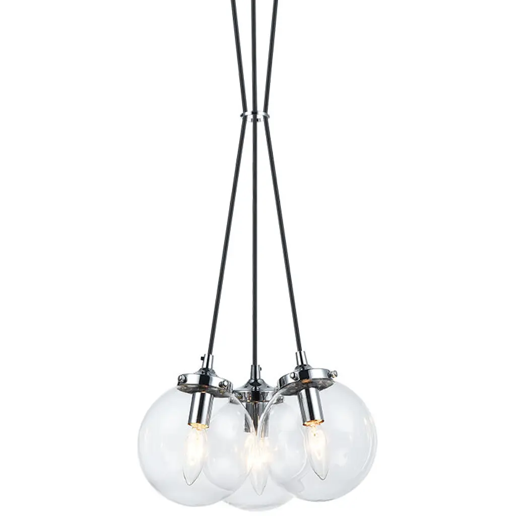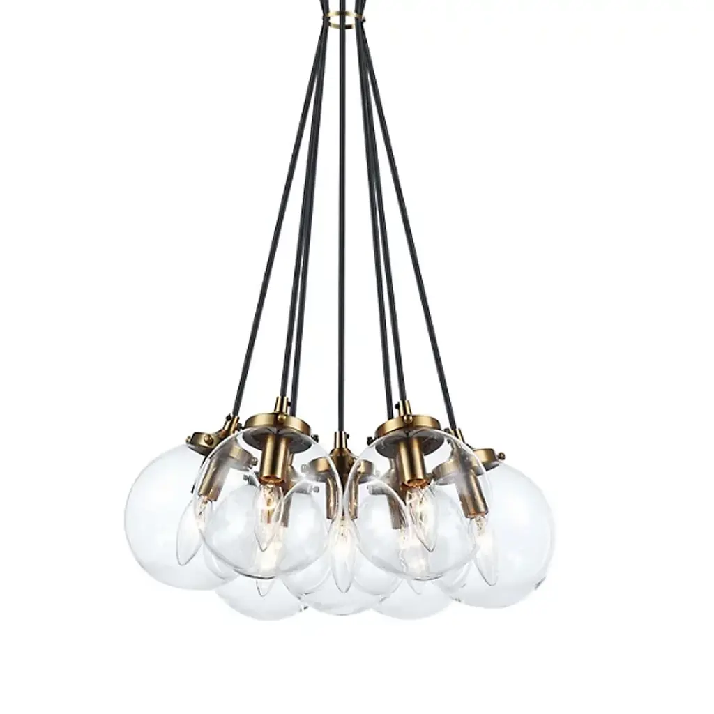 The Clara Chandelier by Huxe breathes life into modern décor with a retro Art Deco flair. Black fabric cords drop from a circular canopy and are gathered together by a slender metal ring at their center. Below, spherical glass shades enclose candleholders and their incandescent bulbs, emitting a warm glow and resembling a stunning bouquet of light. Metal accents enhance the piece’s overall luster as they catch and reflect light throughout.