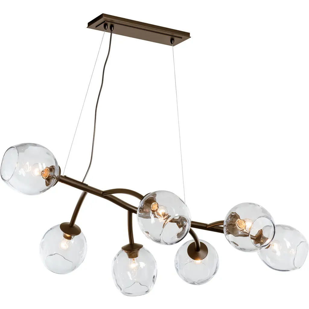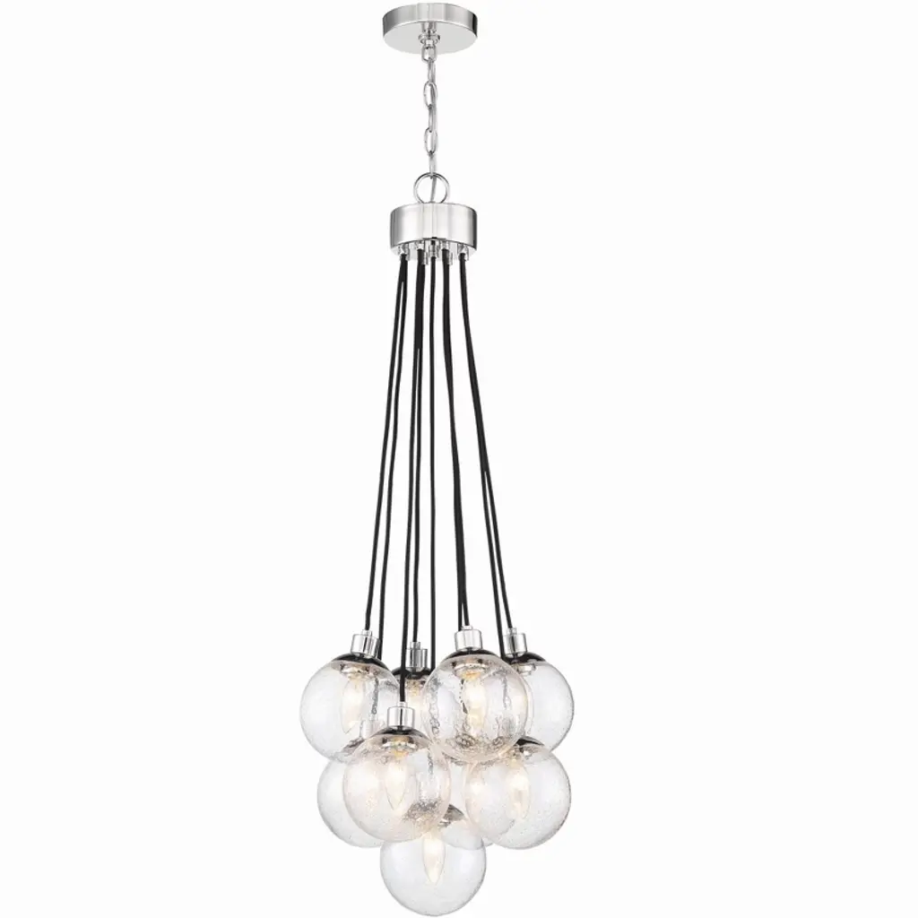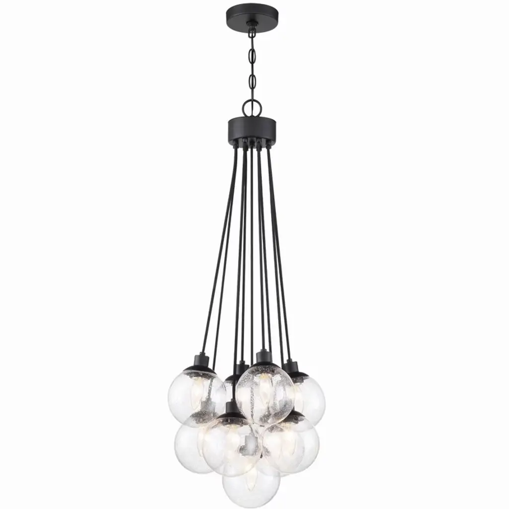 The Clara Chandelier by Huxe breathes life into modern décor with a retro Art Deco flair. Black fabric cords drop from a circular canopy and are gathered together by a slender metal ring at their center. Below, spherical glass shades enclose candleholders and their incandescent bulbs, emitting a warm glow and resembling a stunning bouquet of light. Metal accents enhance the piece’s overall luster as they catch and reflect light throughout.