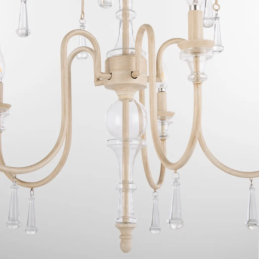 Clasica brings European-inspired elegance to any space with its romantic and traditional design. The washed oak finish works seamlessly with the shaped glass detail. Its soft, weathered tones complement the smooth, sculpted form, creating a delicate and distinguished look. Bold glass crystals hang from the arms, adding a touch of luxurious brilliance that enhances the fixtures elegant silhouette. Available in multiple light configurations to suit a variety of settings.