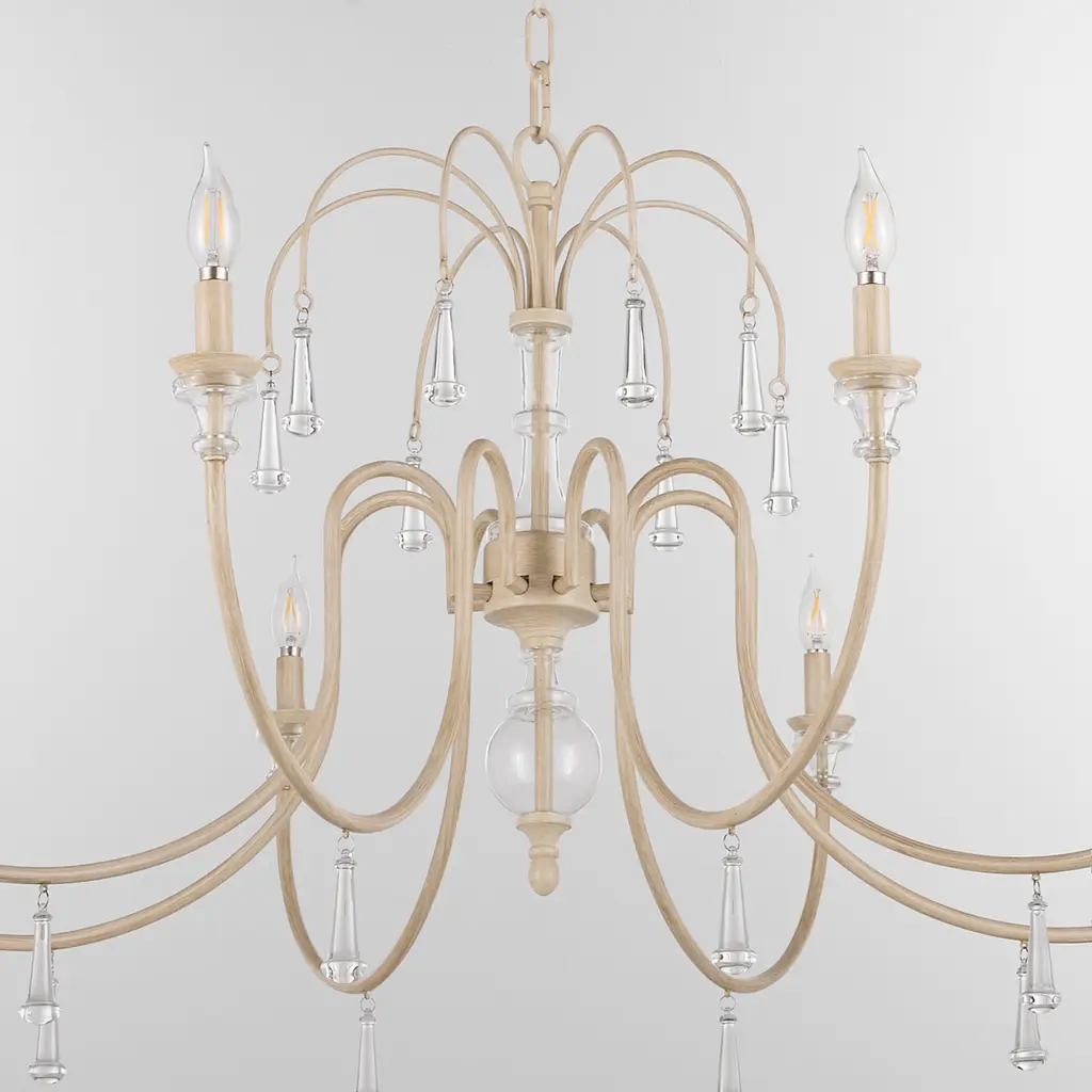 Clasica brings European-inspired elegance to any space with its romantic and traditional design. The washed oak finish works seamlessly with the shaped glass detail. Its soft, weathered tones complement the smooth, sculpted form, creating a delicate and distinguished look. Bold glass crystals hang from the arms, adding a touch of luxurious brilliance that enhances the fixtures elegant silhouette. Available in multiple light configurations to suit a variety of settings.