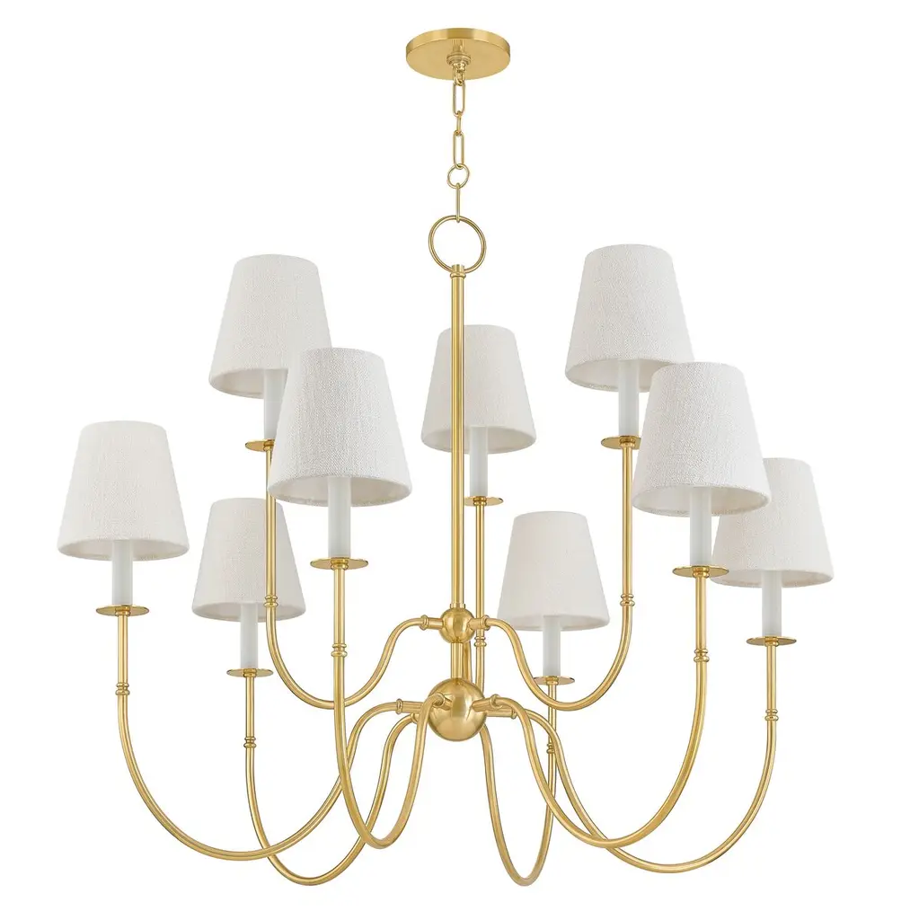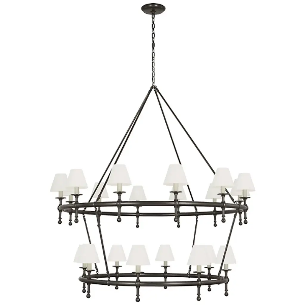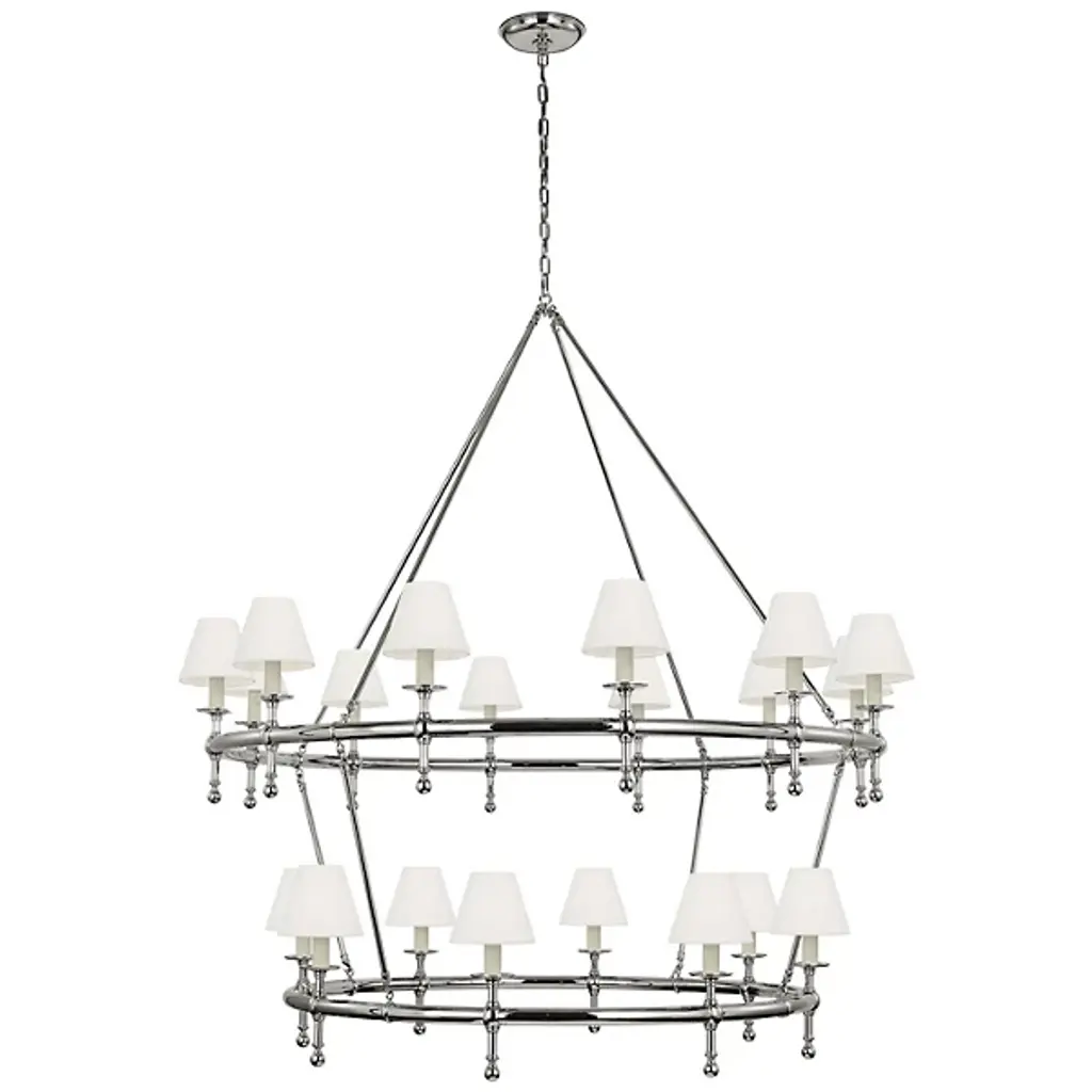 The Classic Two-Tier Ring Chandelier from Visual Comfort Signature showcases enduring grace through its refined design. Suspended from a round canopy by a short, delicate length of chain, this fixture features two distinct horizontal rings elegantly suspended by slim metal rods. Designed by Chapman & Myers, it features refined transitional details accentuating each tier. Each candelabra lamp is sheathed in a flared linen shade, transmitting an even allure that dances across a layered, traditional silhouette. This chandelier masterfully blends contemporary sophistication with timeless charm, making it a versatile and captivating choice for large interior settings.