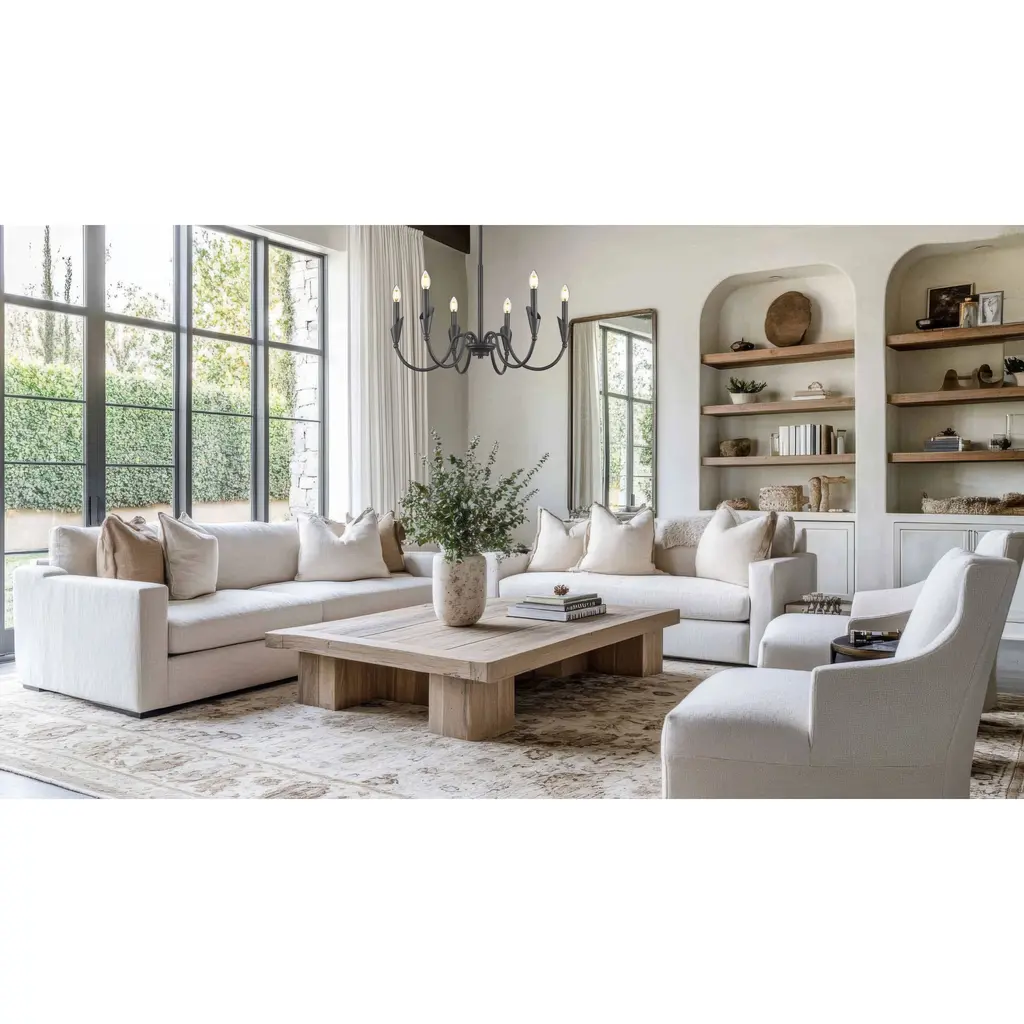 With six gently arched arms and a sleek matte black finish, this chandelier channels the quiet beauty of floral form. Each white linen shade floats like a petal in bloom, creating a warm, welcoming atmosphere overhead. Its a striking yet subtle piece designed to soften modern spaces and elevate the everyday.