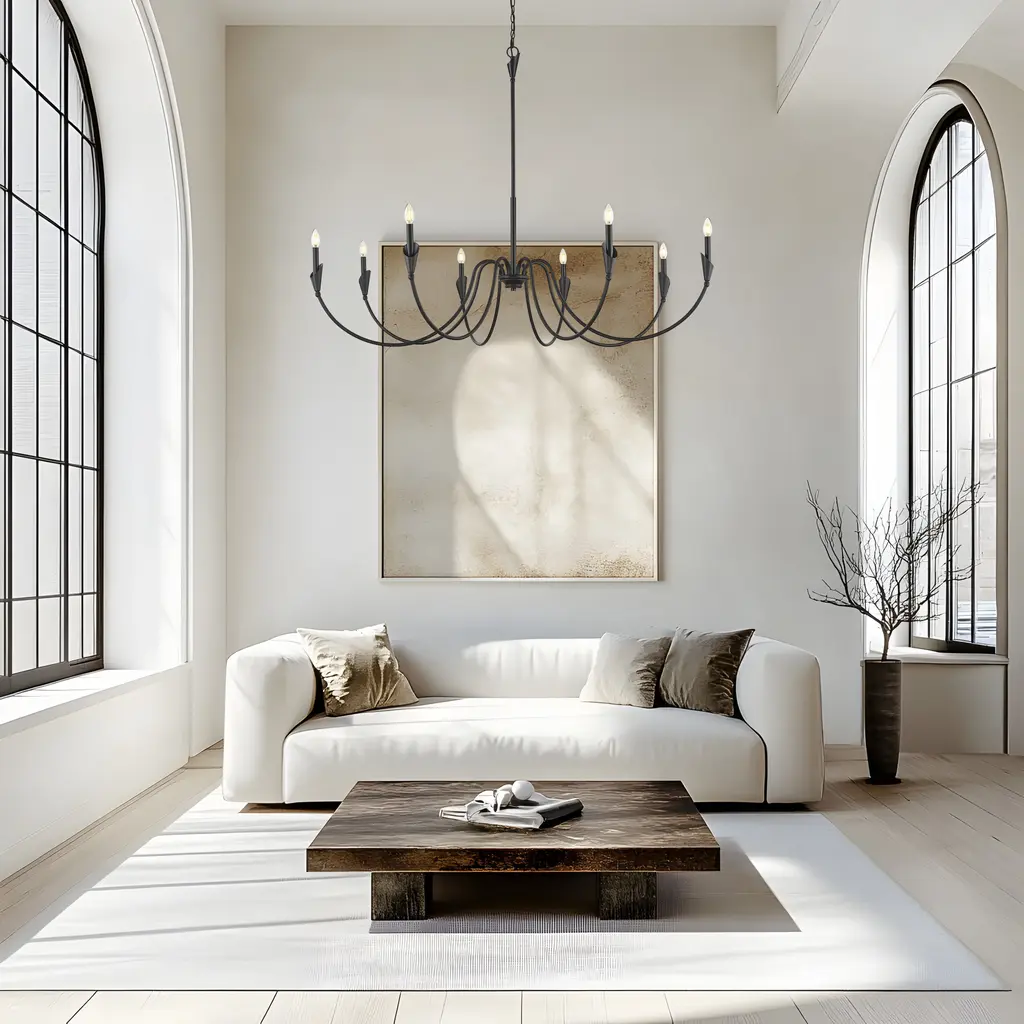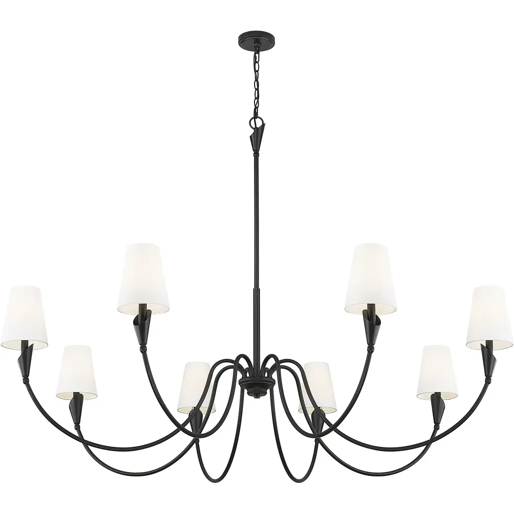 Expansive but never overwhelming, this eight-light chandelier spreads warmth and grace across the ceiling. Its matte black frame offers grounding structure, while linen shades add texture and lightness. Its a stunning choice for large dining spaces, vaulted entries, or open concept living.