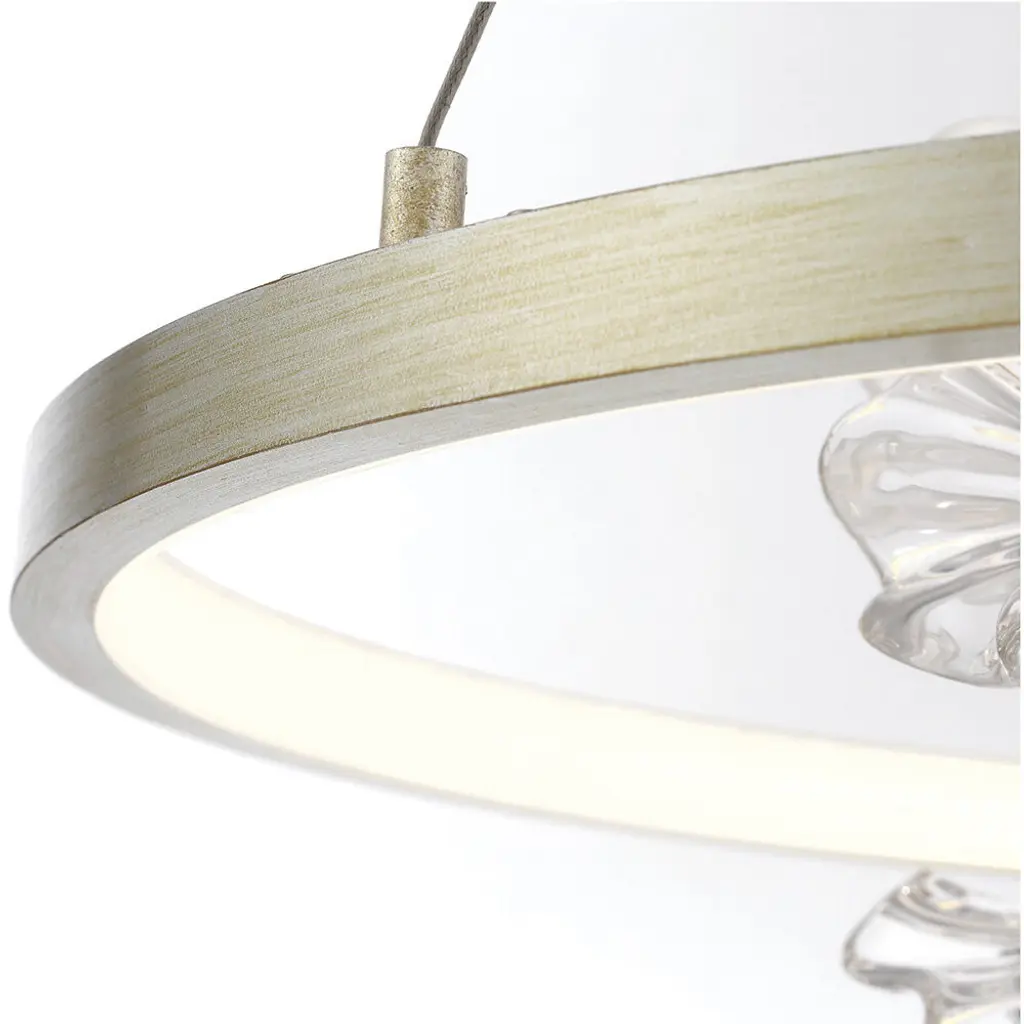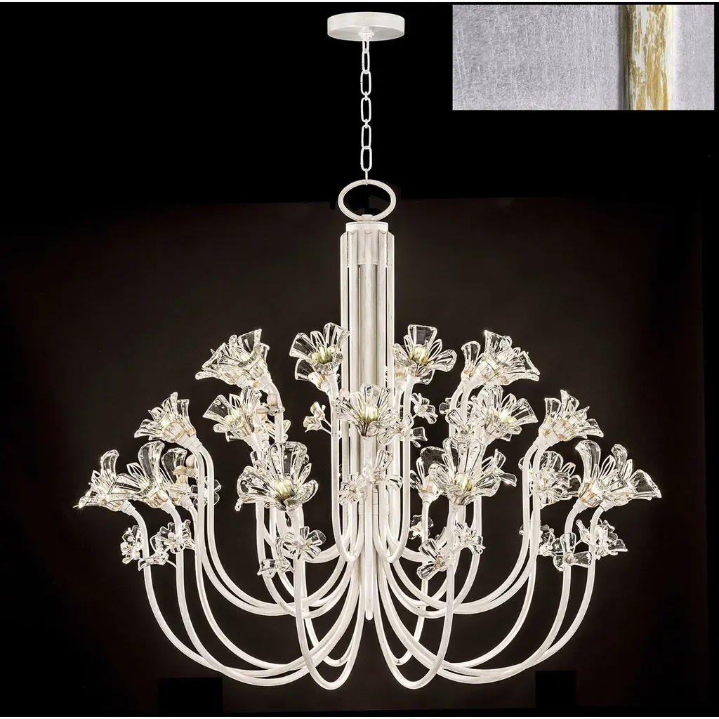 A bouquet of opal and clear glass florets are framed by a lustrous LED ring. The delicate blossoms shine gracefully above, reflecting light through the different opacities. Choose between two different sized clusters to lavishly suit your room needs.