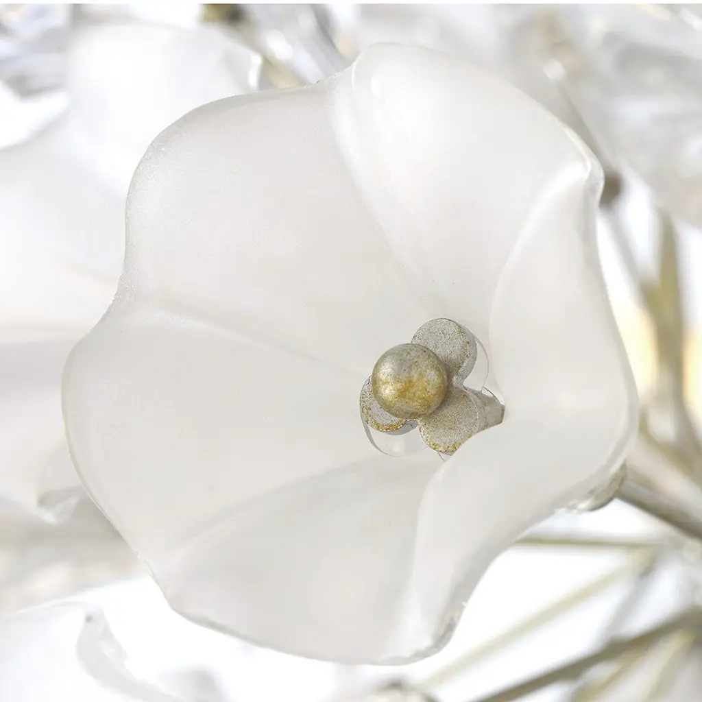 A bouquet of opal and clear glass florets are framed by a lustrous LED ring. The delicate blossoms shine gracefully above, reflecting light through the different opacities. Choose between two different sized clusters to lavishly suit your room needs.