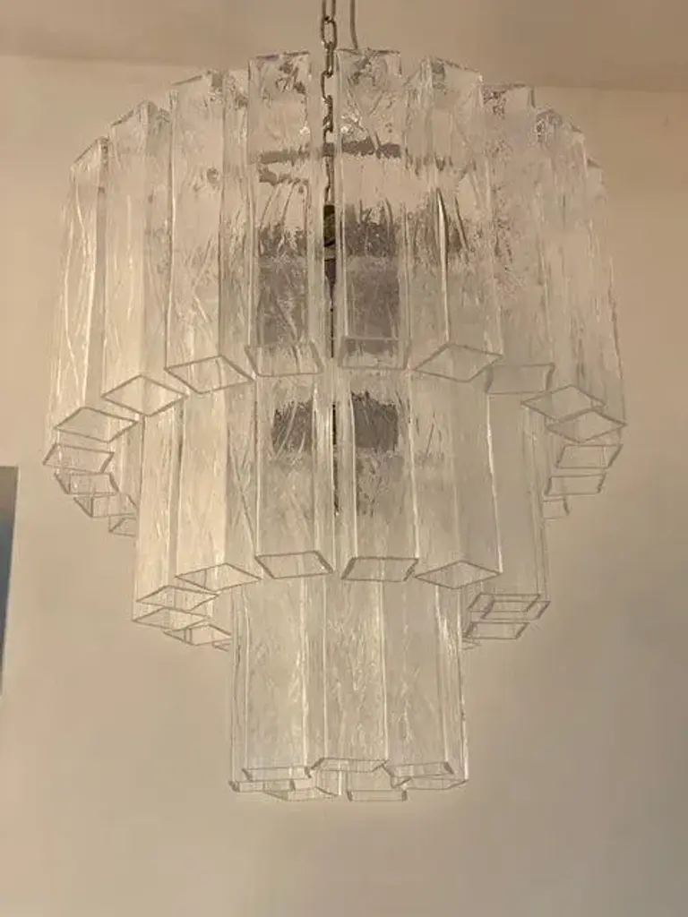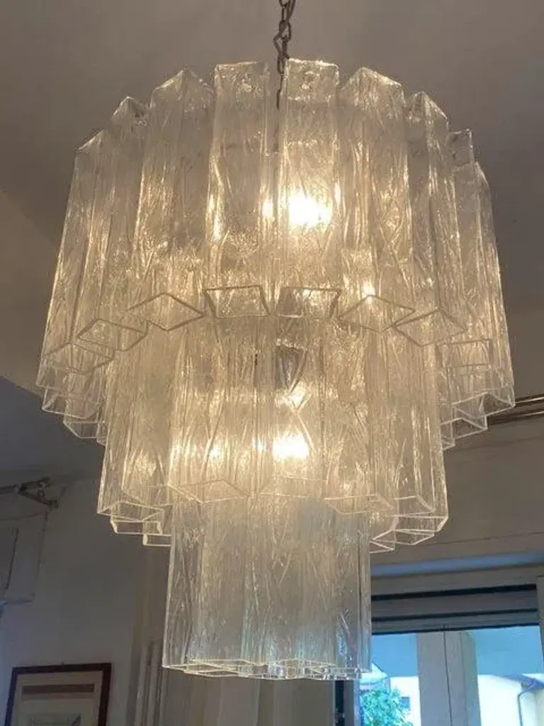 Contemporary transparent “squared tubes” murano glass chandelier in venini style three levels of trasparent "squared tubes" all in murano glass, esclusive design. luxury and scenographic chandelier for classic and modern interiors. all hand made in italy, all made in murano glass chain 19.7″ more canopy on ceiling. spare parts are included. Bulbs not included, they are compatible with led sustainability. entirely made in italy, made in murano glass fruit of of high italian know-how. dimensions(cm/in): d 60cm h 65cm/ l 23.6″ h 25.6″ finiture: chrome metal frame all made in italy, all ship from italy european plug (up to 250v).