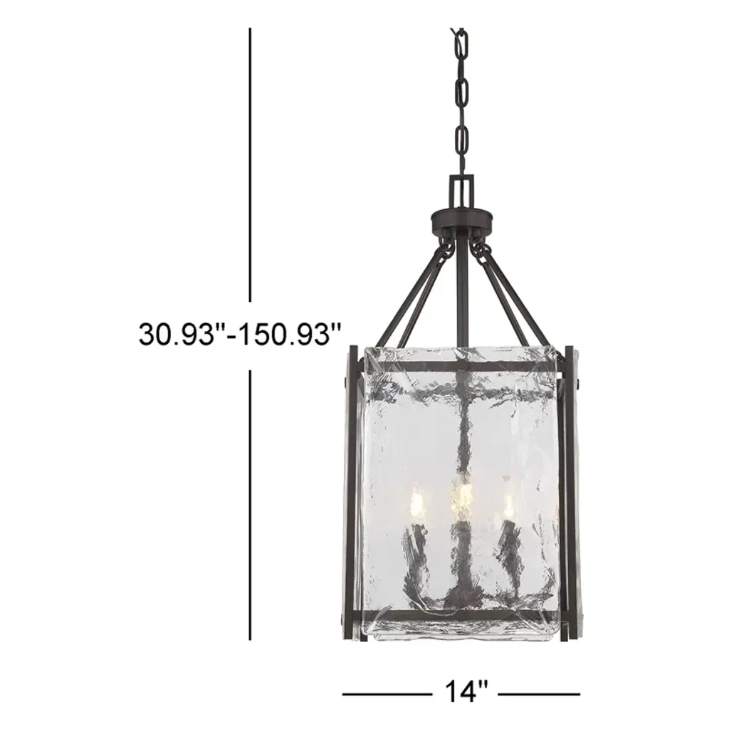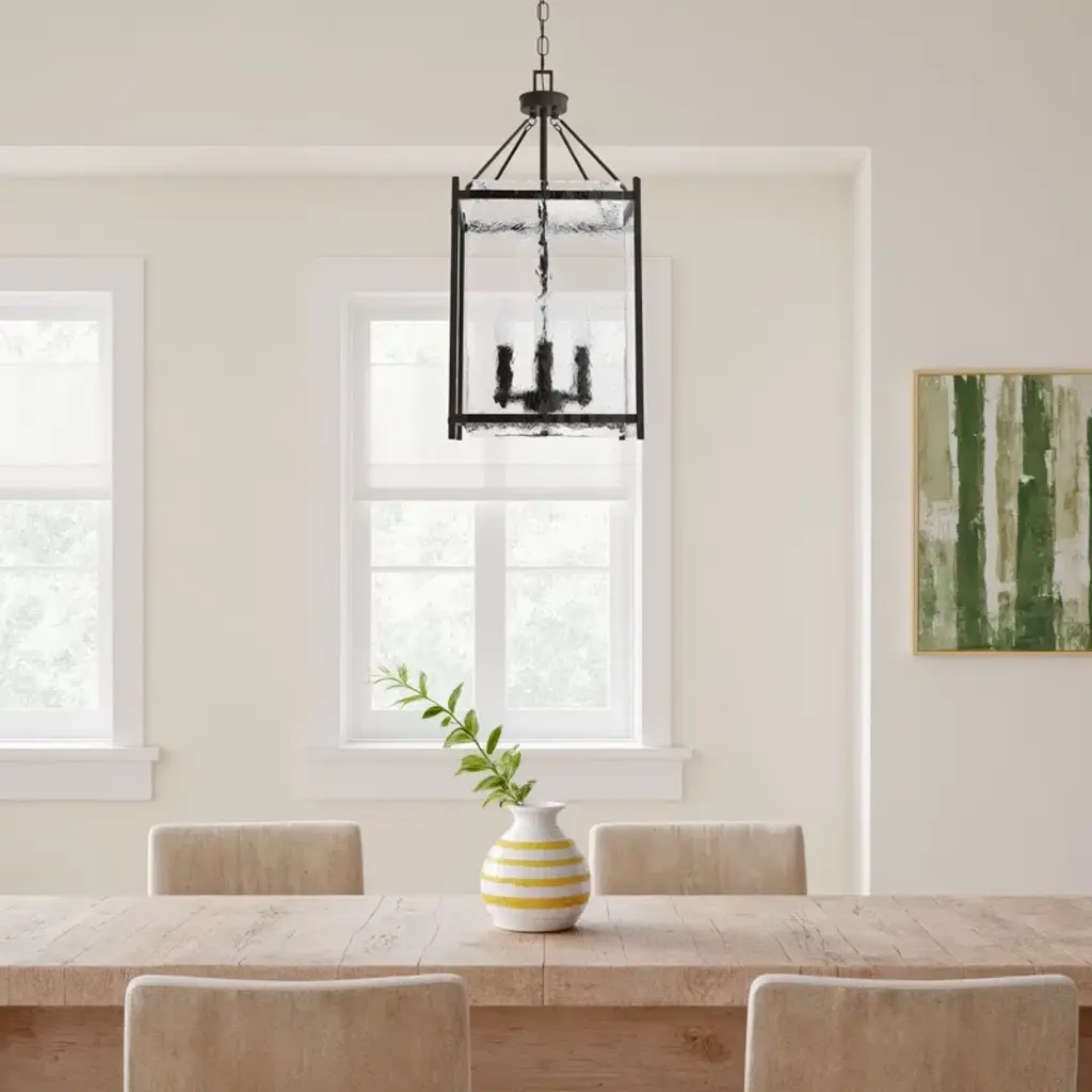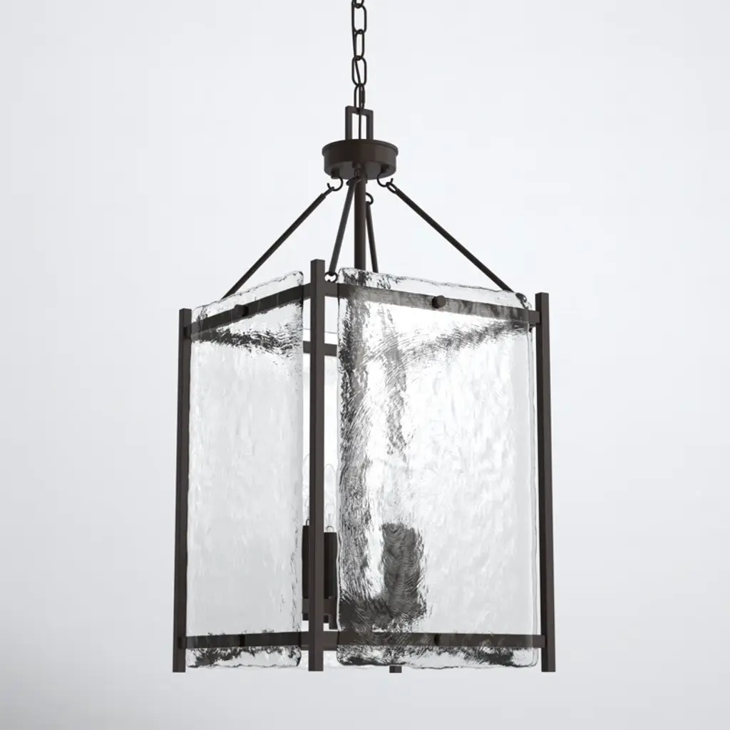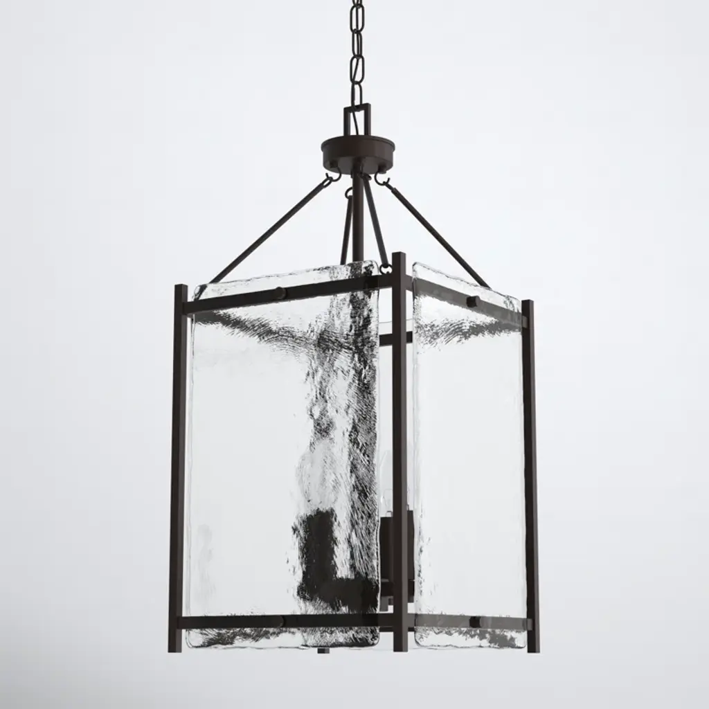 This 4-light hanging pendant has a deconstructed look that we love as a rustic accent in your entryway or over your dining room table. It's made with an open metal frame that supports four slabs of clear seeded glass that form a shade. Exposed hardware and an adjustable hanging chain round out this pendant light's look. Inside, a candelabra fixture takes 60W bulbs, which are sold separately. We love that this square pendant is compatible with dimmer switches, so you can get the light just right for family dinner or a dinner party.