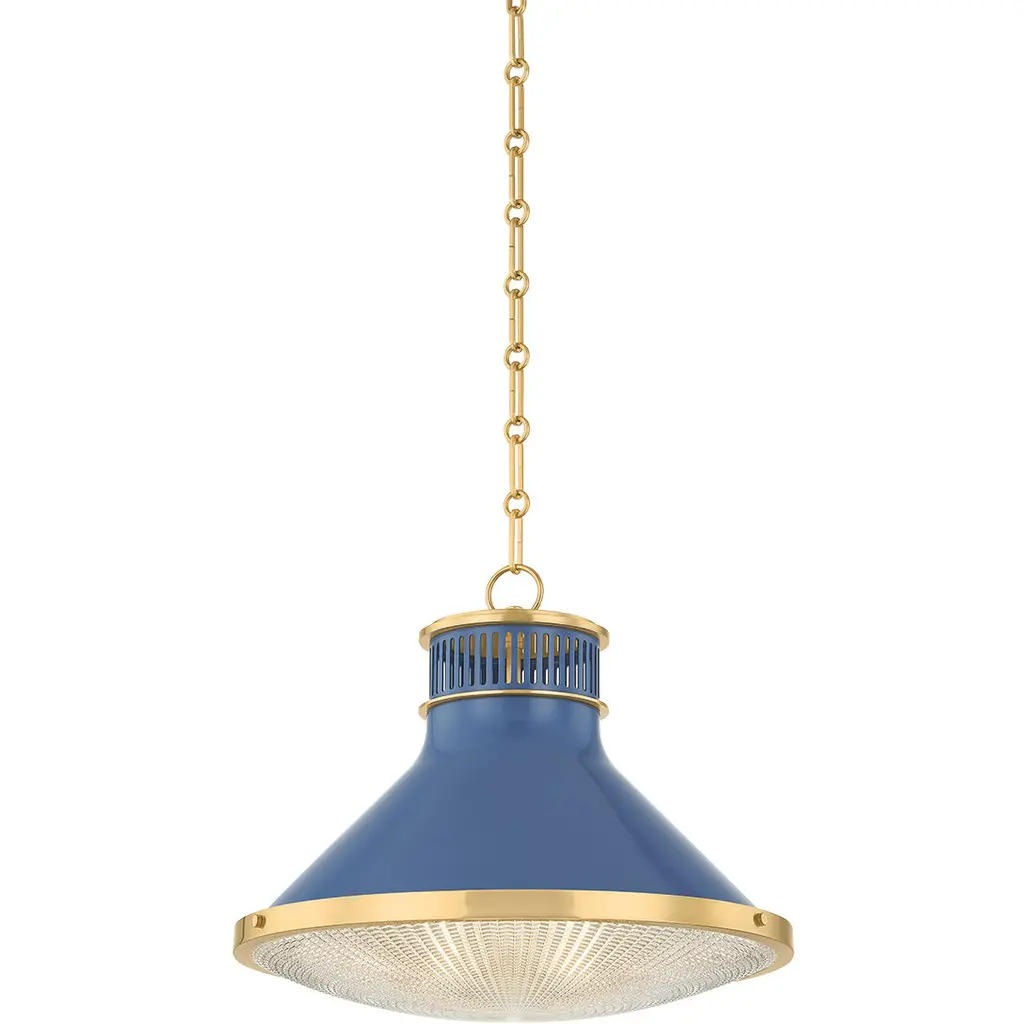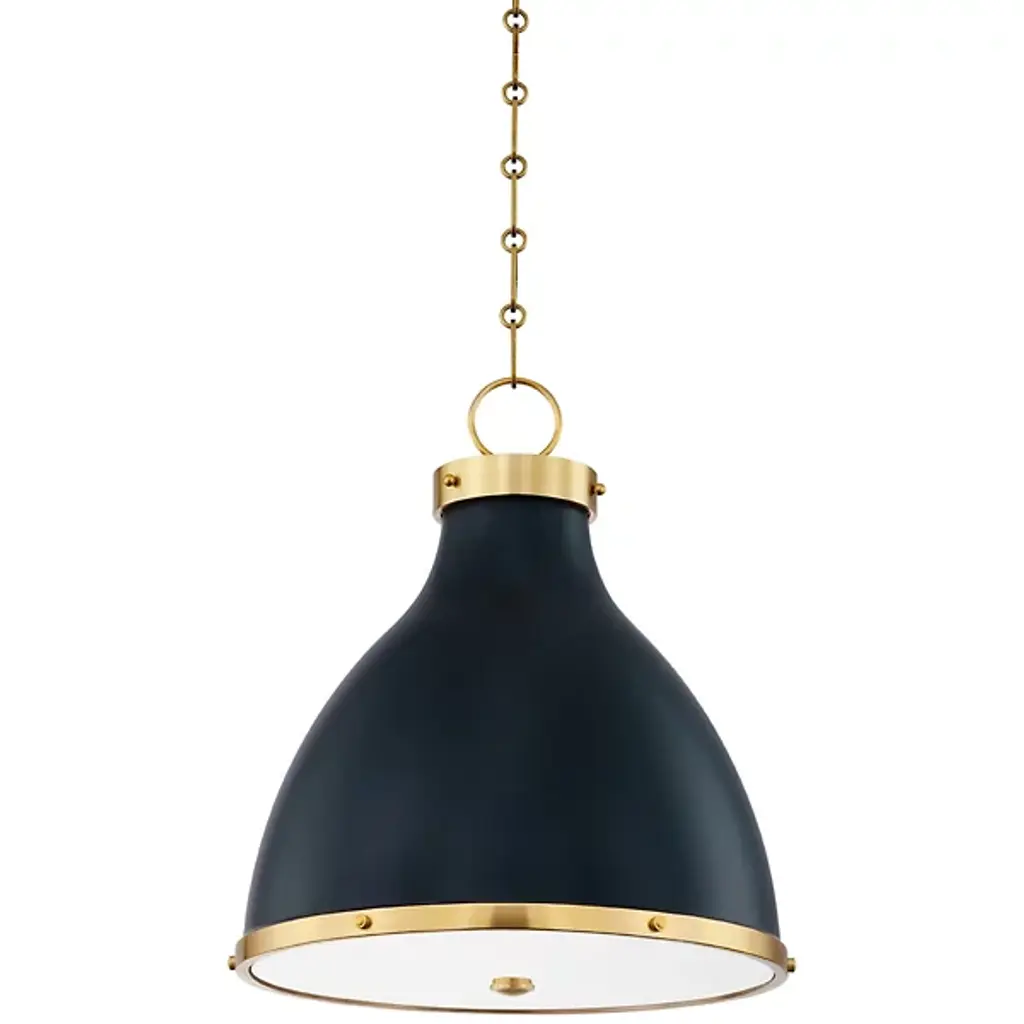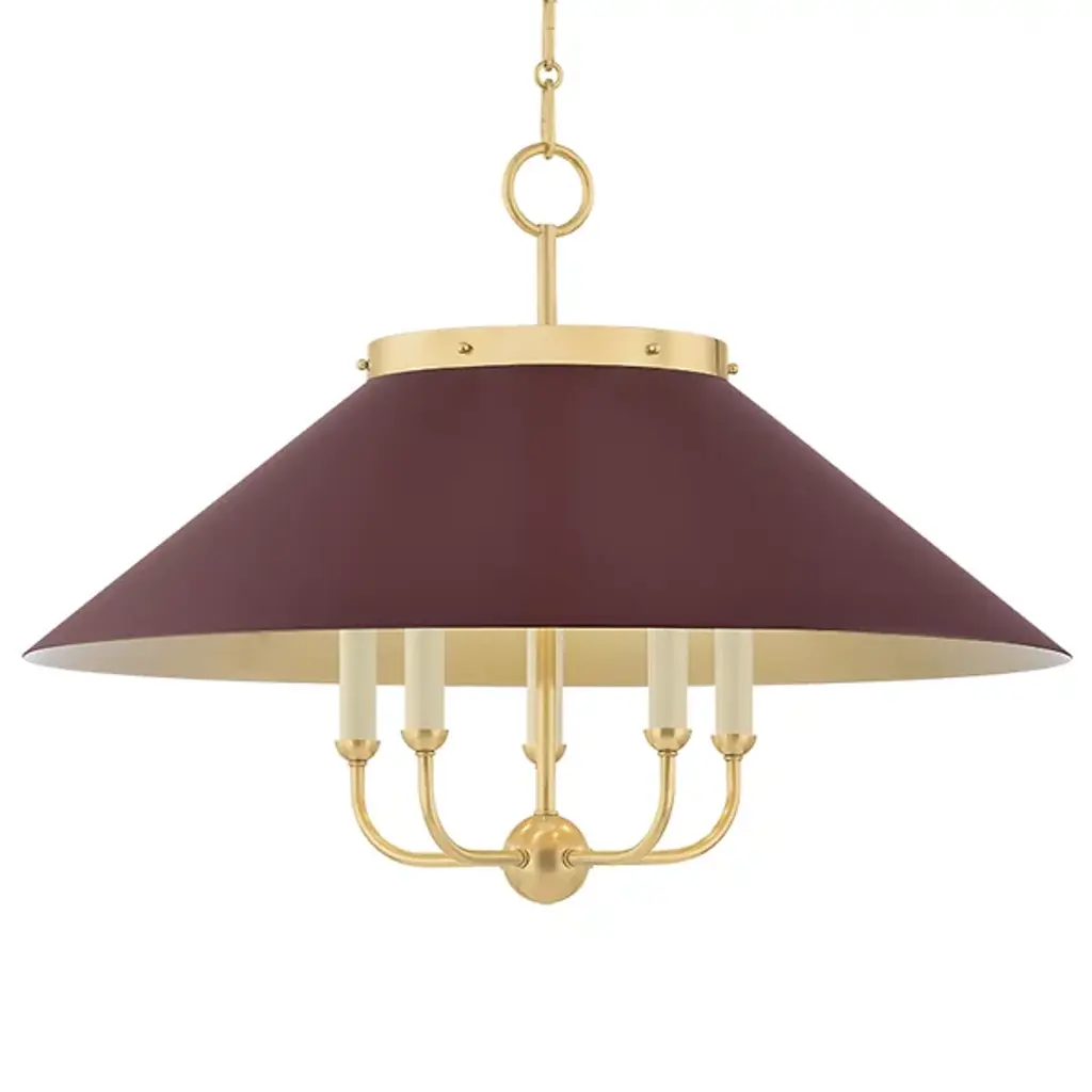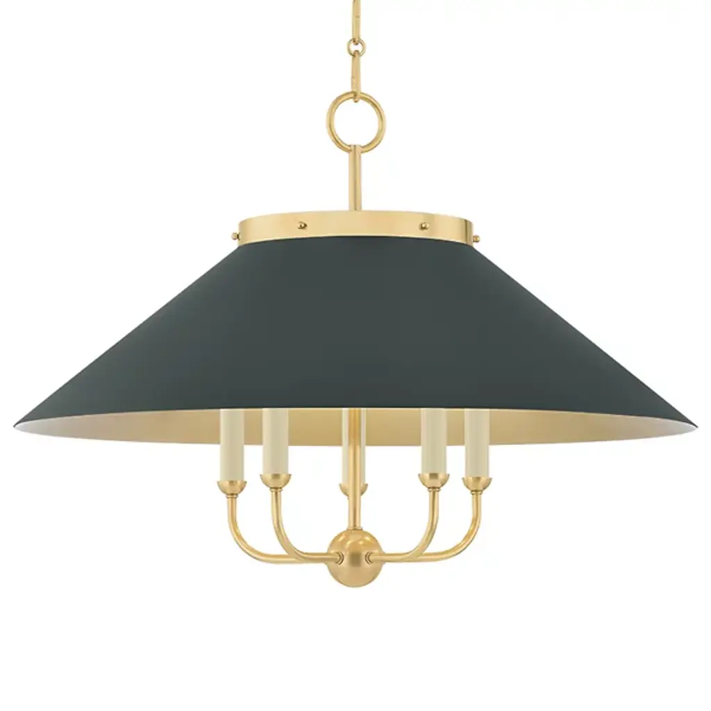 This classic metal shade design feels special with fresh finish combinations and sleek, heritage-inspired details. The contrastiing Aged Brass accents and modern gooseneck arm allow the pendants and sconce an updated, yet classic feel. The tapered shade over a five-light candelabra give the chandelier new traditional appeal. Each fixture features an Aged Brass or Polished Nickel shade that is metal on the inside and painted Off-White, Distressed Brass or Bird Blue on the outside. Part of our Mark D. Sikes collection.