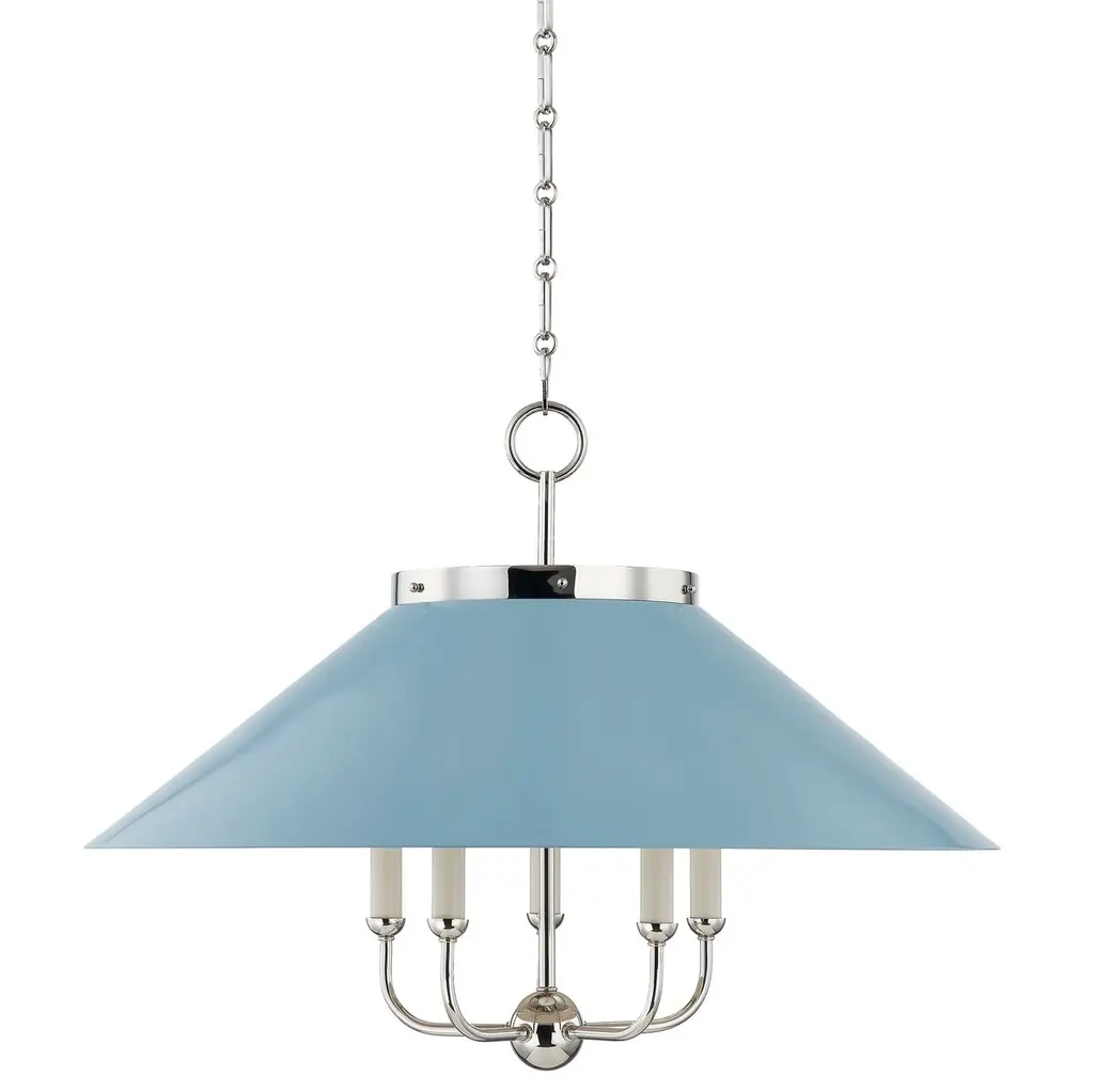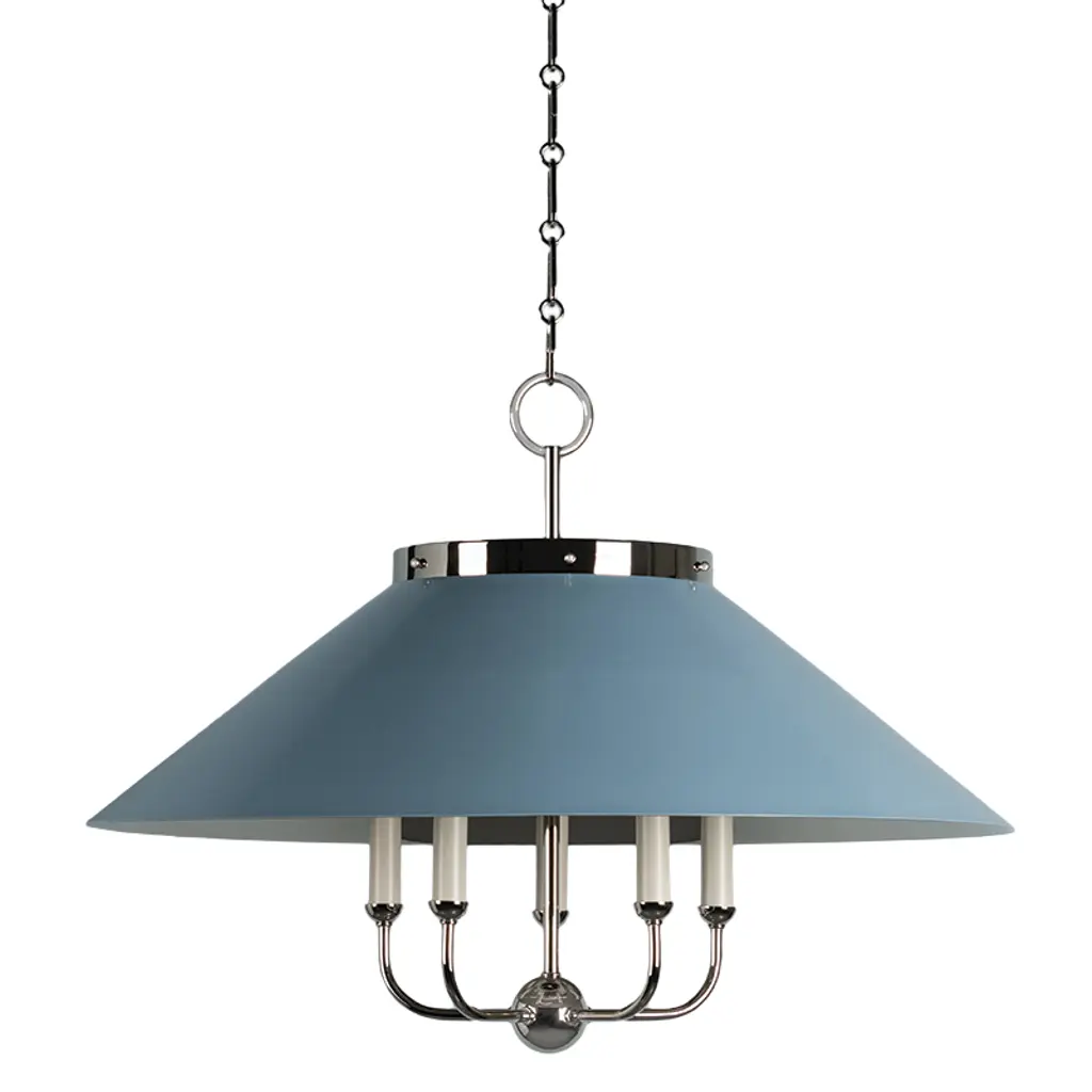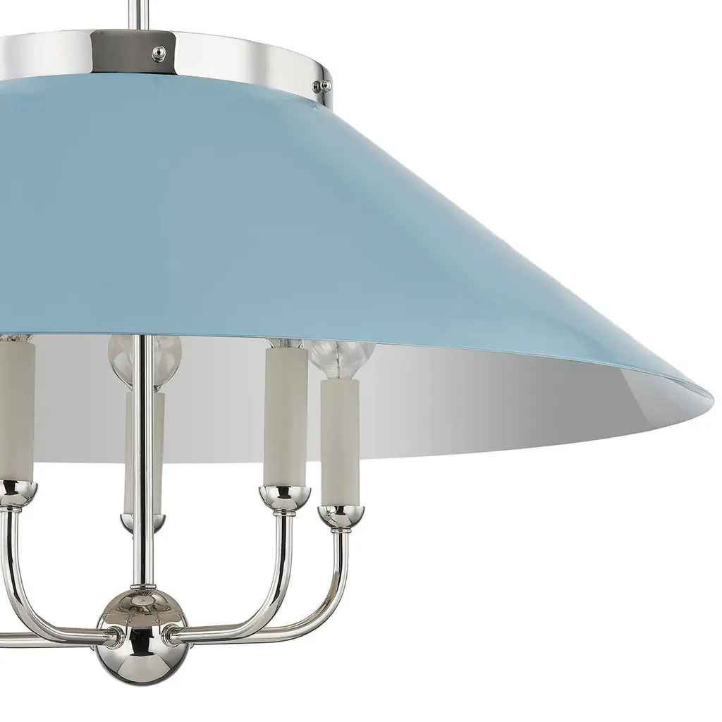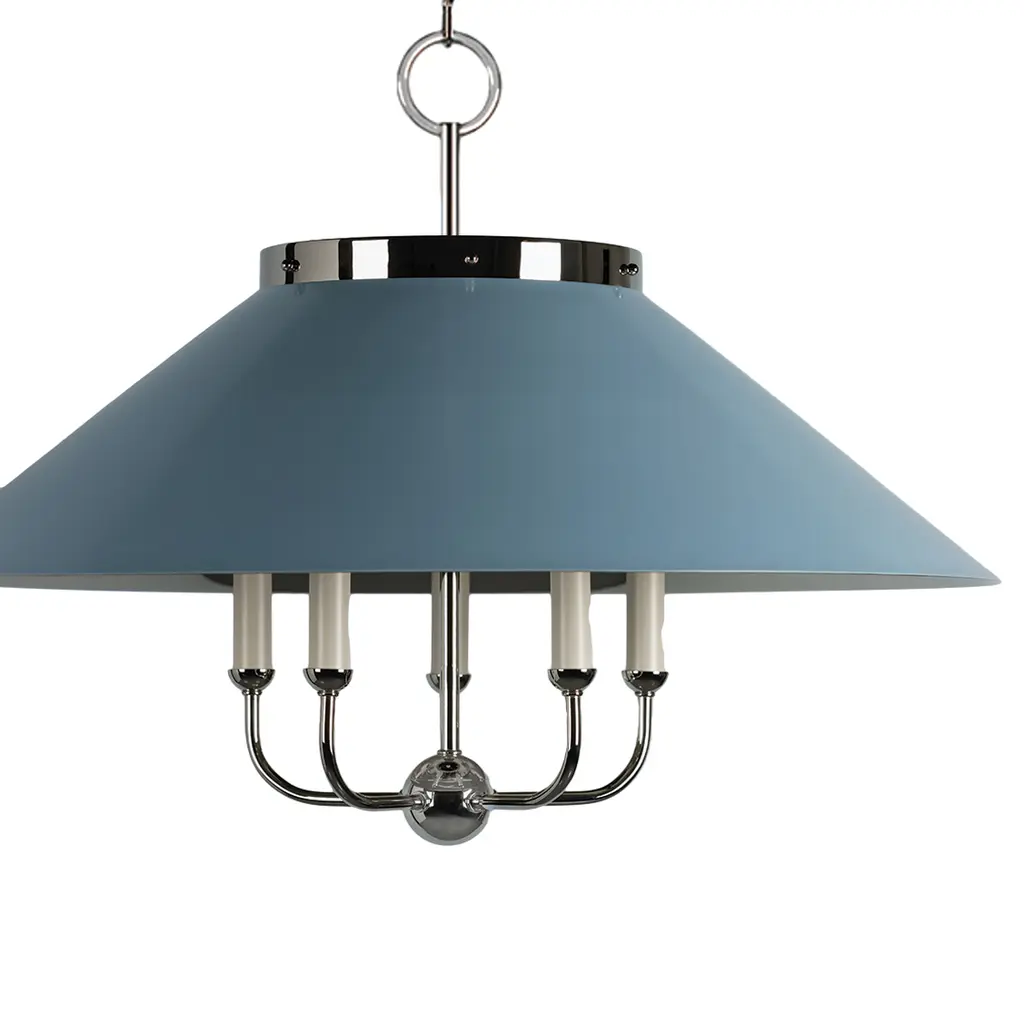 The contrasting finishes of the interior and exterior of the tapered metal shades bring contemporary chic to this otherwise classic five-arm chandelier.