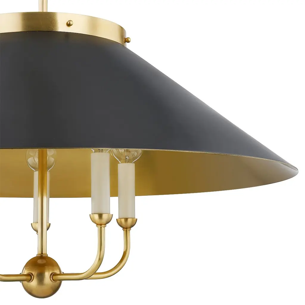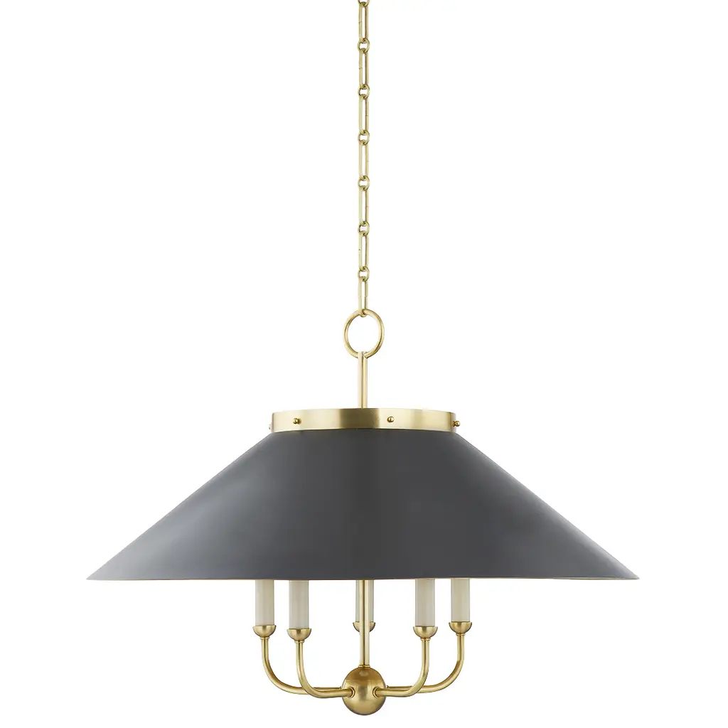 The contrasting finishes of the interior and exterior of the tapered metal shades bring contemporary chic to this otherwise classic five-arm chandelier.