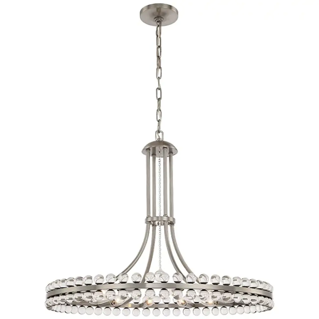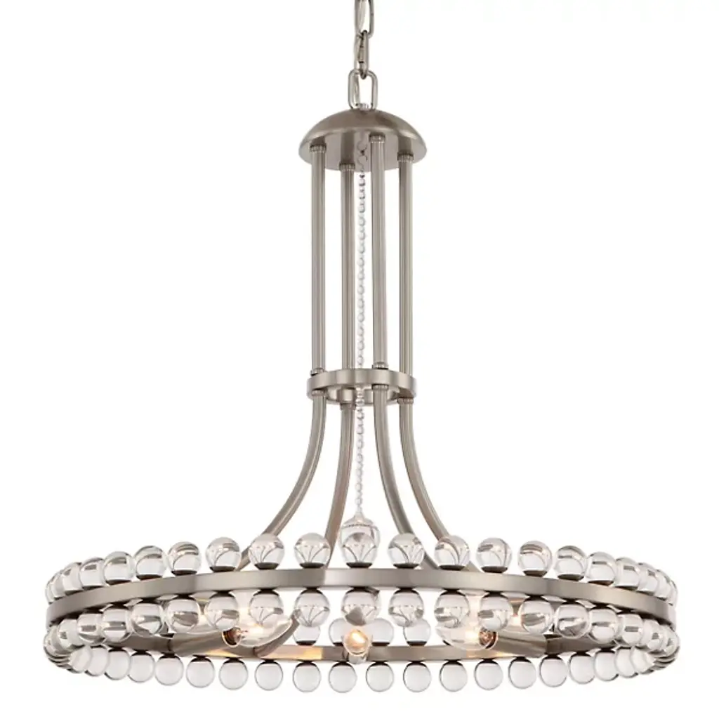 Elegant simplicity reaches peak perfection. The Clover Chandelier by Crystorama exudes class from every detail, showcasing gorgeous steel and glass sphere elements that allow the candelabra bulbs (not included) to illuminate a dining space or living room in a sophisticated manner. Multiple traditional-style finishes are also available, allowing design enthusiasts to establish a motif that corresponds to their discerning tastes.