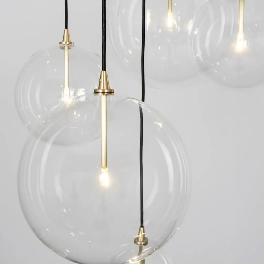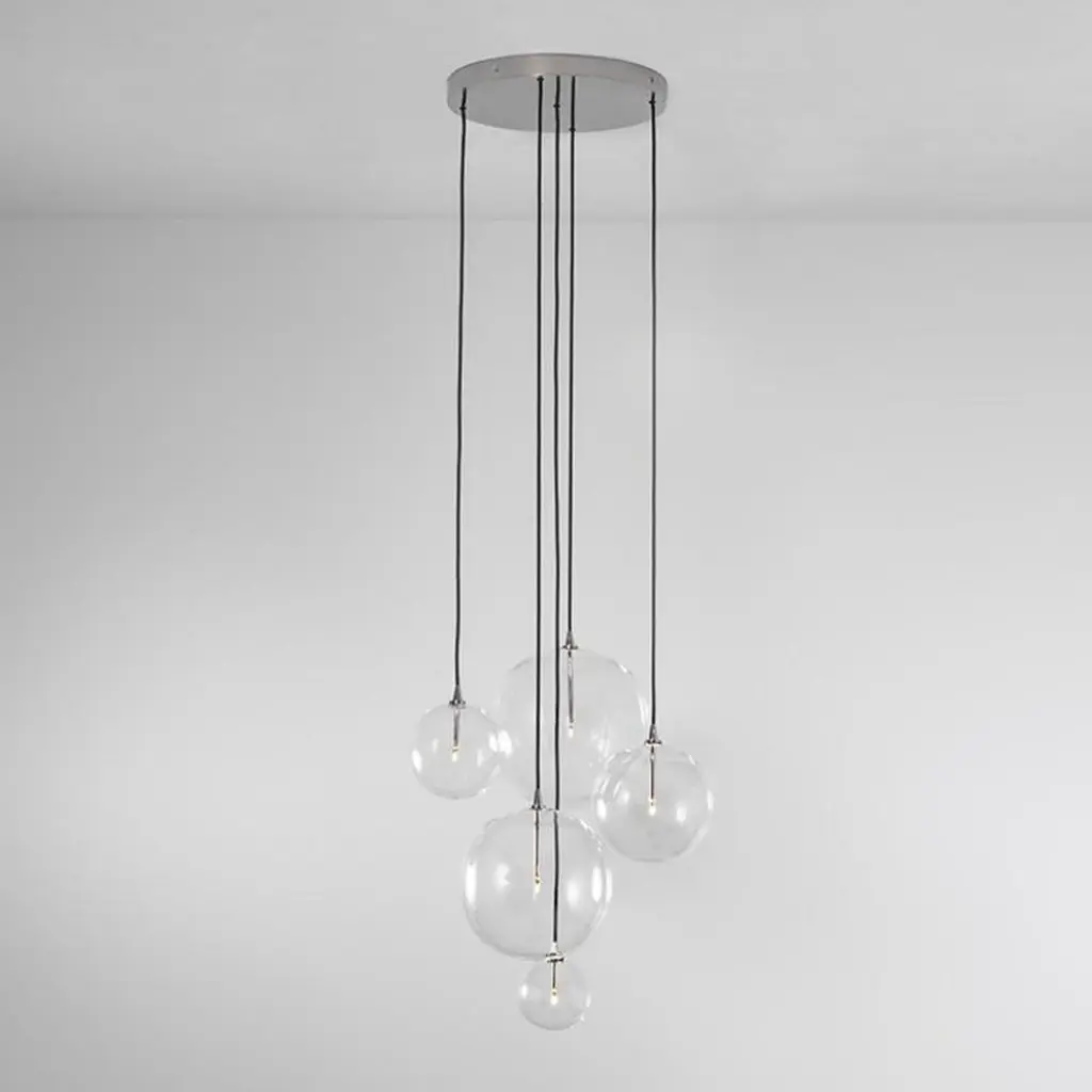 Polished nickel contemporary chandelier by SchwungDimensions: D 61.9 x W 71.9 x H 315 cm Base: diameter 45 cm Materials: solid brass, hand-blown glass globesFinish: polished nickelAvailable in finishes: natural brass or black gunmetal. Adjustable height (196 cm - 322.9 cm). All our lamps can be wired according to each country. If sold to the USA it will be wired for the USA for instance. Made entirely of solid brass and handblown glass globes. Could be dimmable. Schwung is a german word, and loosely defined, means energy or momentumm of a positive manner. Synonyms: Verve, zest, panache, momentum.Mission:Developing lighting fixtures through simple and timeless materials, sustainably; we are committed to creating quality products that last. Beginning with the design we are constantly refining aesthetic and function. Both in the lamps themselves and throughout the manufacturing process we pursue a holistic approach to efficiency, and the reduction of environmental impact.Concept:Schwung is a lighting concept, connecting aesthetic and quality through matter. An exploration of history, forms and function, elegantly fulfilling an essential need of modern life, capturing light. Our pieces play with architecture or create spaces of their own. Founded by Dominique sente (Belgium) and rudi nijssen, (Netherlands). What began as a curiosity for objects, a venture in collecting, curating and trading antiques-became a passion to create original designs.Process:From the beginning, schwung home has striven for cutting-edge and quality lighting, handcrafted in Europe. Emphasizing brass and glass, which are not only durable but can be reused indefinitely, our lamps are 98% recyclable. Today the company operates out of an integrated design and manufacturing facility in Poland. This local approach allows us to significantly shorten the product lead time and greatly improve quality standards.All our lamps can be wired according to each country. If sold to the USA it will be wired for the USA for instance.