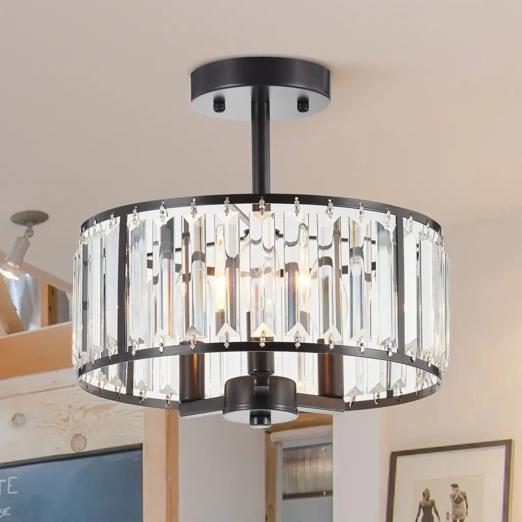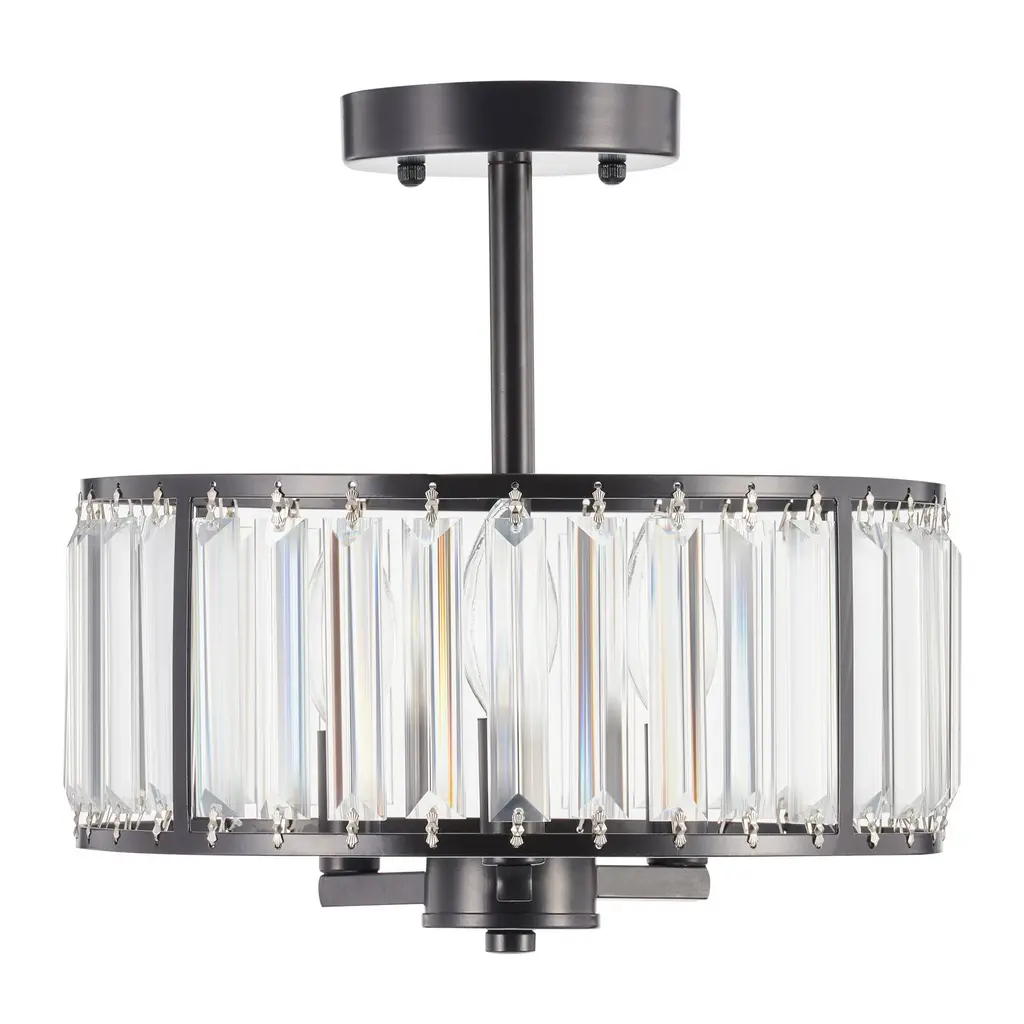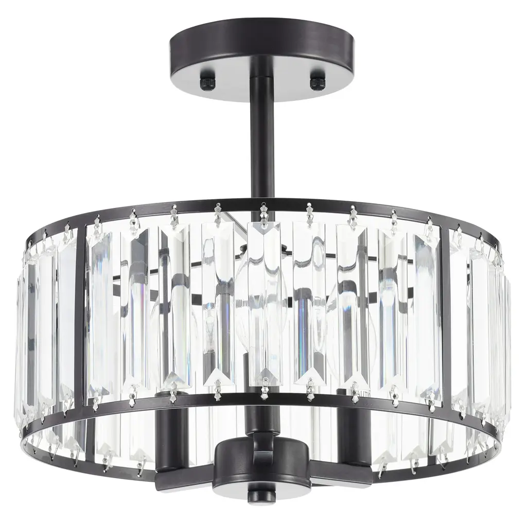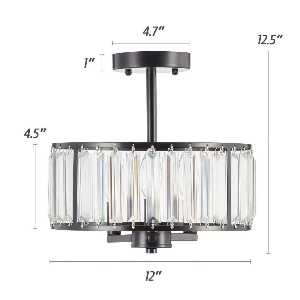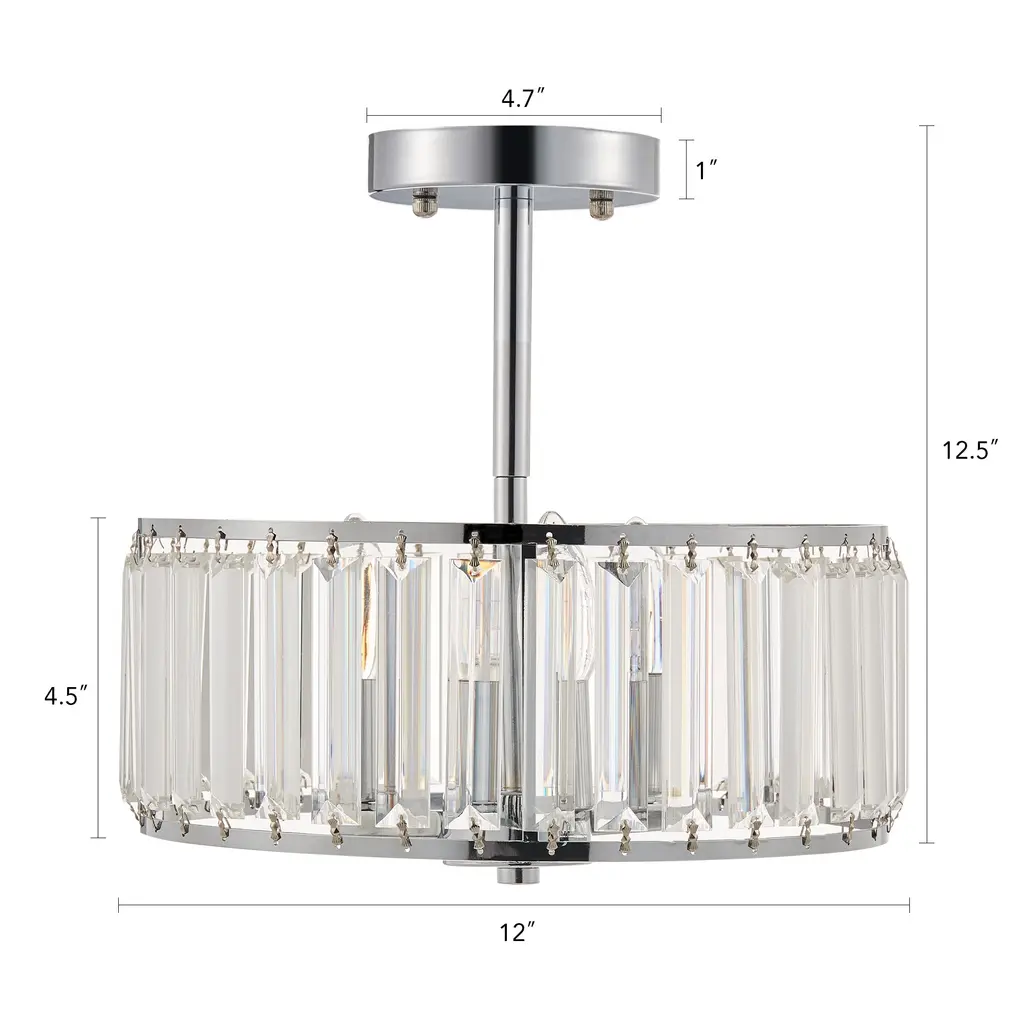Elevate your home decor with this exquisite CO-Z 12" Modern 3-Light Crystal Semi Flush Mount Chandelier with Drum Shade. The angular crystal prism rods forming the drum shade of this semi flush mount ceiling light fixture will add a touch of glamour and sparkle to any room, while the chrome/bronze finish provides corrosion-proof performance. This crystal ceiling light is versatile and can be dimmed or brightened as per your preference, making it ideal for any occasion or mood. The installation process is quick and easy with the crystal chandelier being compatible with most home decors.Features:Specifications: