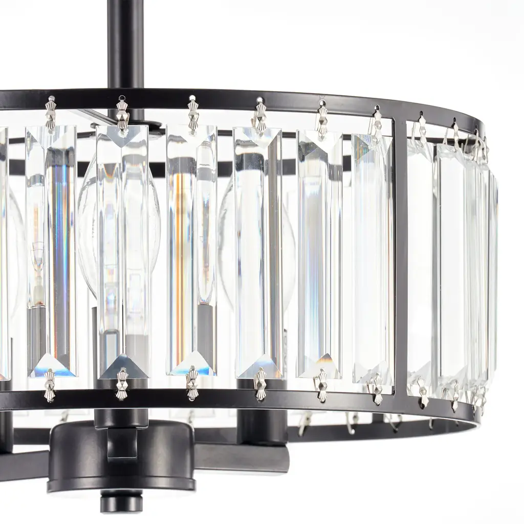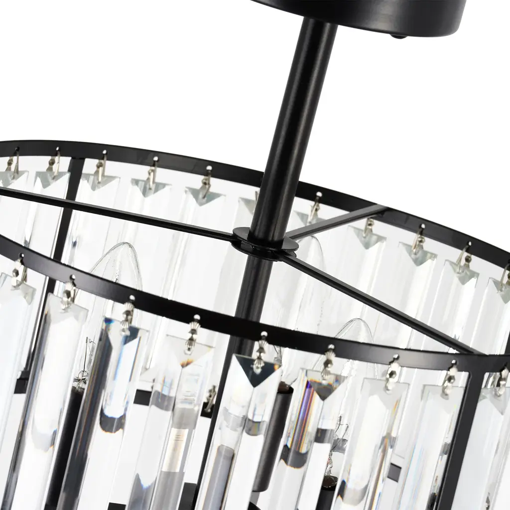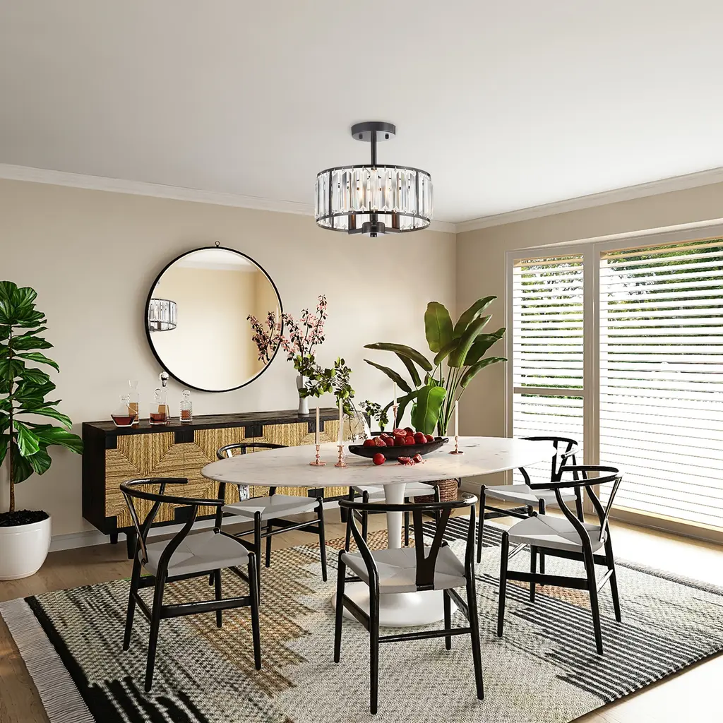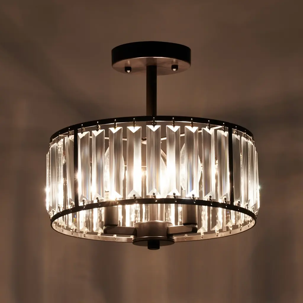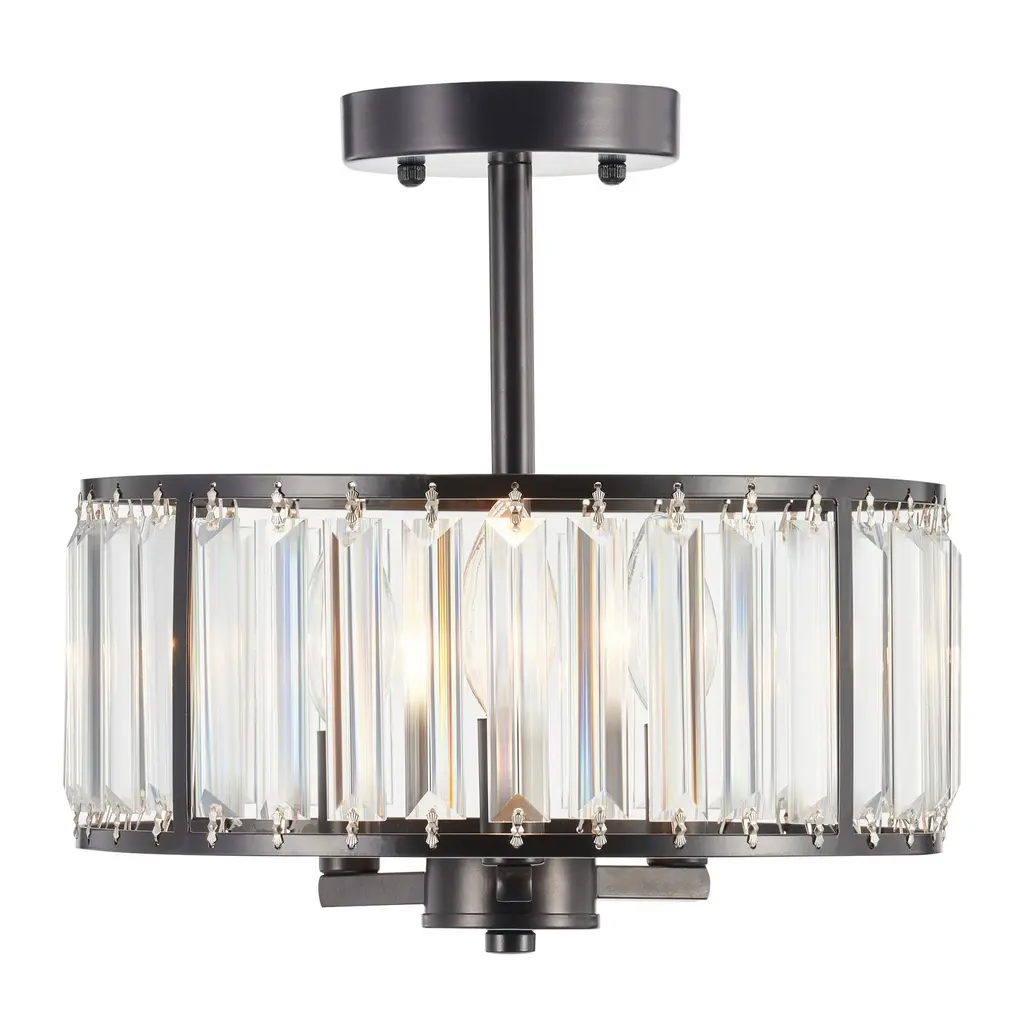 Elevate your home decor with this exquisite CO-Z 12" Modern 3-Light Crystal Semi Flush Mount Chandelier with Drum Shade. The angular crystal prism rods forming the drum shade of this semi flush mount ceiling light fixture will add a touch of glamour and sparkle to any room, while the chrome/bronze finish provides corrosion-proof performance. This crystal ceiling light is versatile and can be dimmed or brightened as per your preference, making it ideal for any occasion or mood. The installation process is quick and easy with the crystal chandelier being compatible with most home decors.Features:Specifications: