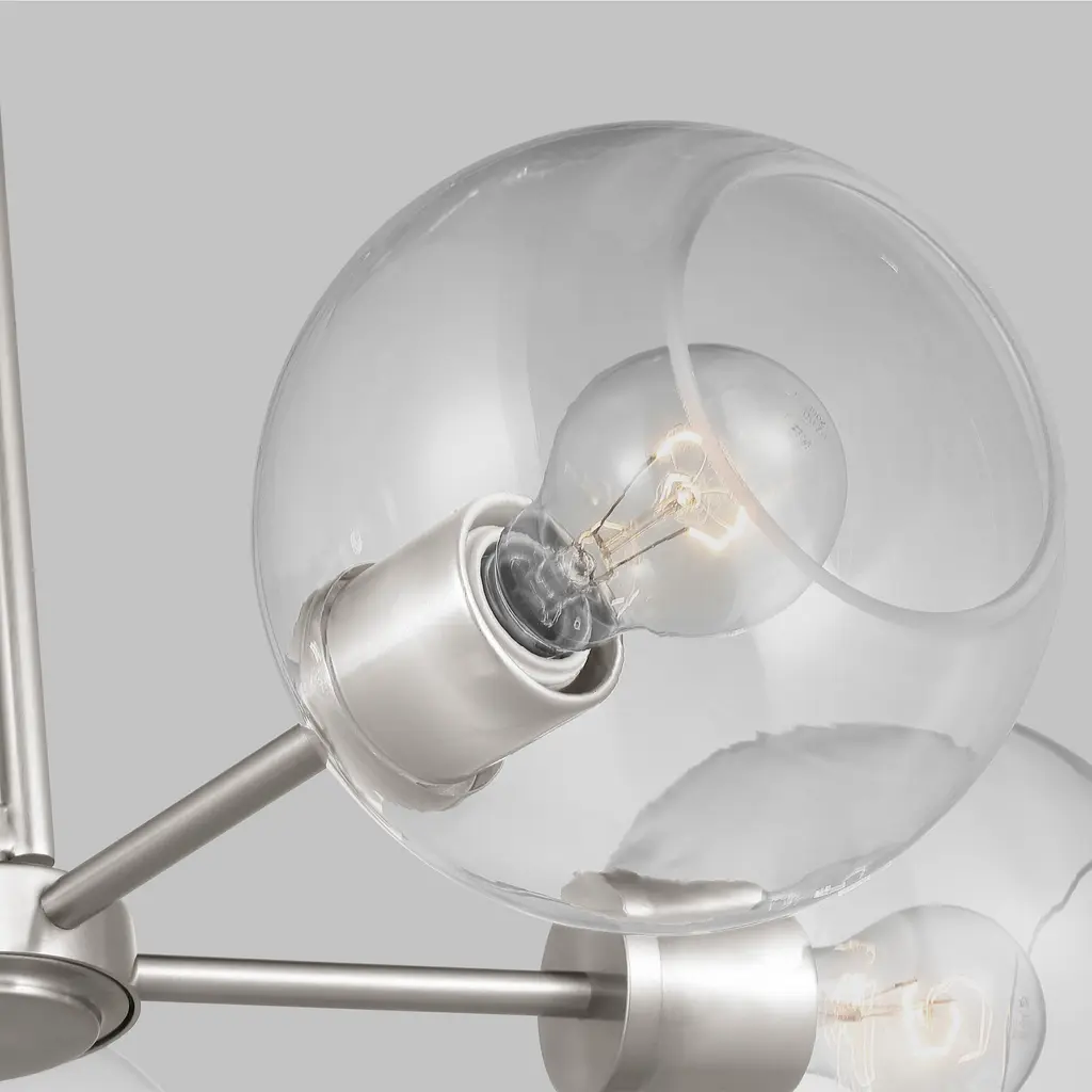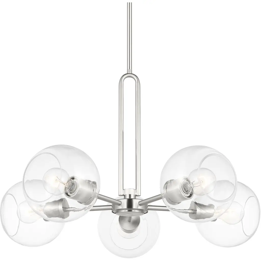 The Codyn five light single tier chandelier in brushed nickel silver is a contemporary take on a classic mid-century design. Clear glass shades with open-ended spheres accent the elongated keyhole strap detail, for a clean look. This minimalist collection relies on subtle details to create visual interest?
