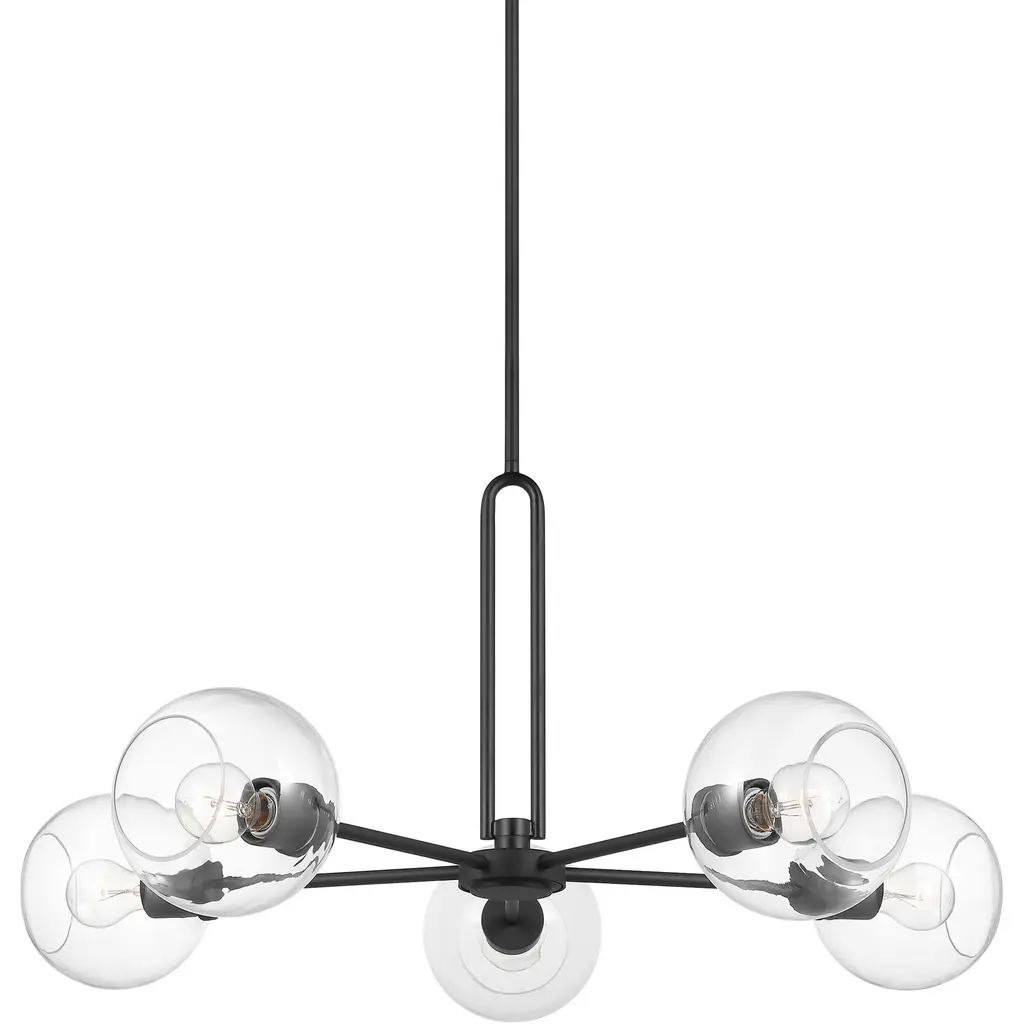 The Codyn five light single tier chandelier in Midnight Black is a contemporary take on a classic mid-century design. Clear glass shades with open-ended spheres accent the elongated keyhole strap detail, for a clean look. This minimalist collection relies on subtle details to create visual interest?