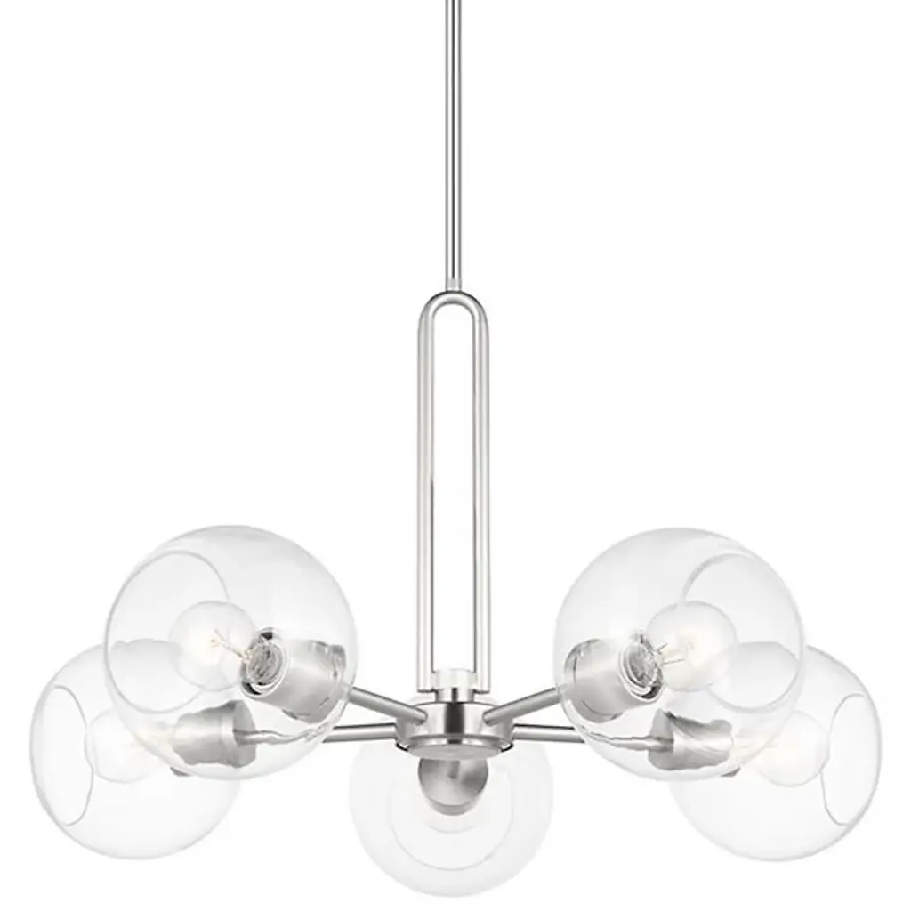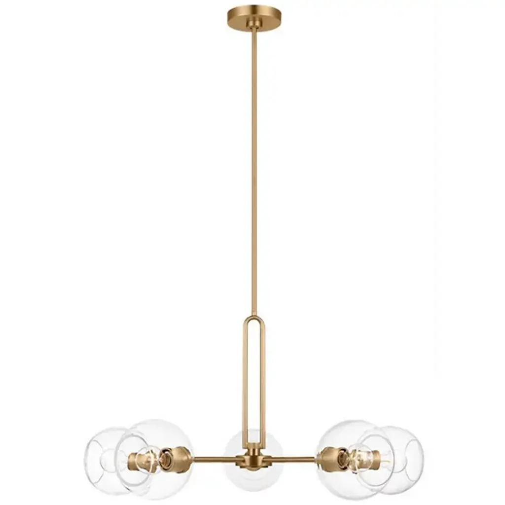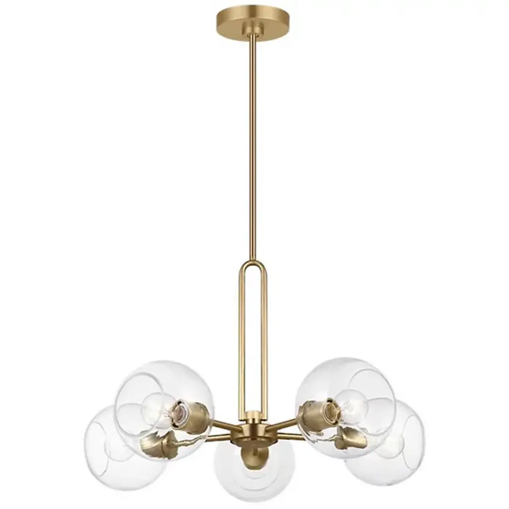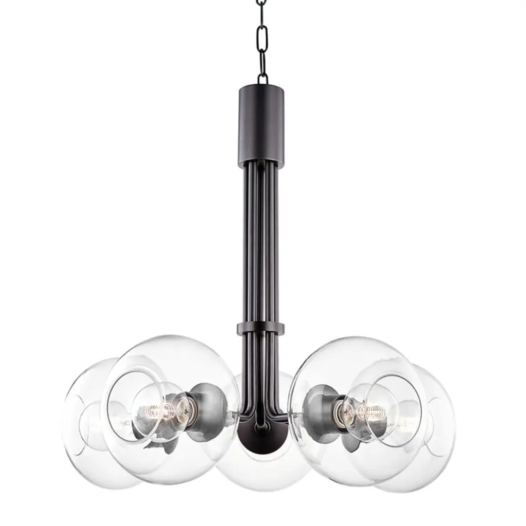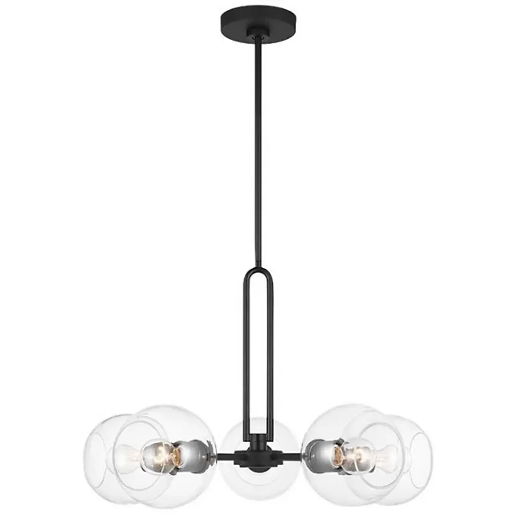 Capture the old with the new as stunning clear glass globe shades create a gorgeous glow. The Codyn Chandelier from Visual Comfort Studio, formerly known as Sea Gull Lighting, features a five-light single-tier chandelier in a contemporary take on a classic mid-century design. Clear glass shades with open-ended spheres accent the elongated keyhole strap detail for a clean look. This minimalist fixture relies on subtle details to create visual interest.