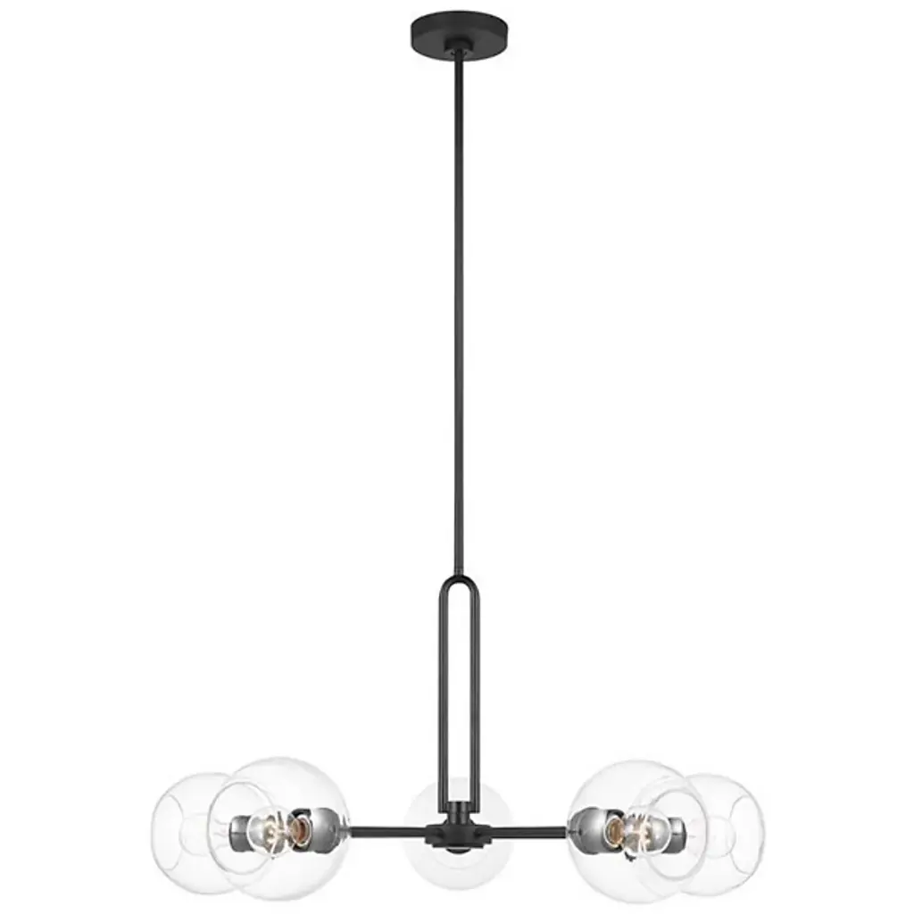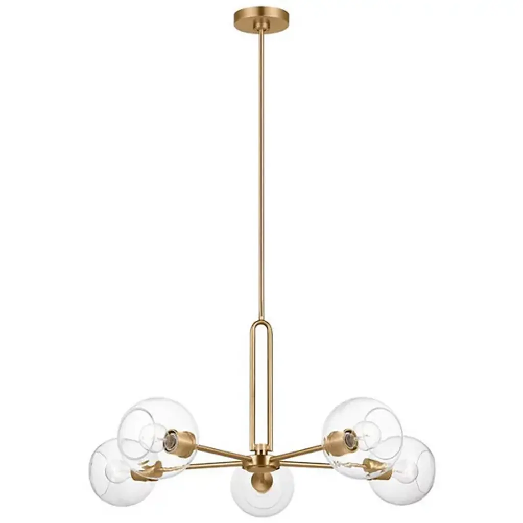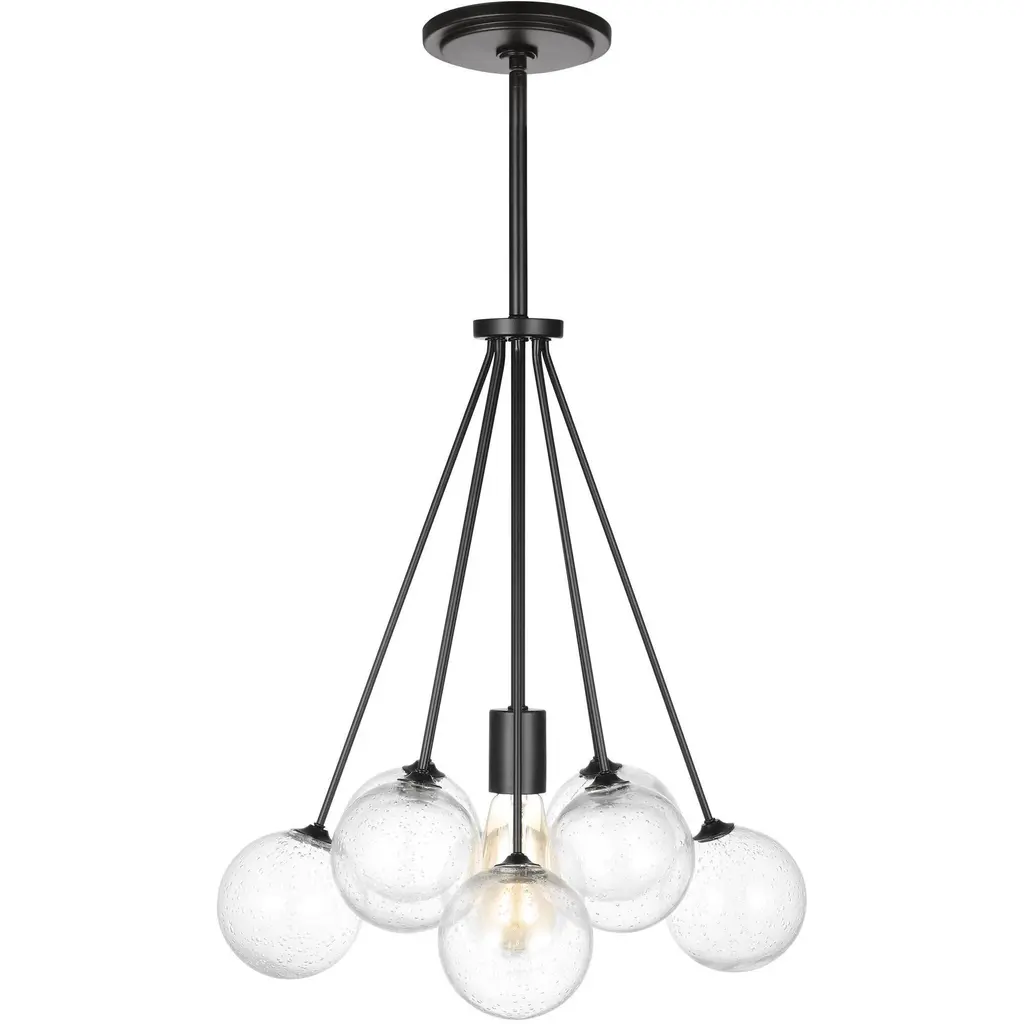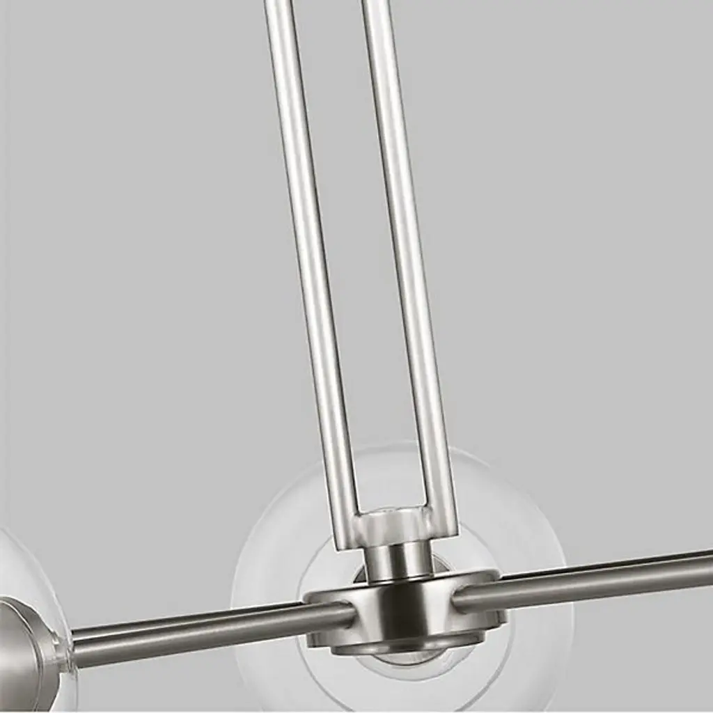 Capture the old with the new as stunning clear glass globe shades create a gorgeous glow. The Codyn Chandelier from Visual Comfort Studio, formerly known as Sea Gull Lighting, features a five-light single-tier chandelier in a contemporary take on a classic mid-century design. Clear glass shades with open-ended spheres accent the elongated keyhole strap detail for a clean look. This minimalist fixture relies on subtle details to create visual interest.