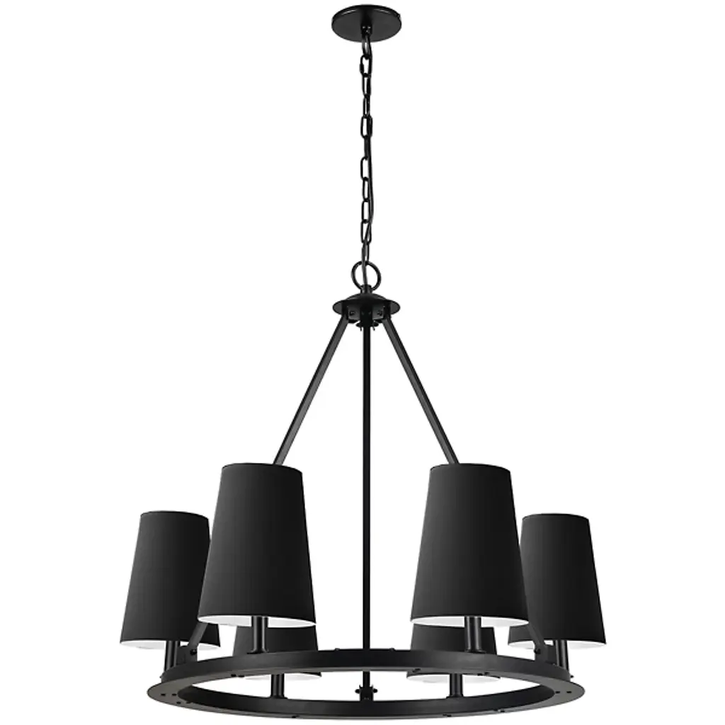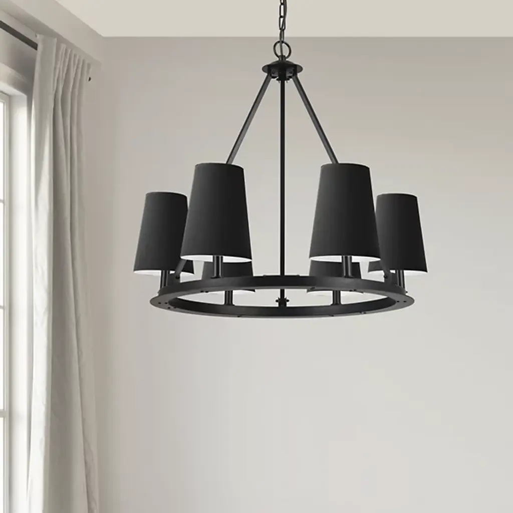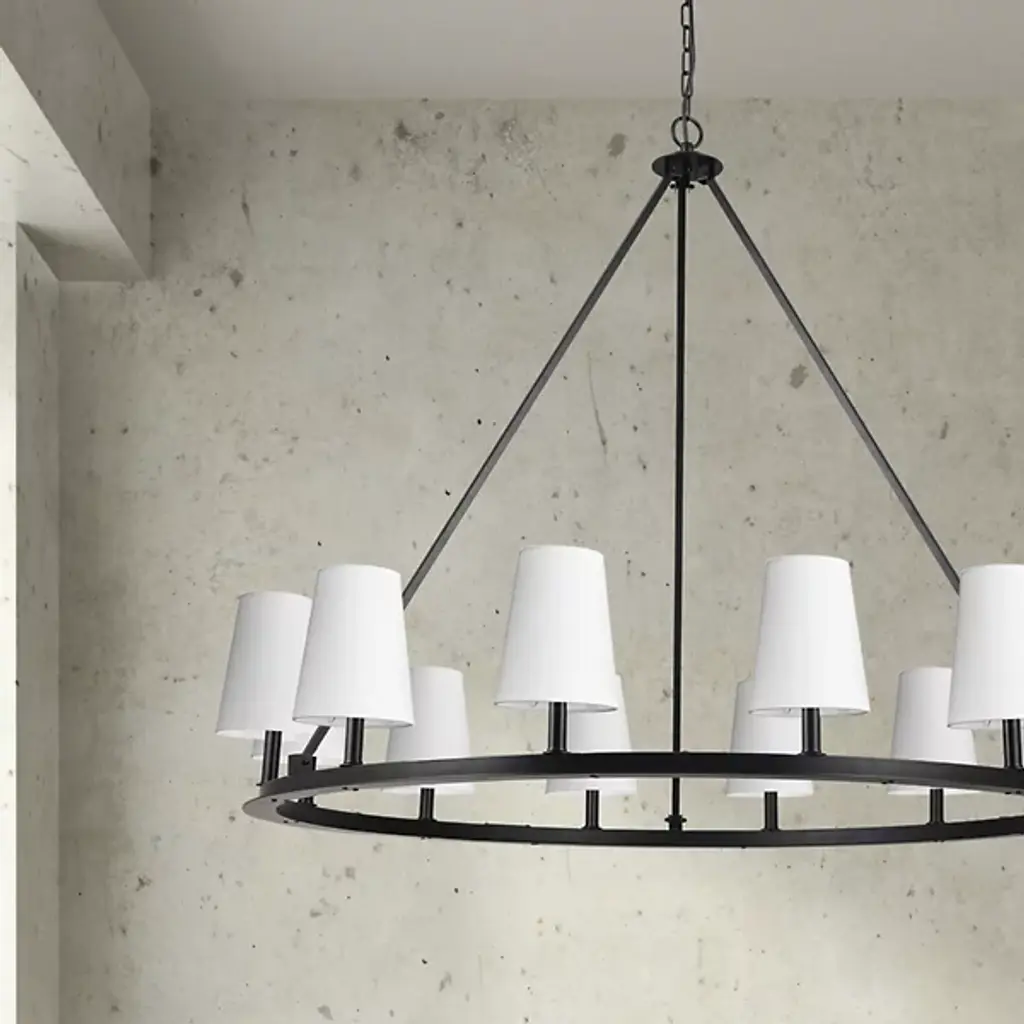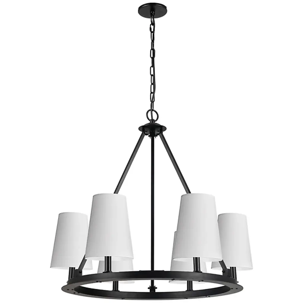 The Colby Chandelier by Dainolite is a rustic lighting design with a soft side, making it a great option for transitional spaces. Its main structure is a metal ring with 3 angled rods that connect to a sloped ceiling-friendly chain suspension. Each light around the ring is adorned with a flared fabric shade. In addition to the softening effect the shades have to the overall design, they gently diffuse the light created by the bulbs within.