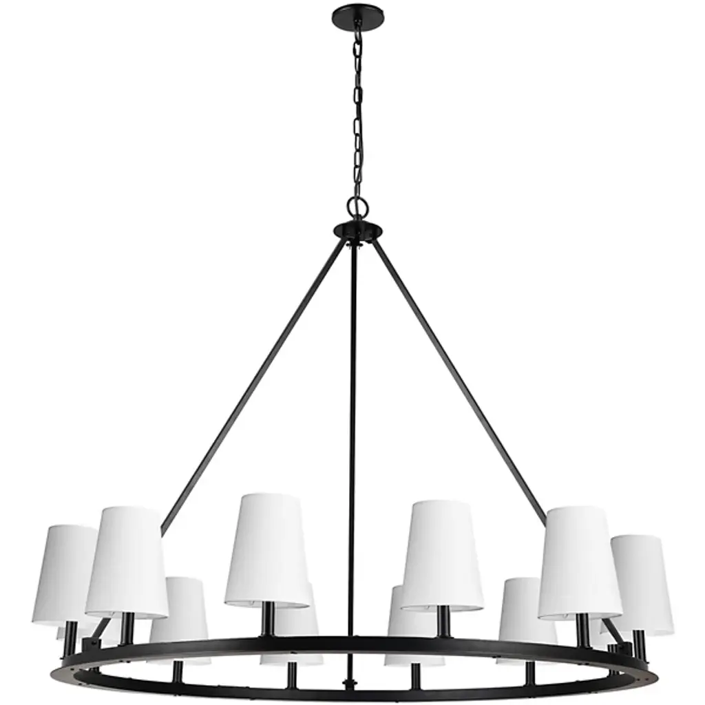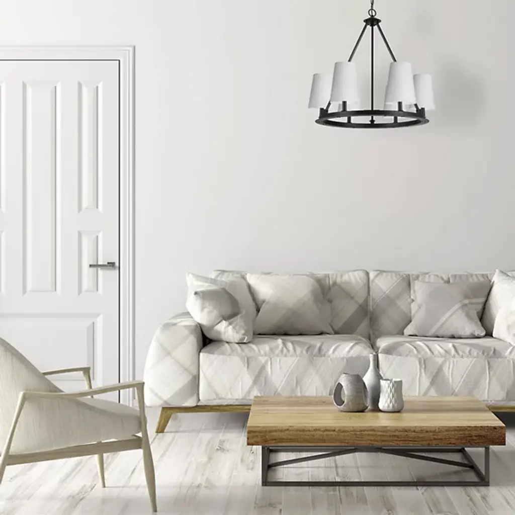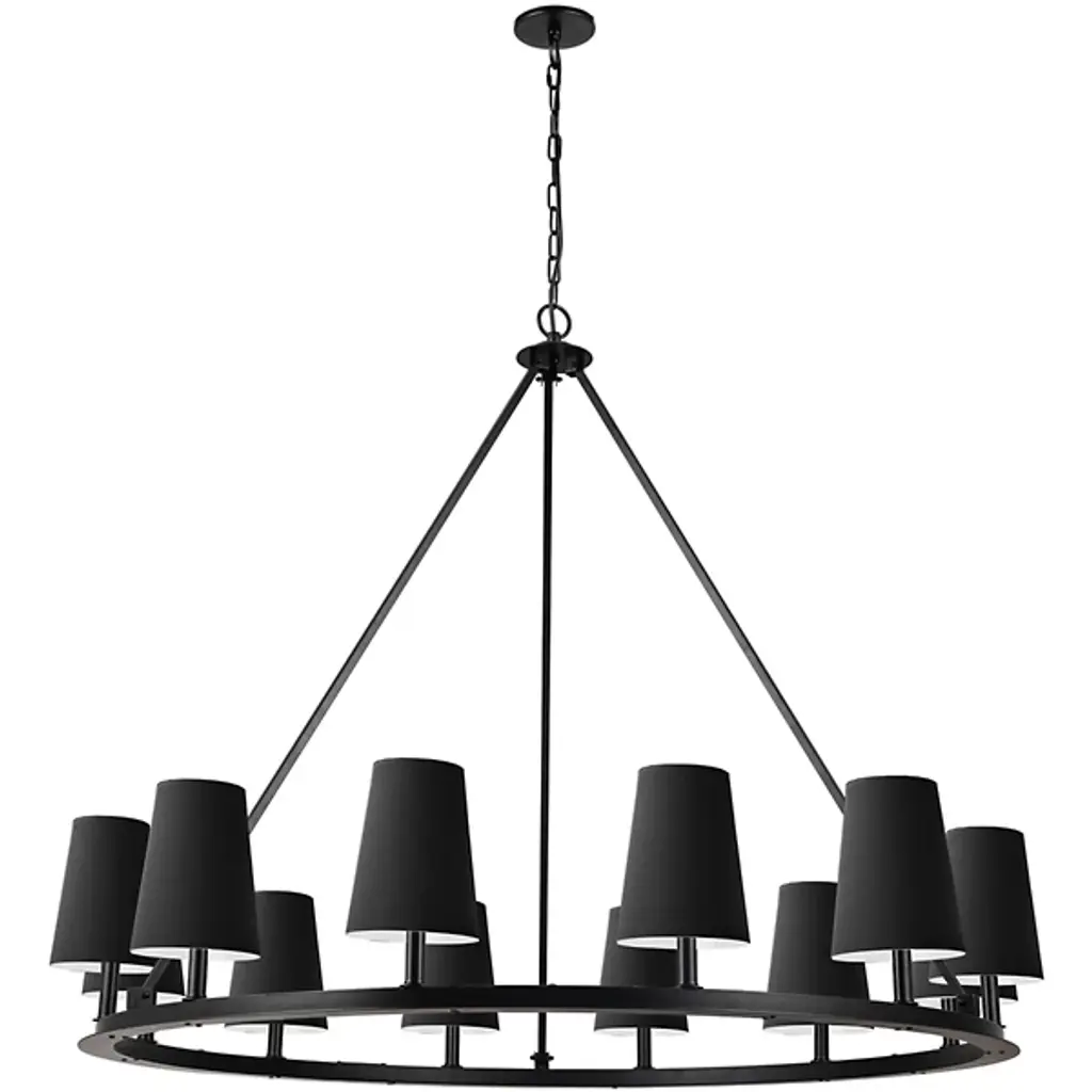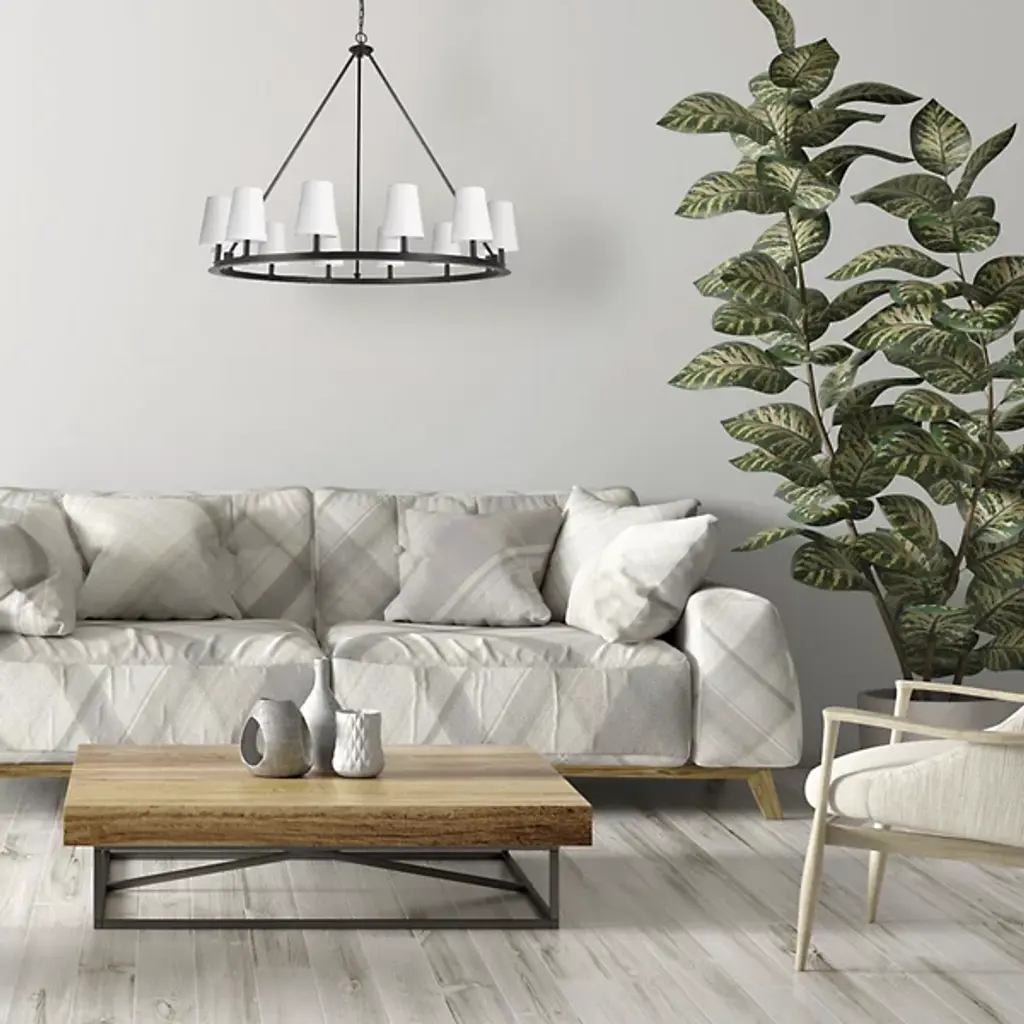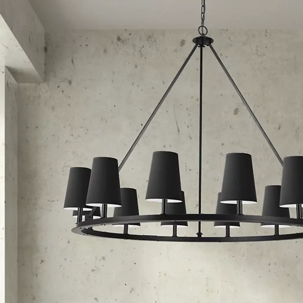 The Colby Chandelier by Dainolite is a rustic lighting design with a soft side, making it a great option for transitional spaces. Its main structure is a metal ring with 3 angled rods that connect to a sloped ceiling-friendly chain suspension. Each light around the ring is adorned with a flared fabric shade. In addition to the softening effect the shades have to the overall design, they gently diffuse the light created by the bulbs within.