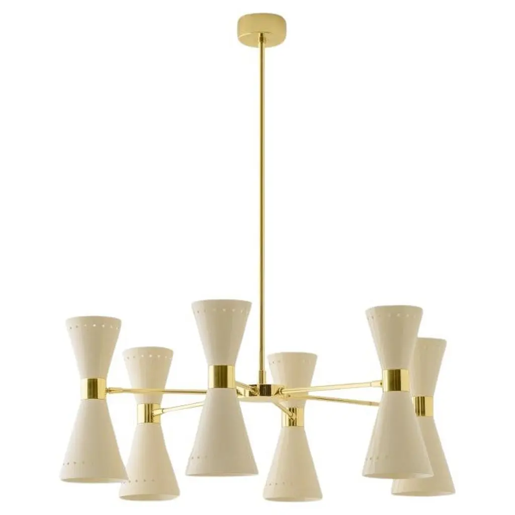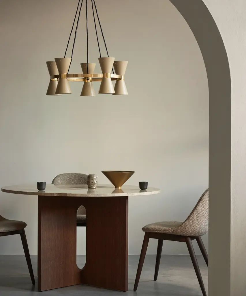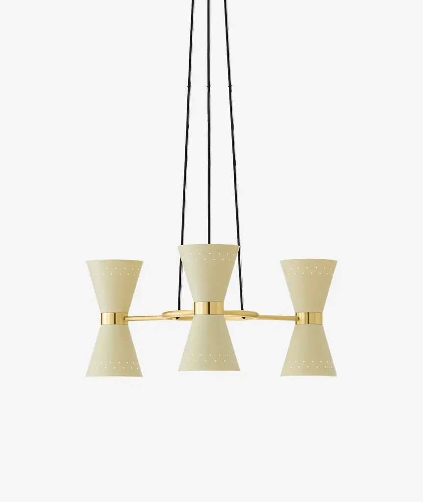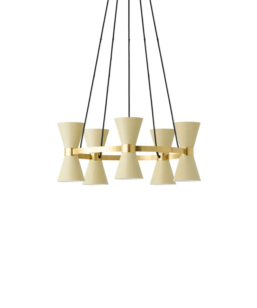 One of three light fixtures created in the 1950s by Swedish designer Alf Svensson, the Chandelier 5 presents a statement-making mid-century aesthetic. Its band of solid brass holds ten geometric metal shades that direct light both upward and downward. Small perforations in the shades allow further light to shine through. Its timeless look, typical of the Scandinavian Modern period in which it was designed, lends itself to any setting, making it equally at home as an illuminating feature in a public or private space. Designed by Alf Svensson for Audo Copenhagen North America.