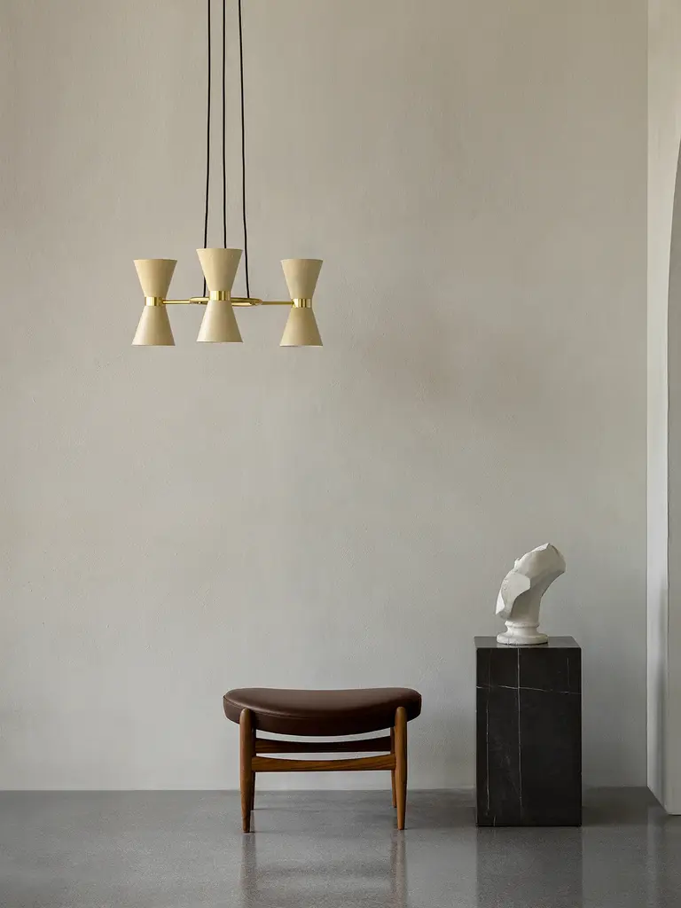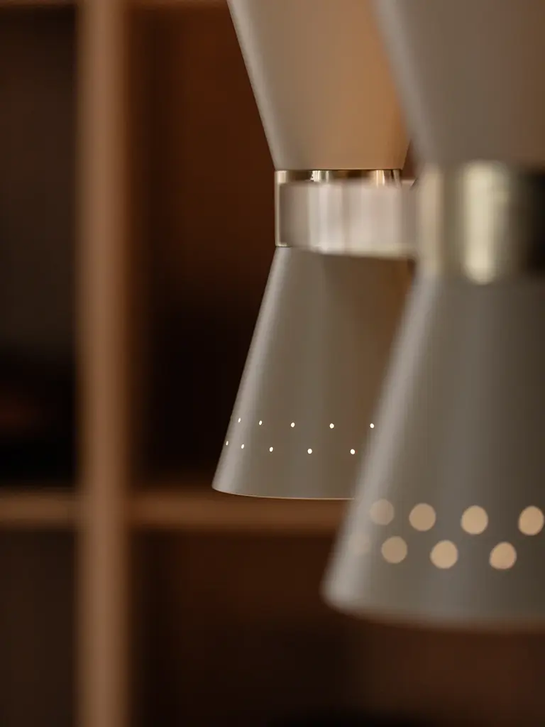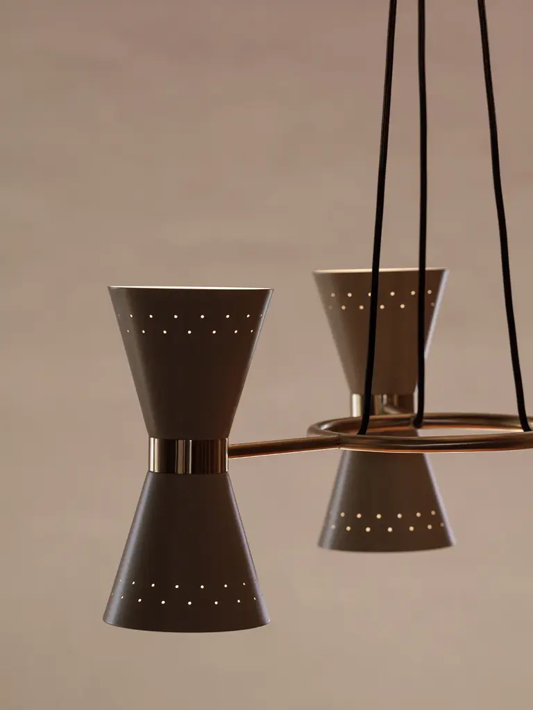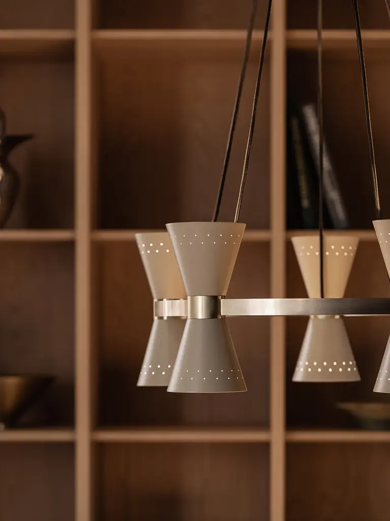 Bulbs not included. Imagined by the industrious Swedish furniture designer Alf Svensson in the 1950s, Chandelier 3 is one of three lighting designs in the Collector series. Shaped from a central band of solid brass, six conical metal shades direct the light upwards and downwards to illuminate with ambient light. Small perforations in each shade disperse the light outwards, creating intriguing shadows. The sophisticated mid-century design has timeless appeal thanks to its considered combination of graphic beauty and classic elegance. Not only functional, it is also a decorative lighting fixture in any space. One of three light fixtures created in the 1950s by Swedish designer Alf Svensson, the Chandelier 5 presents a statement-making mid-century aesthetic. Its band of solid brass holds ten geometric metal shades which direct light both upward and downward. Small perforations in the shades allow further light to shine through. Its timeless look, typical of the Scandinavian Modern period in which it was designed, lends itself to any setting, making it equally at home as an illuminating feature in a public or private space.
