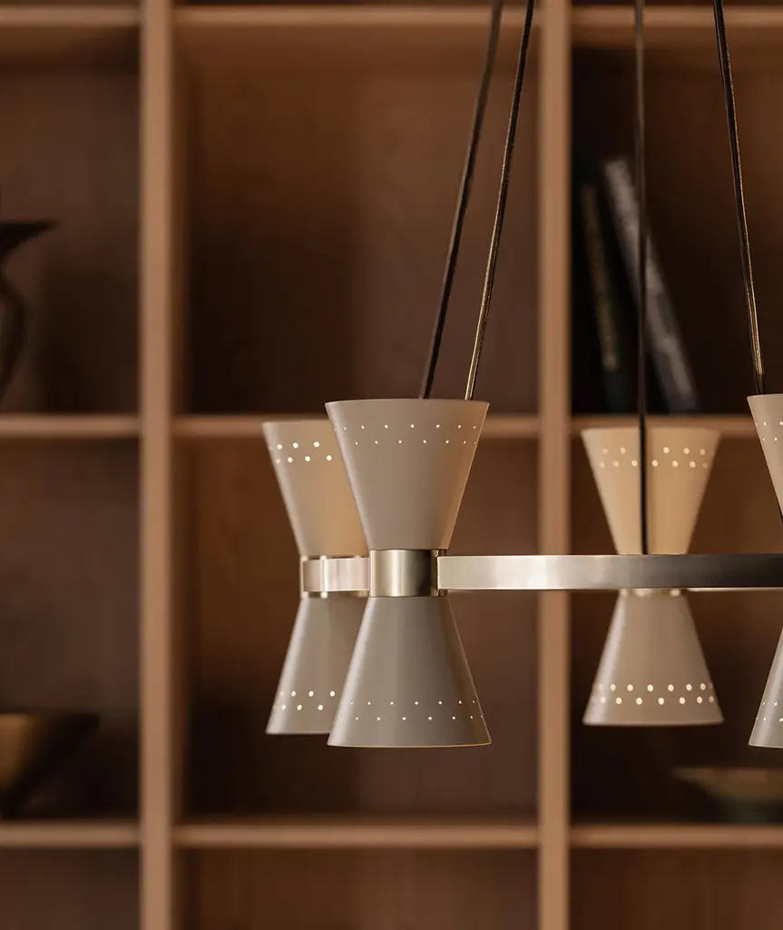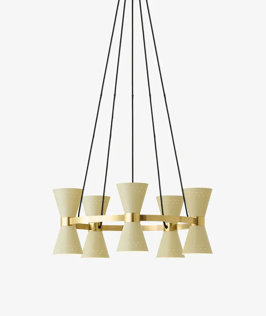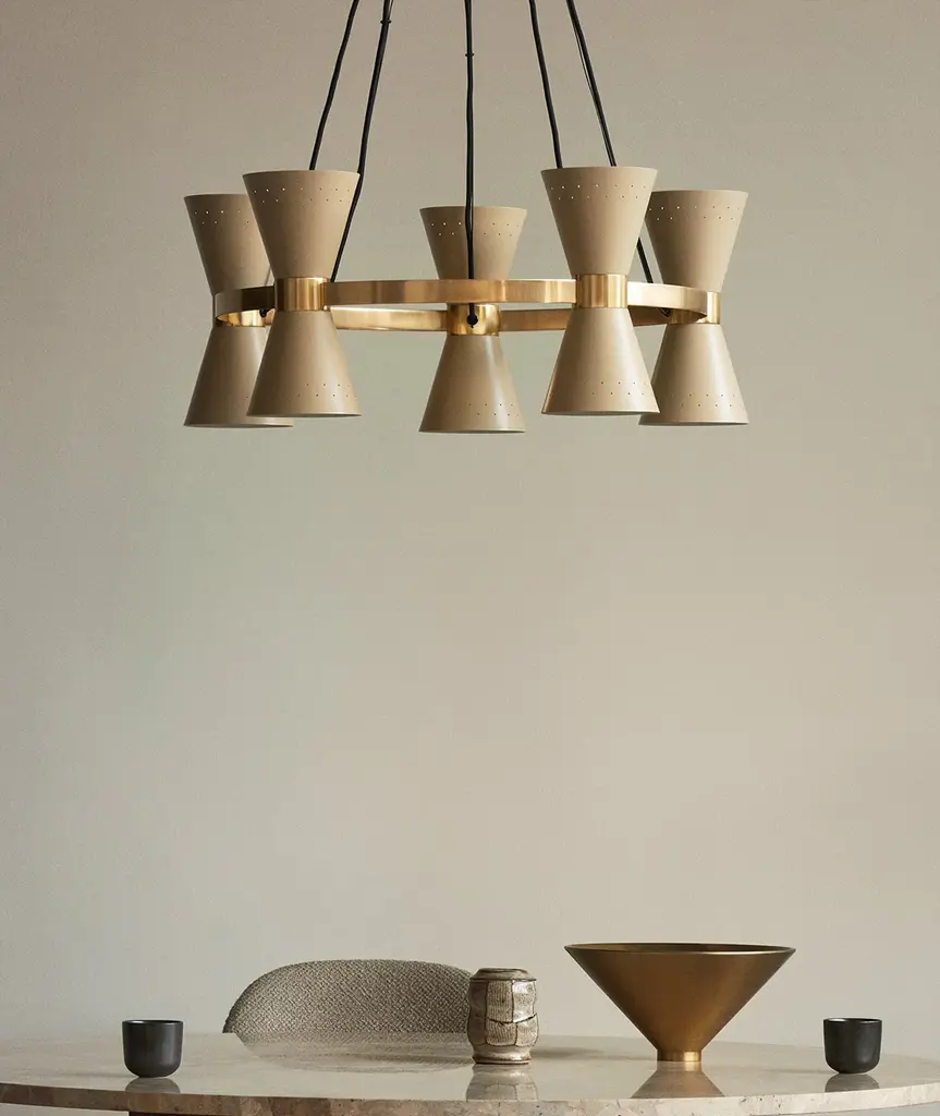 Imagined by the industrious Swedish furniture designer Alf Svensson in the 1950s, Chandelier 3 is one of three lighting designs in the Collector series. Shaped from a central band of solid brass, six conical metal shades direct the light upwards and downwards to illuminate with ambient light. Small perforations in each shade disperse the light outwards, creating intriguing shadows. The sophisticated mid-century design has timeless appeal thanks to its considered combination of graphic beauty and classic elegance. Not only functional, it is also a decorative lighting fixture in any space. One of three light fixtures created in the 1950s by Swedish designer Alf Svensson, the Chandelier 5 presents a statement-making mid-century aesthetic. Its band of solid brass holds ten geometric metal shades which direct light both upward and downward. Small perforations in the shades allow further light to shine through. Its timeless look, typical of the Scandinavian Modern period in which it was designed, lends itself to any setting, making it equally at home as an illuminating feature in a public or private space.